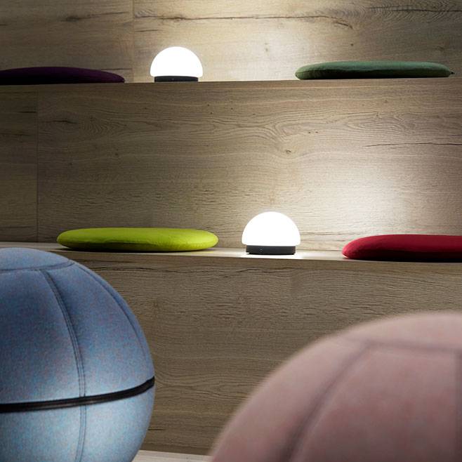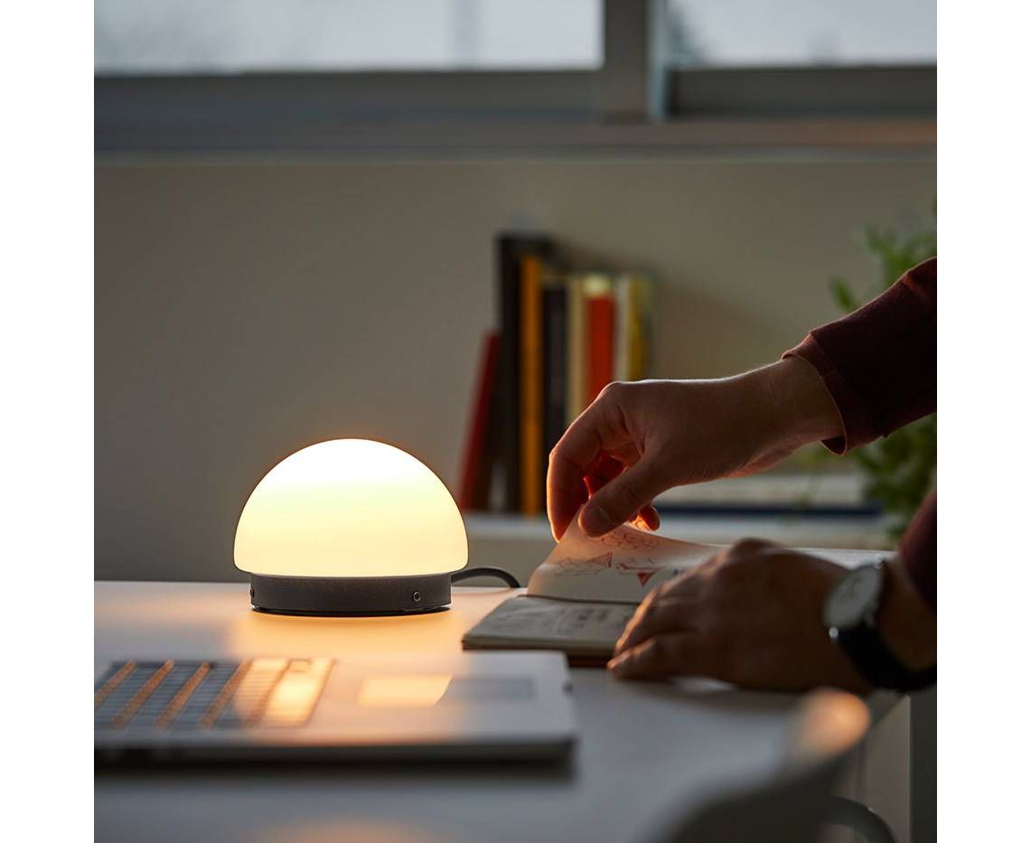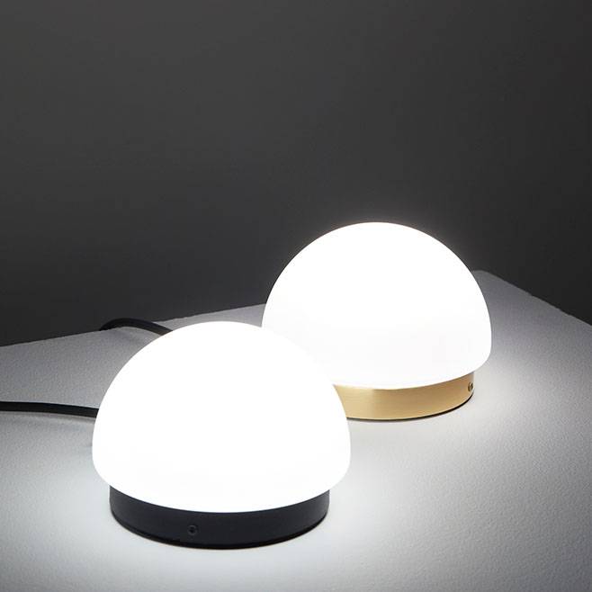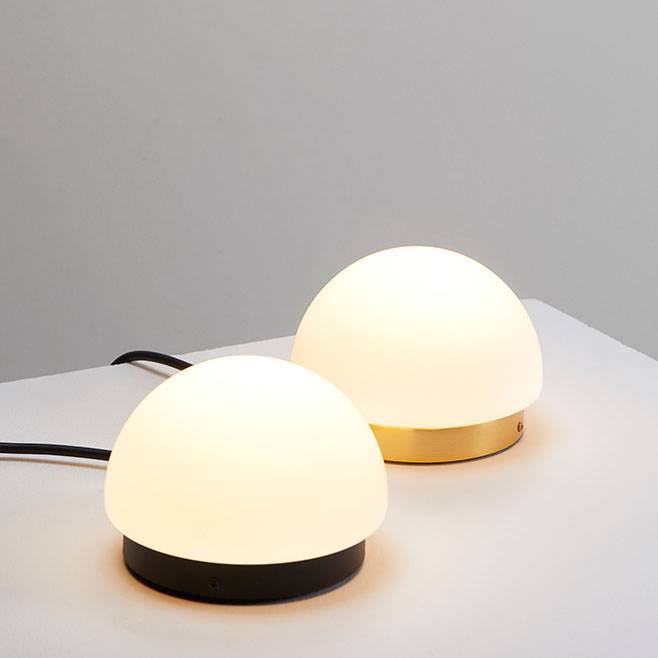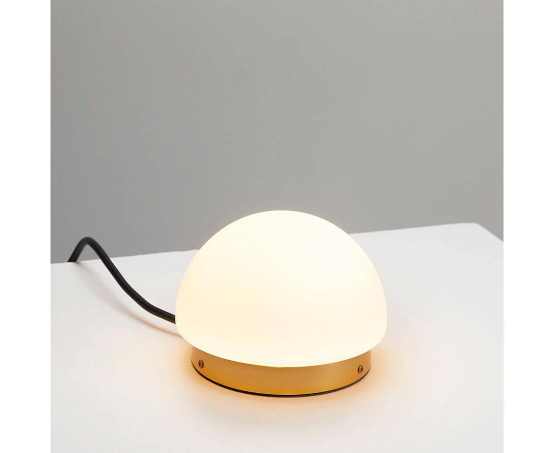 Металлическая настольная лампа с абажуром из атласного стекла, обеспечивающая прямой и непрямой свет.