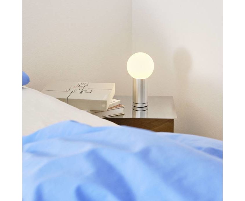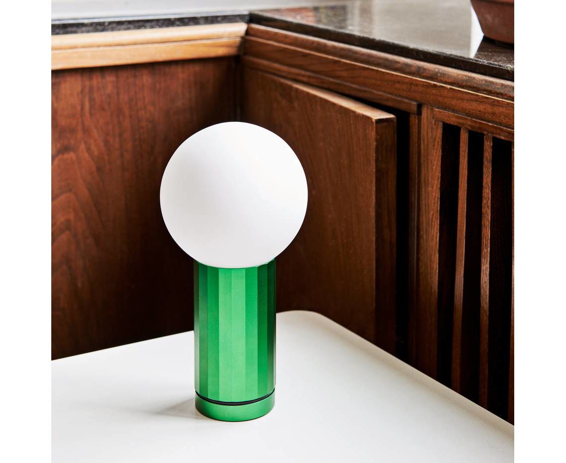 Красиво унифицированный дизайн из алюминия и опалового стекла. Основание представляет собой граненый цилиндр, который работает как выключатель света и шток, который удерживает сферический стеклянный диффузор на месте. Поворот основания по часовой стрелке переключает светодиодный индикатор, с дальнейшим вращением увеличивая световой поток. Это движение, встроенное в конструкцию, позволяет пользователю интуитивно осветлять или приглушать свет. Основание поставляется в четырех анодированных покрытиях: черный, алюминиевый, оранжевый или зеленый.