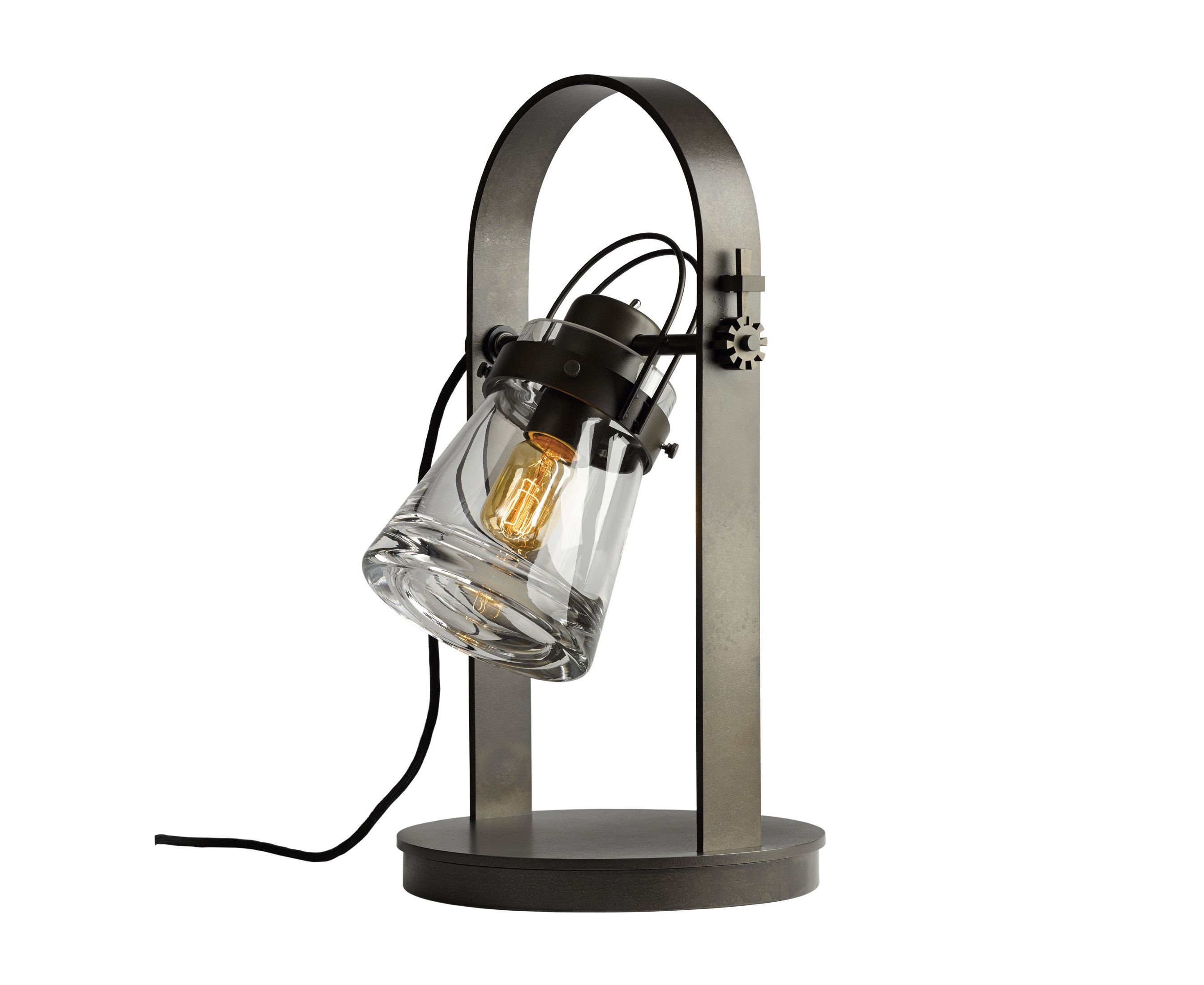 Вдохновленная колбой Эрленмейера с плоским дном, колба из кулона из дутого стекла окружена стальным воротником ручной работы, прикрепленным к арке внутри арки. Угол освещения можно отрегулировать с помощью стального винтика, который фиксируется гвоздем ручной работы.