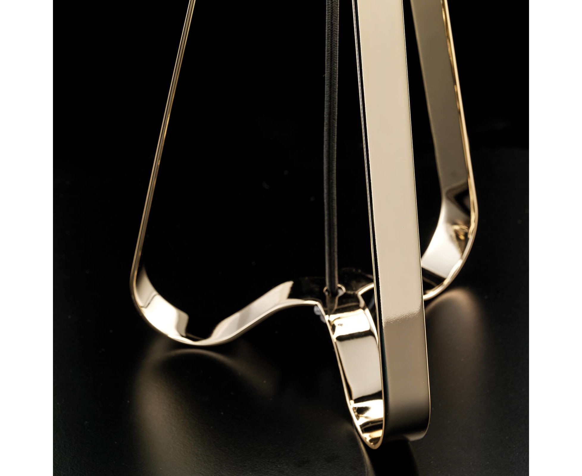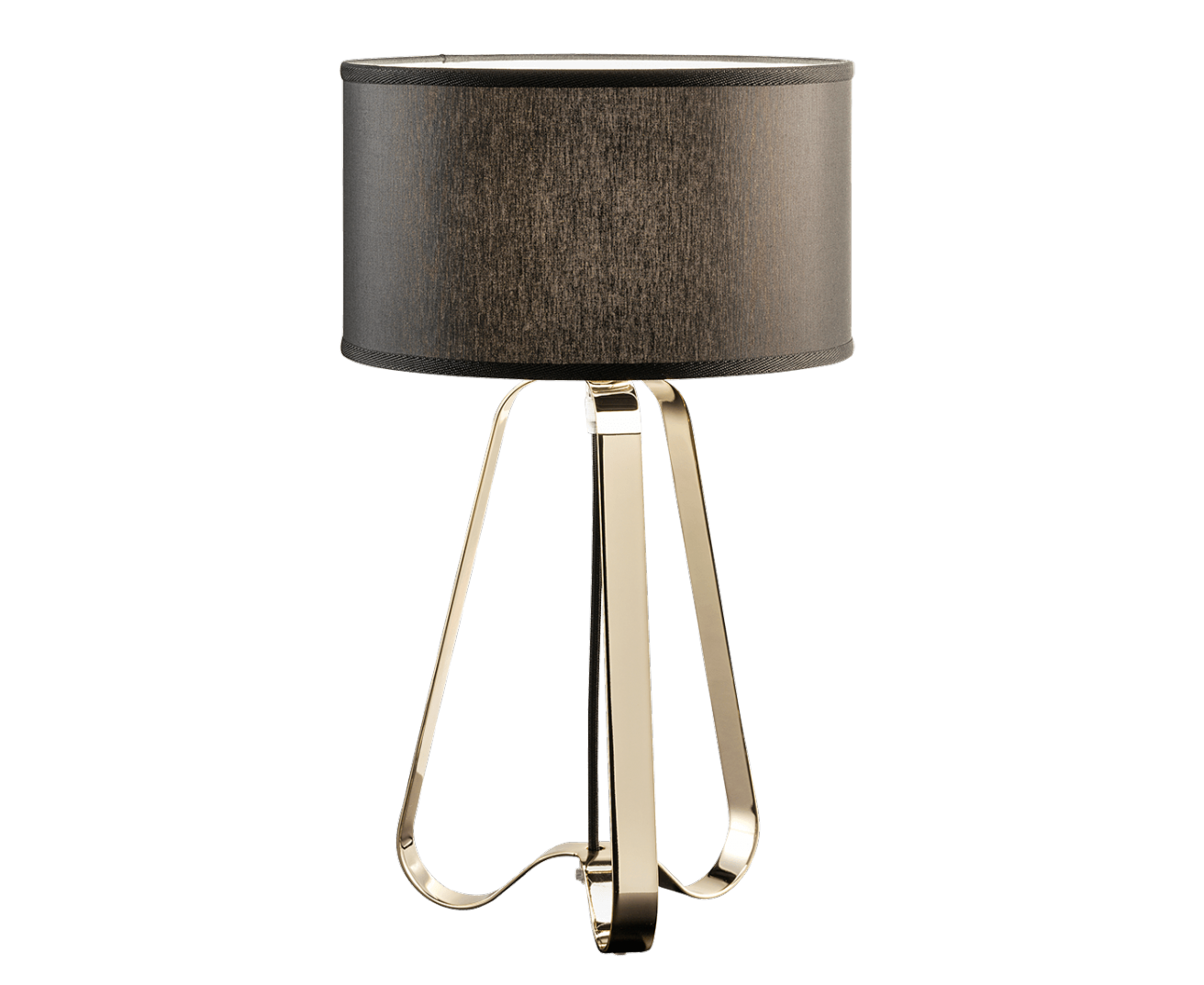 Настольный светильник из металла с отделкой из светлого золота и диффузором из черной или светлой ткани.