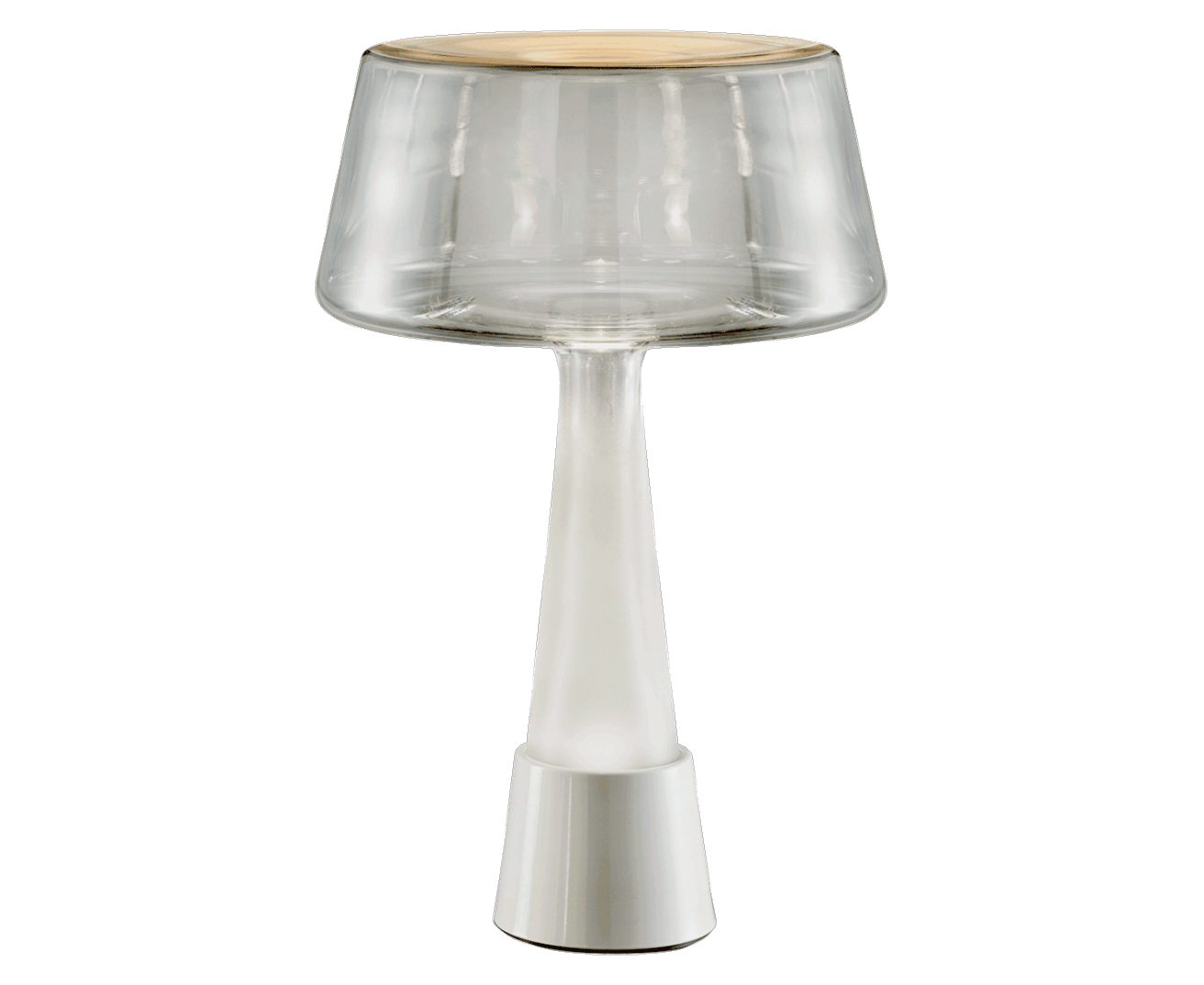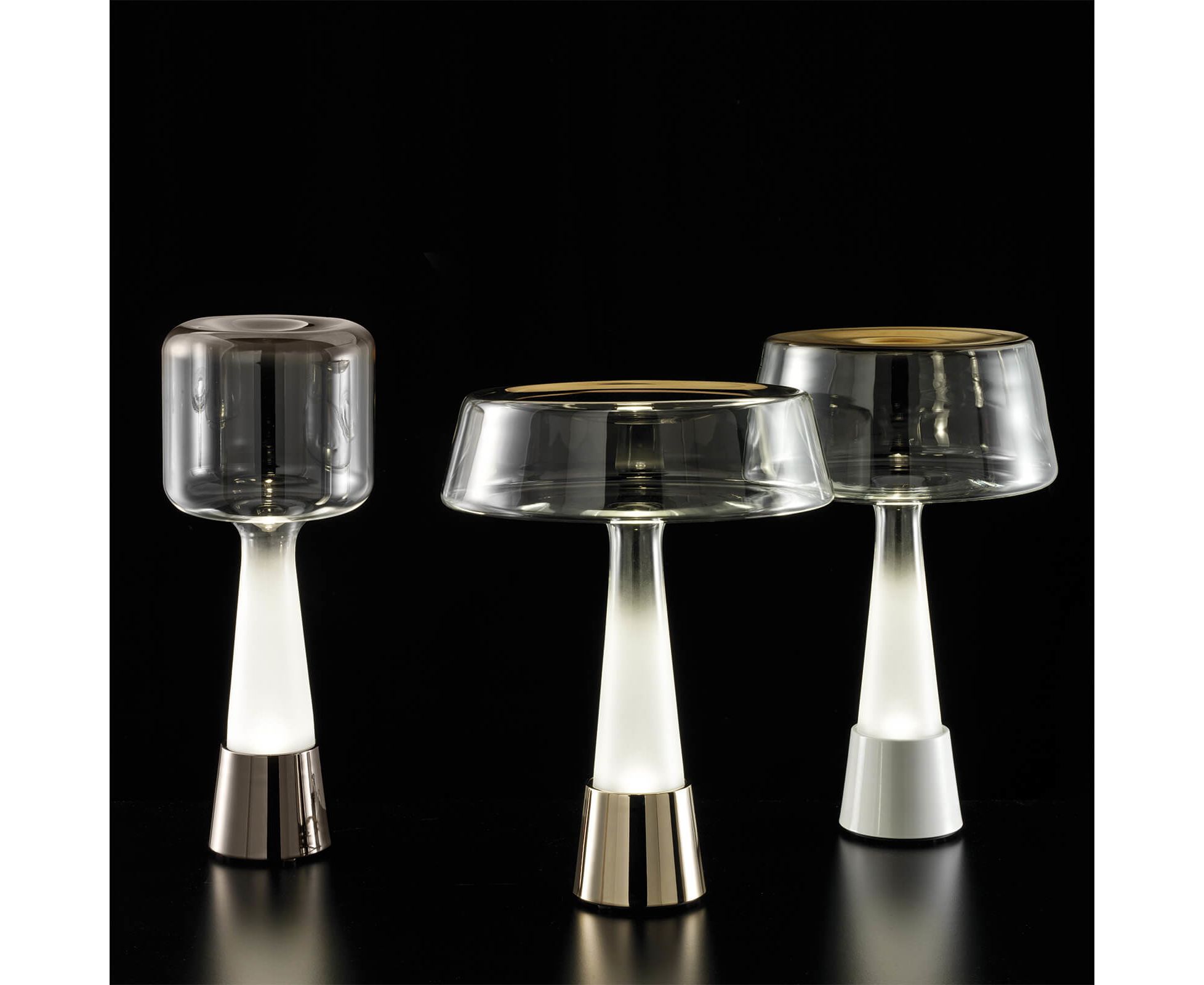 Стеклянный настольный светильник трех разных форм, с белым затемненным стволом и верхним рассеивателем с эффектом зеркала из золота или титана. Металлическая основа с отделкой из светлого золота, серого или белого цвета. Modern Catalogue Incanto