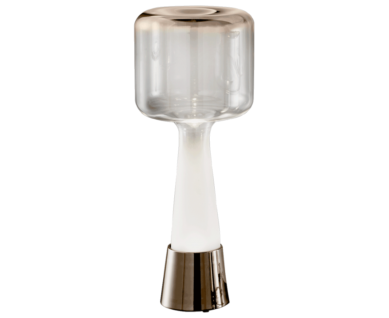 Стеклянный настольный светильник трех разных форм, с белым затемненным стволом и верхним рассеивателем с эффектом зеркала из золота или титана. Металлическая основа с отделкой из светлого золота, серого или белого цвета. Modern Catalogue Incanto