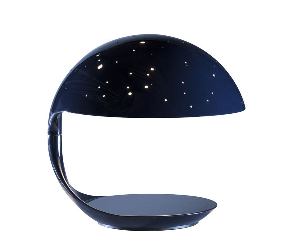 Светильник отлит из одного материала, а именно из термореактивной смолы, и доступен в ярких цветах, белом, черном или красном. 50-летний юбилей такой важной лампы для Martinelli Luce, как Cobra, спроектированной ее основателем Элио Мартинелли, безусловно, представляет собой важное событие для компании. По этому случаю выпускается особая версия Cobra, интерпретация Эмилианы Мартинелли как дань уважения ее отцу. Лампа эксклюзивного темно-синего цвета отличается серией отверстий на цоколе, символизирующей созвездие Скорпиона, знака зодиака Элио. Нижняя часть корпуса опирается на стальную основу, соединенную с верхней частью корпуса посредством центрального шарнира с возможностью вращения на 360°. Внутренний отражатель изготовлен из алюминия, окрашенного в белый цвет.