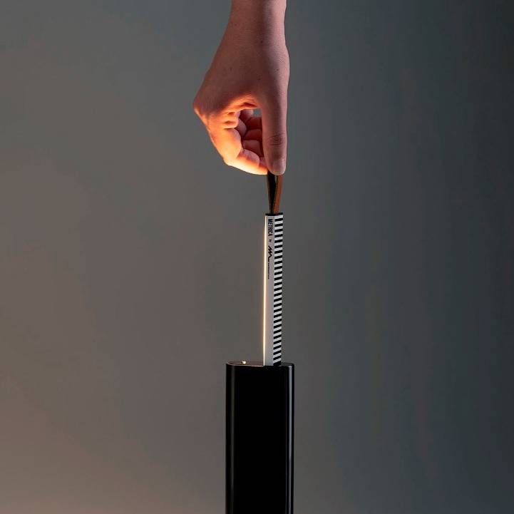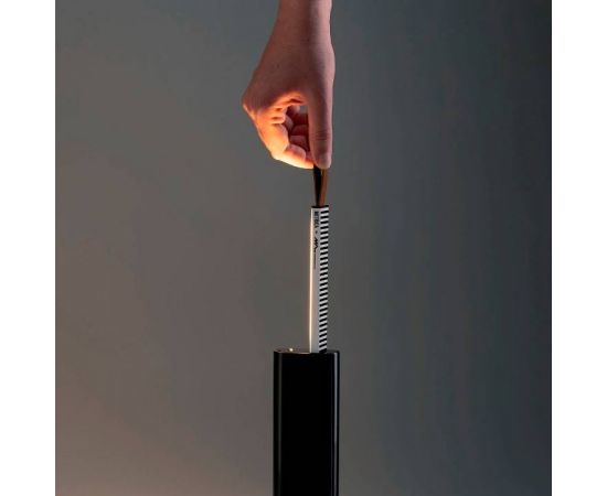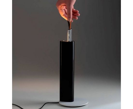 Metrica в настольном исполнении характеризуется полированным черно-белым корпусом, опирающимся на полированное белое круглое основание. Лампа дополнена кожаным ремешком, расположенным на ее конце для извлечения источника света. Источник света скрыт внутри опоры, которая образует основание и загорается, как только он извлекается, постепенно увеличиваясь по интенсивности, пока не достигнет своего максимального положения.