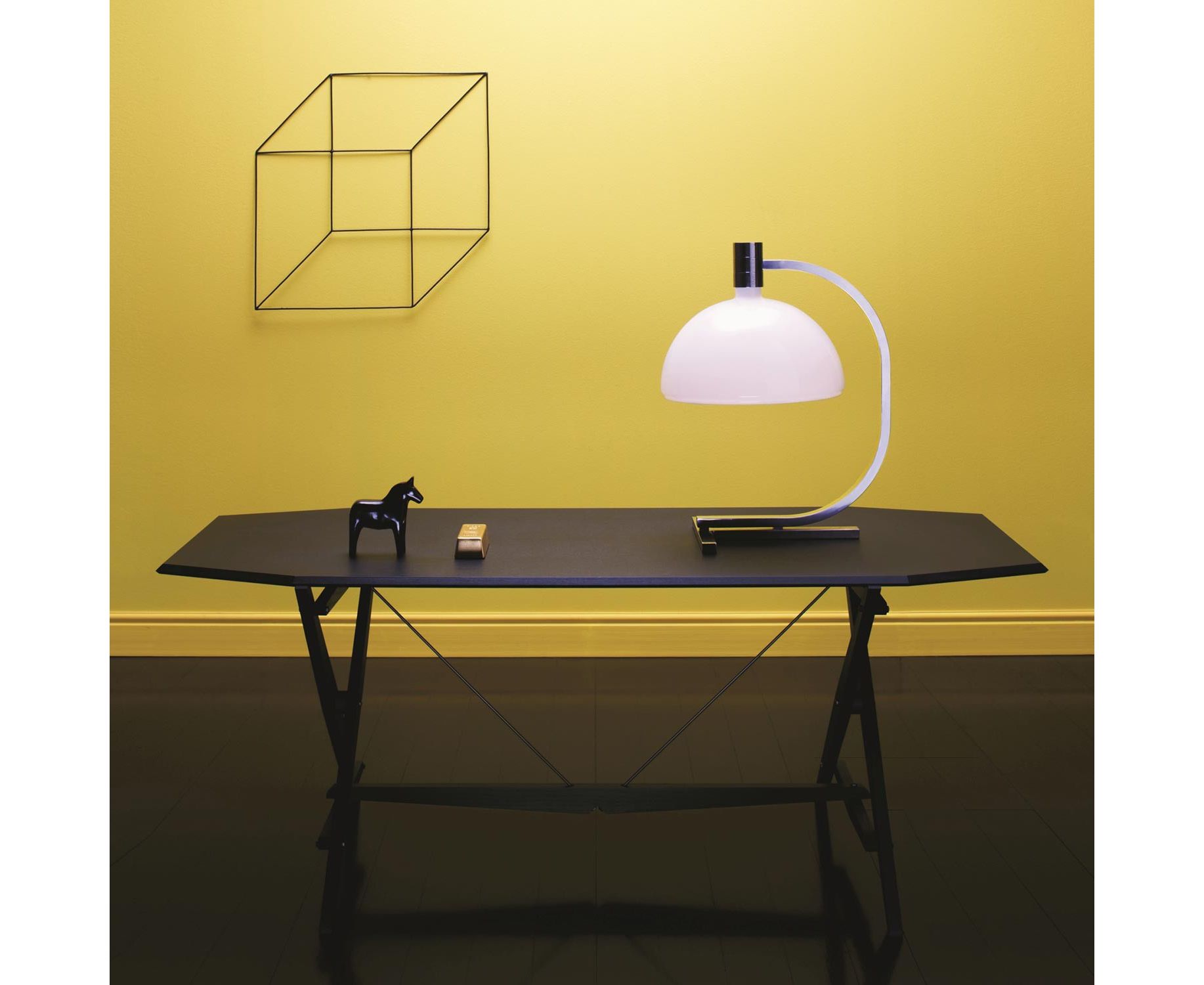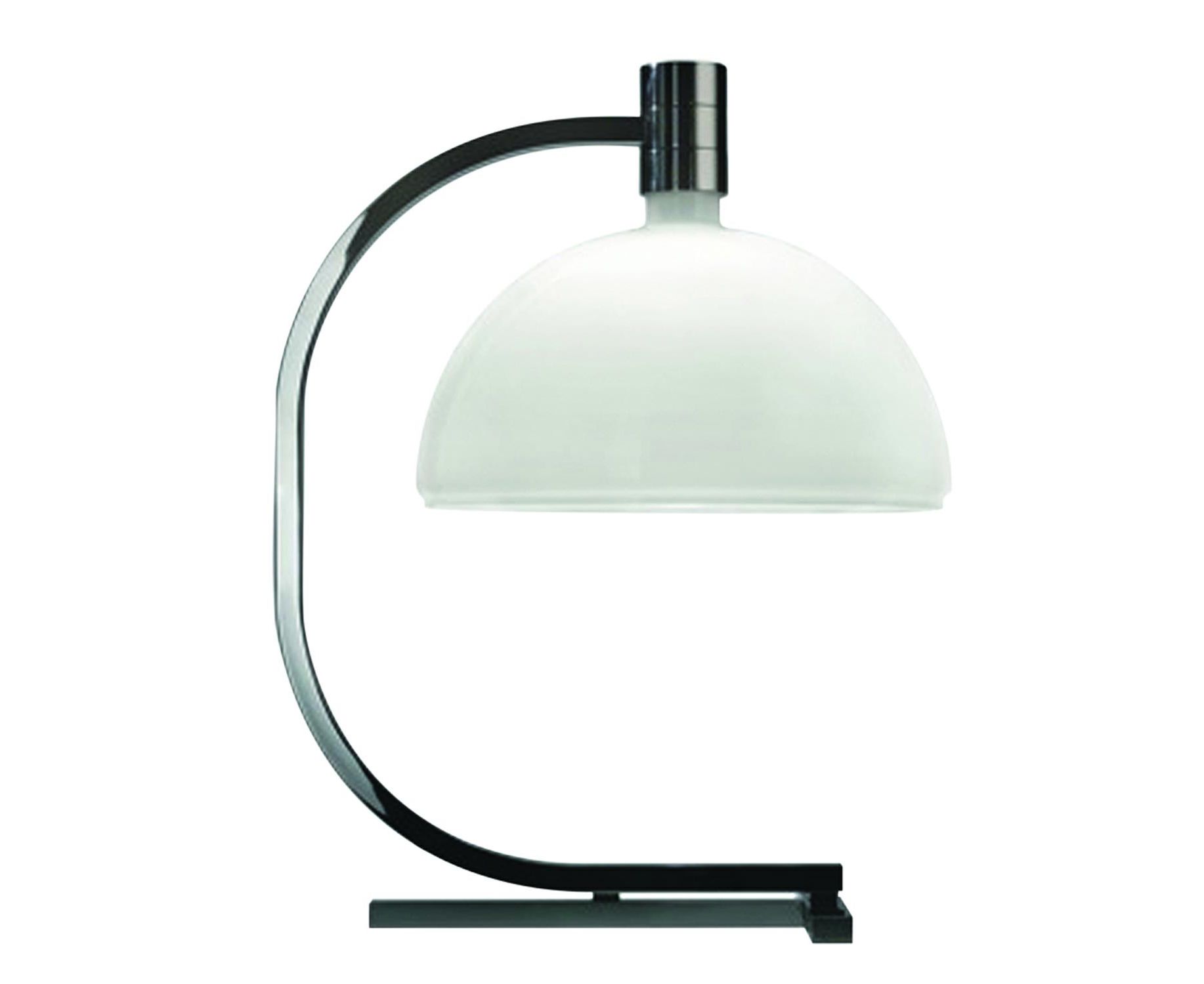 Настольная лампа со структурой из хромированного или черного хромированного металла. Чашевидный диффузор из опалового стекла белого цвета. Диммер на кабеле.