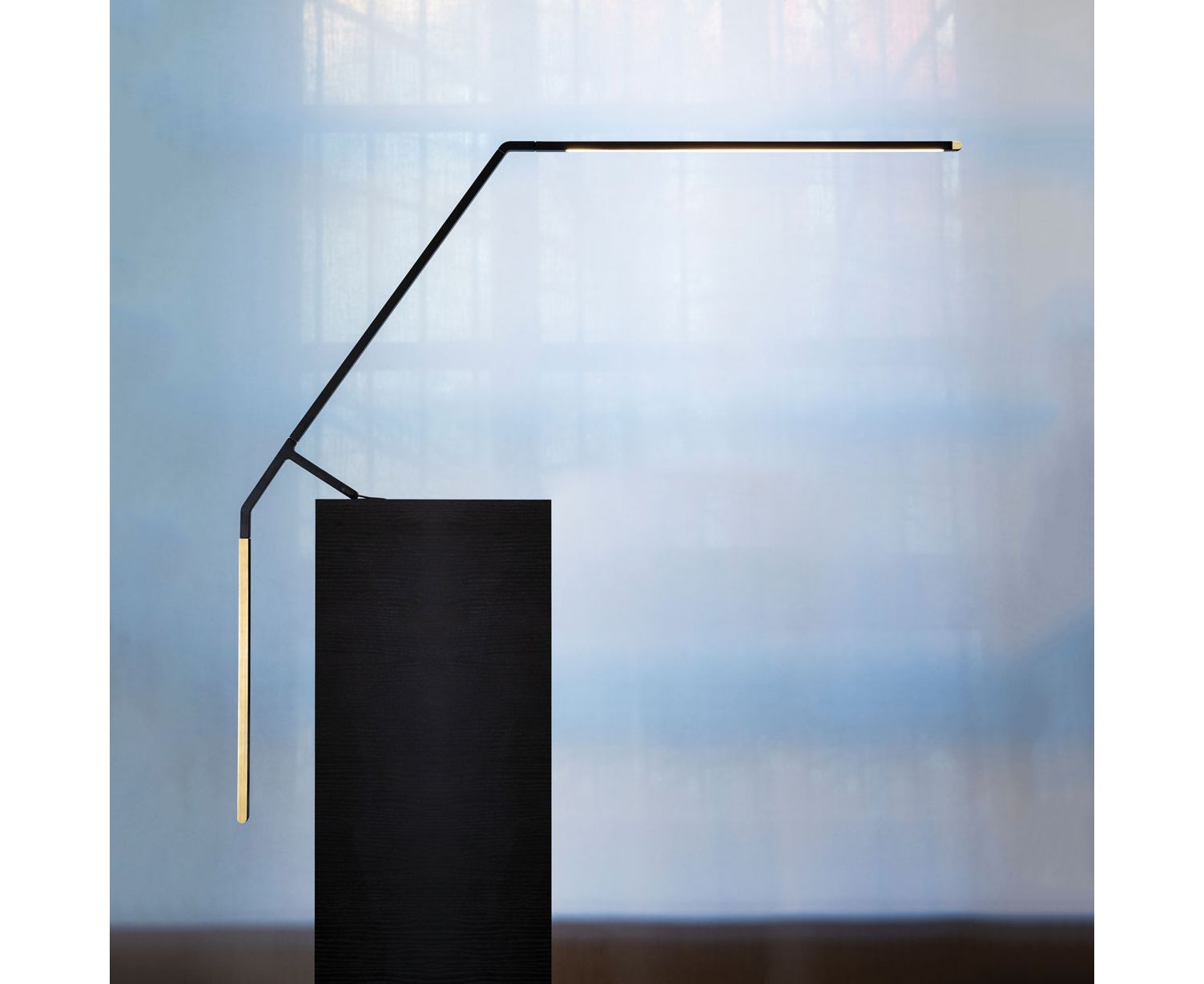 Настольная светодиодная лампа из экструдированного алюминия с Т-образным держателем из полимера, заполненного стекловолокном. Состоит из выступающего матового окрашенного в черный цвет кронштейна, в котором расположен источник света, и вертикального латунного противовеса. Лампа, свободно расположенная на краю поверхности, колеблется и движется, но всегда возвращается в горизонтальное положение. Встроенный в кронштейн светодиодный модуль вращается вокруг своей оси, что делает лампу универсальной и обеспечивает рассеянное прямое и непрямое освещение. Включение и затемнение через датчик приближения.