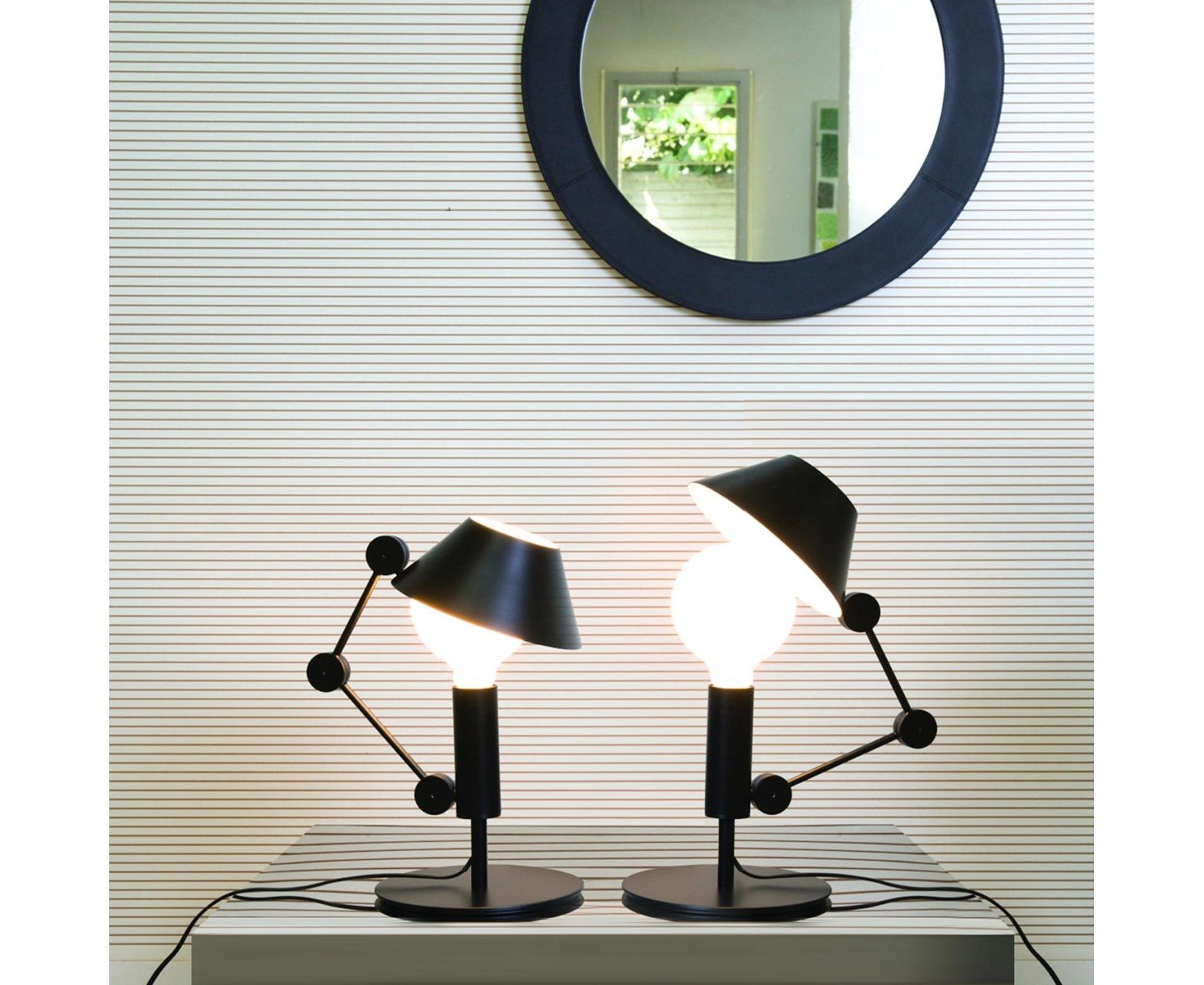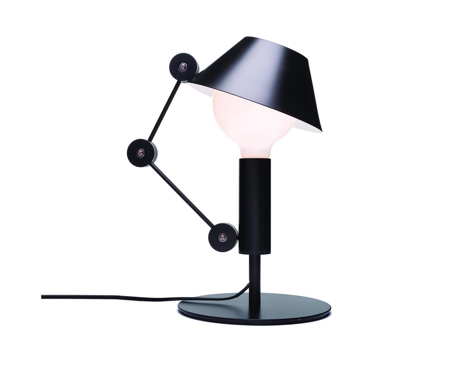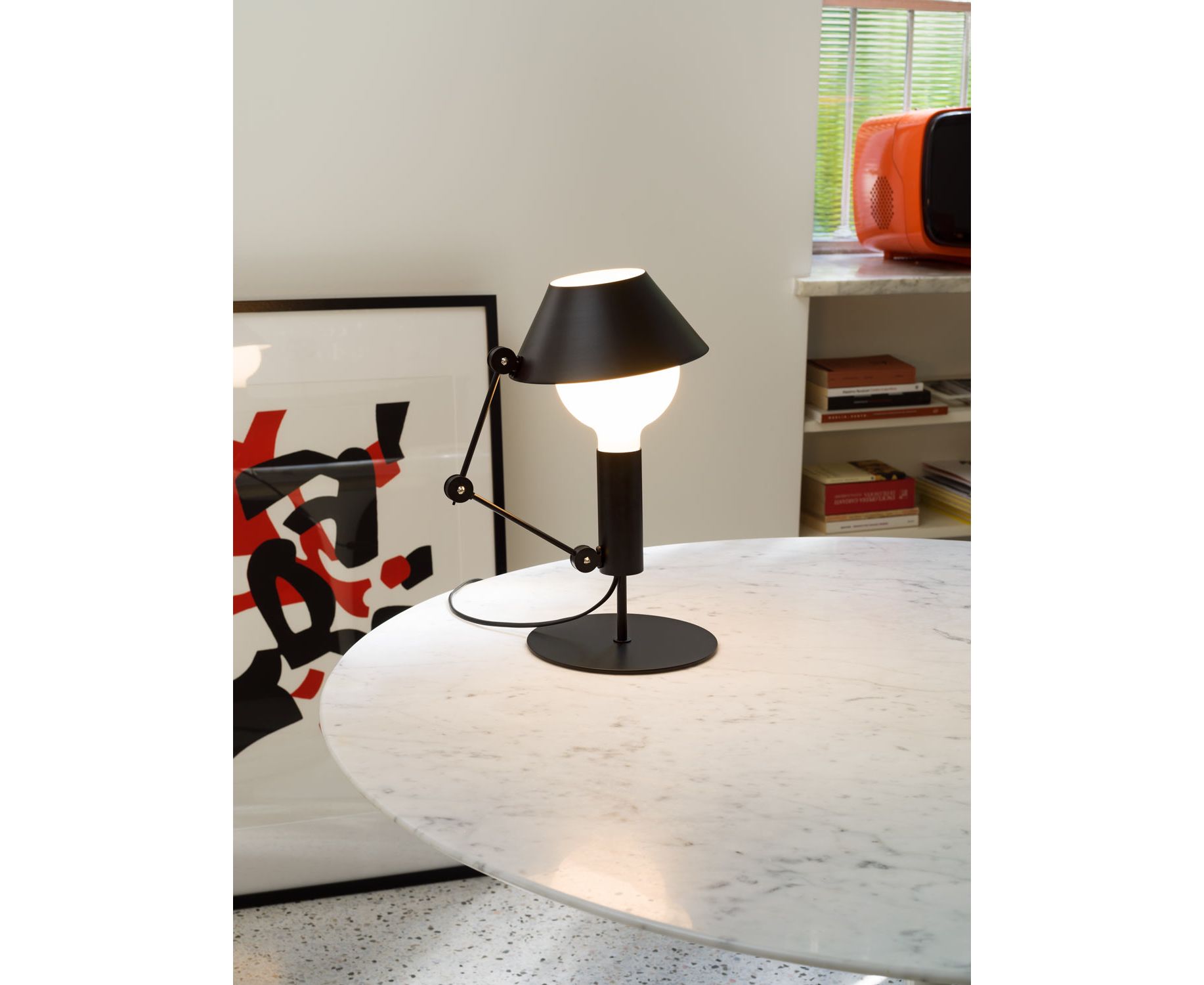 Графическая и игривая настольная лампа с шарнирным кронштейном и корпусом из матового черного металла. Двухцветный абажур с матовым белым интерьером создает рассеянный свет и обеспечивает возможность уменьшения интенсивности света в верхней части благодаря крышке лампочки с закрытием шляпы.