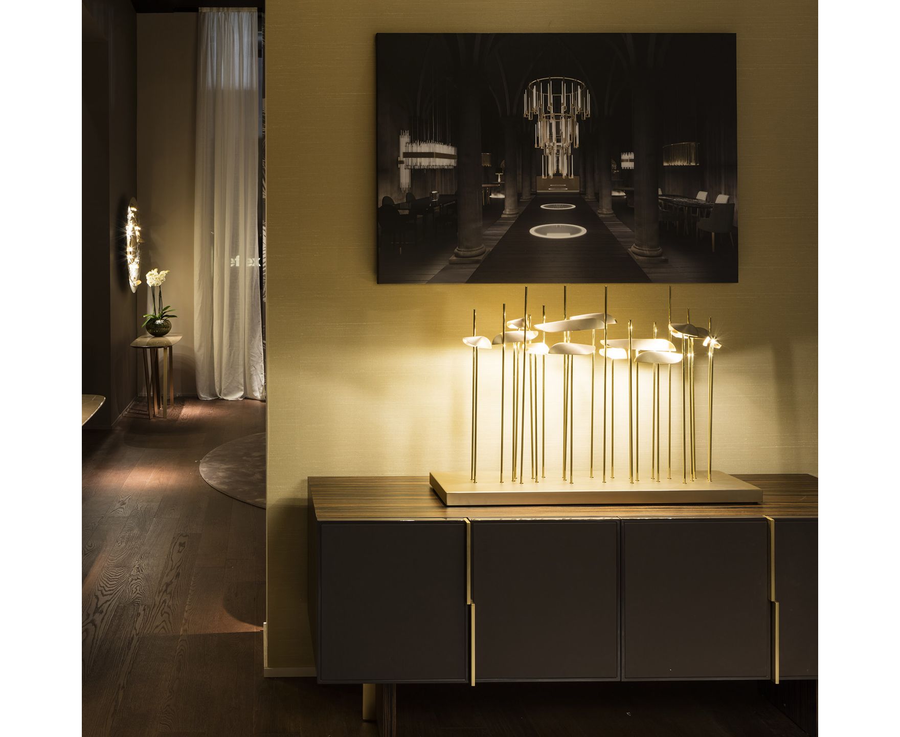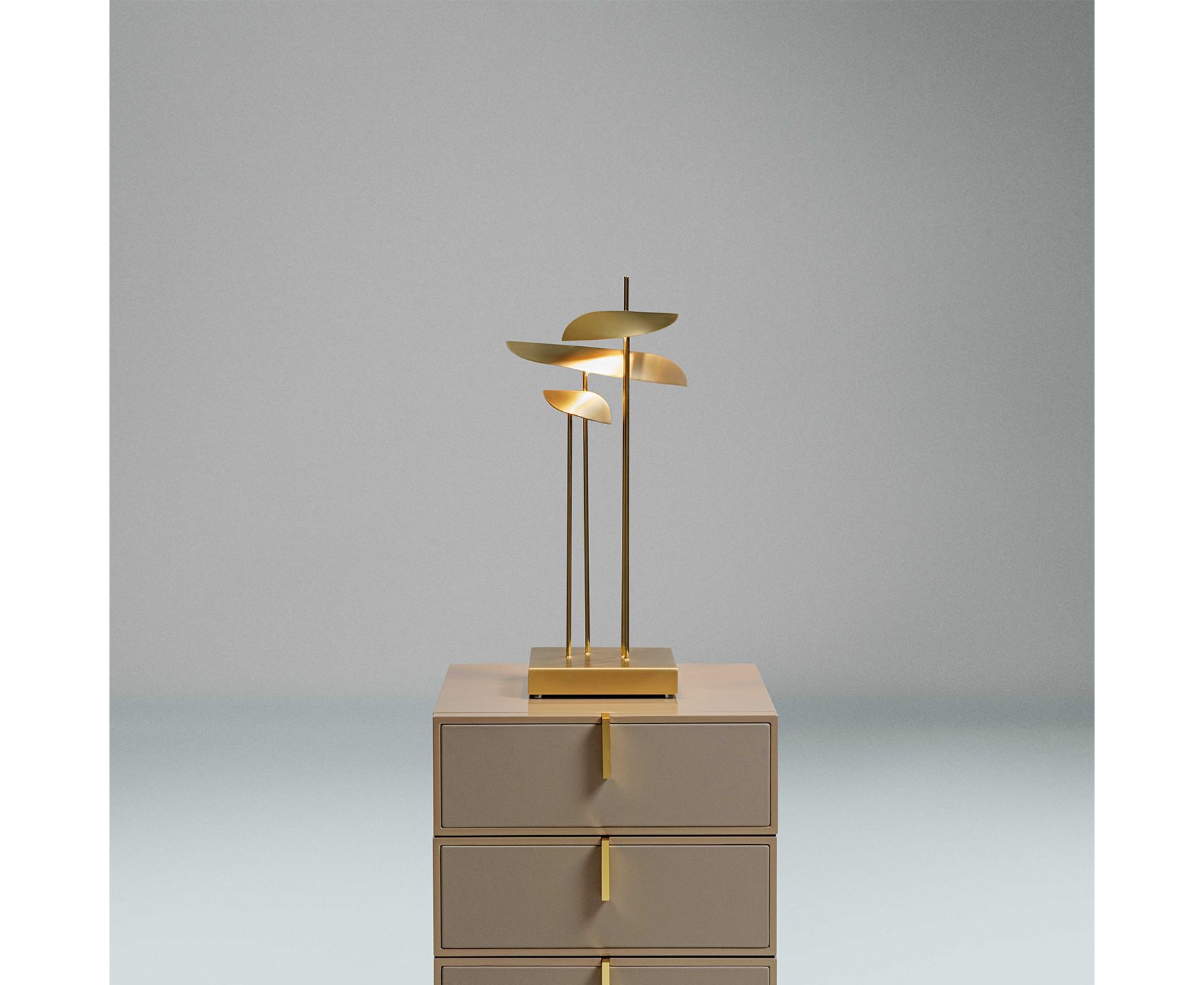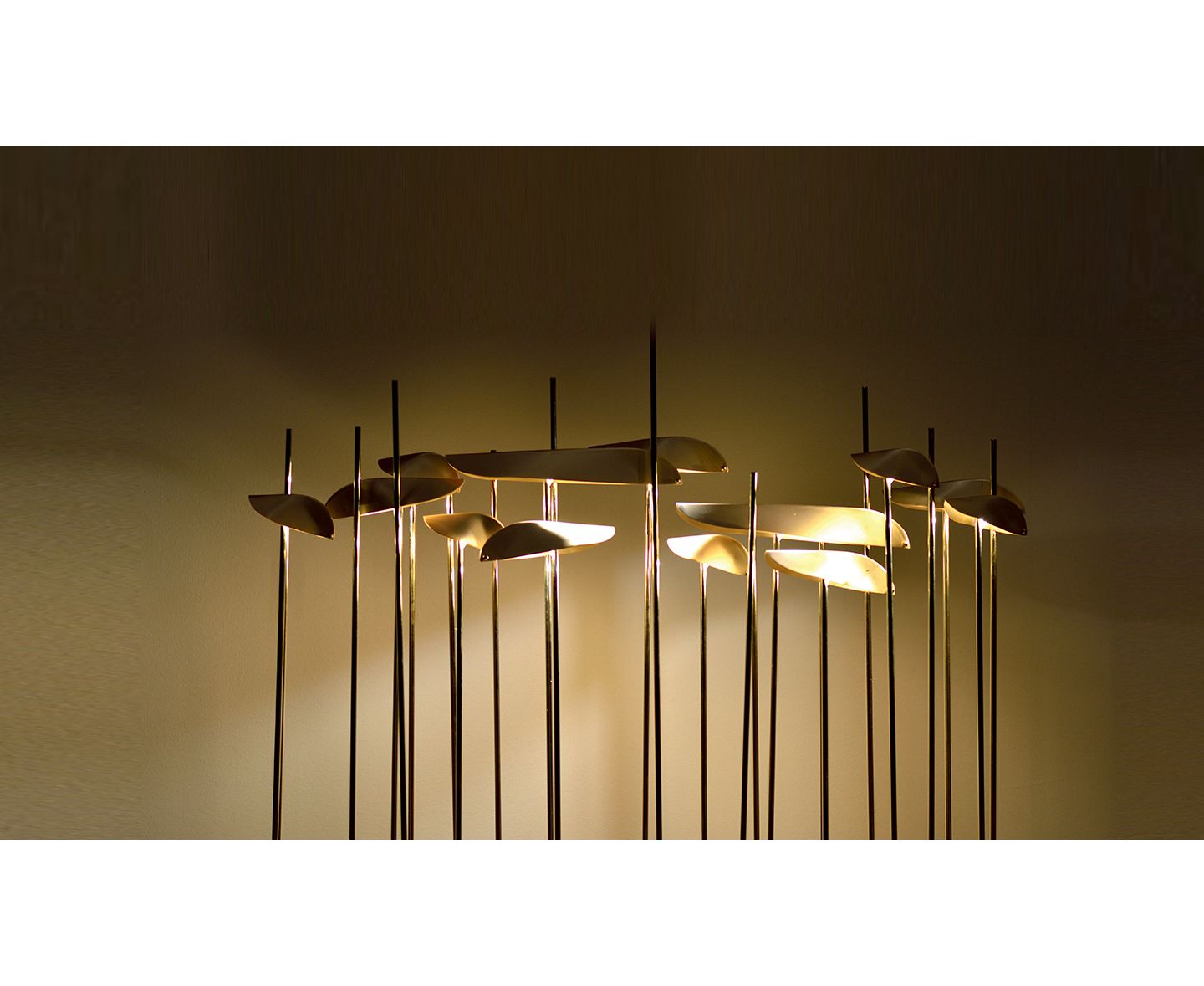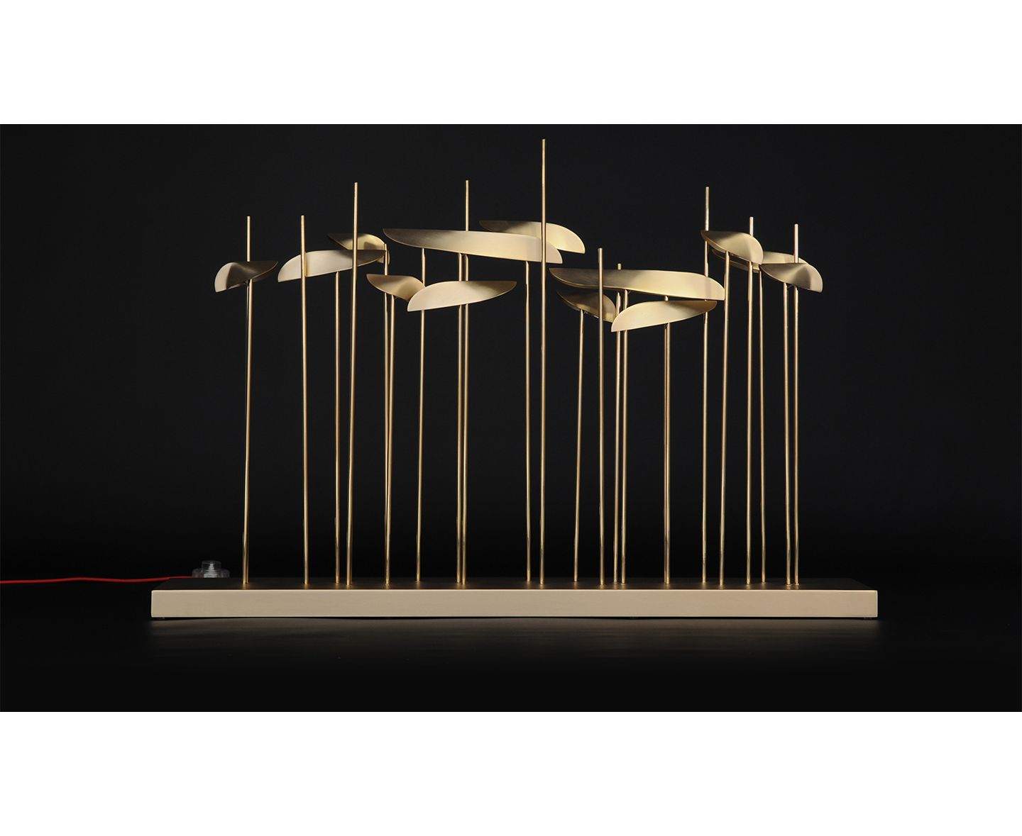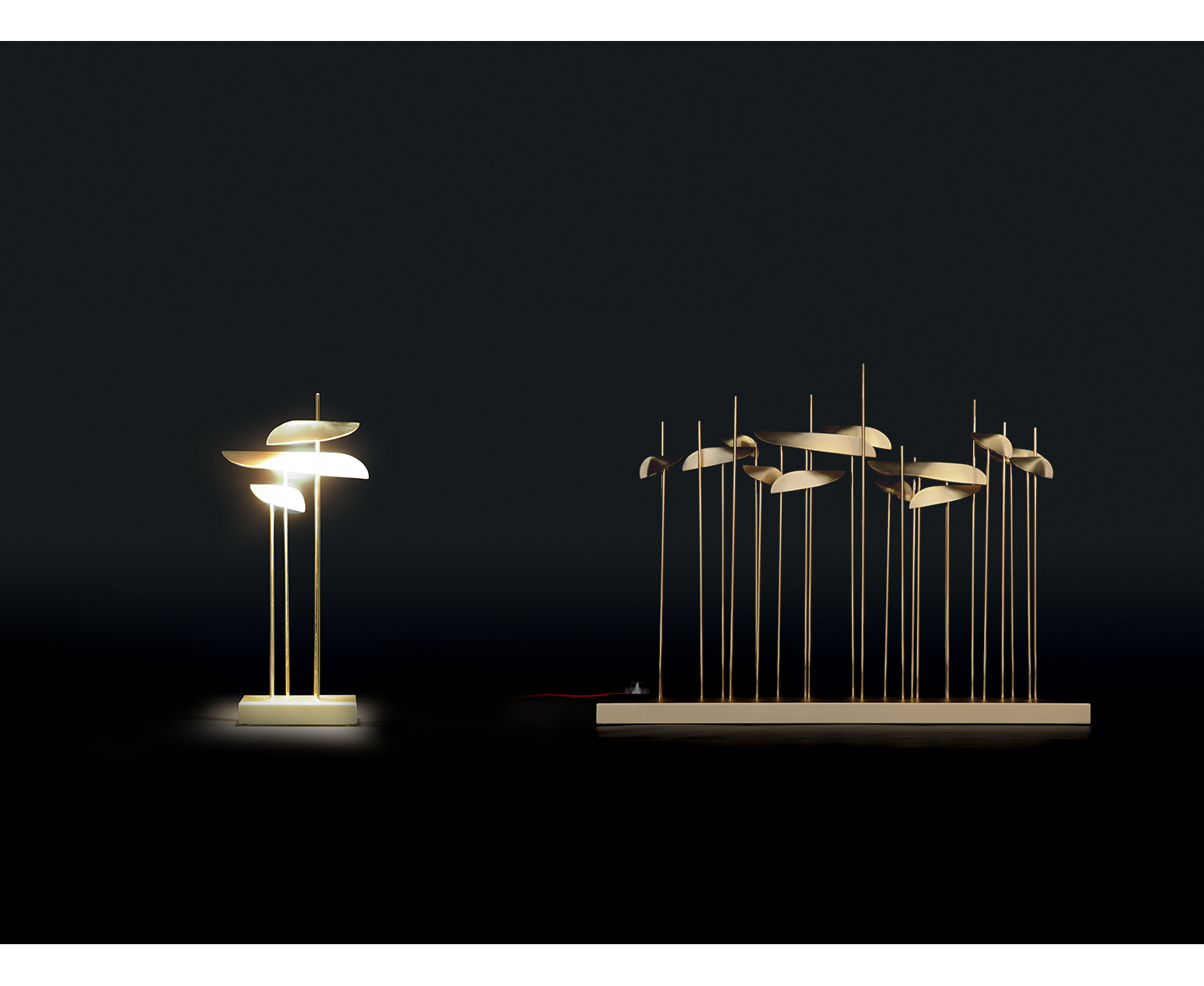Anodine table превращает свет в скульптуру, воплощая концепцию «форма не форма» света, который добавляет художественное прикосновение к атмосфере. Благодаря ручным технологиям изготовления, каждая часть коллекции уникальна. ANODINE MINI: состоит из 3 блестящих латунных стеблей, закрепленных на металлической основе с гальваническим покрытием из матового золота, украшенных металлическими листами, асимметричными и сделанными вручную опытными мастерами, с отделкой из матового золота в художественной росписи. ANODINE TABLE: состоит из 26 блестящих латунных стеблей, прикрепленных к металлической основе с отделкой из матового золота, выполненной вручную, с металлическими листами, асимметричными и сделанными вручную опытными мастерами, с отделкой из матового золота с гальваническим покрытием.