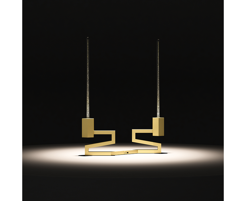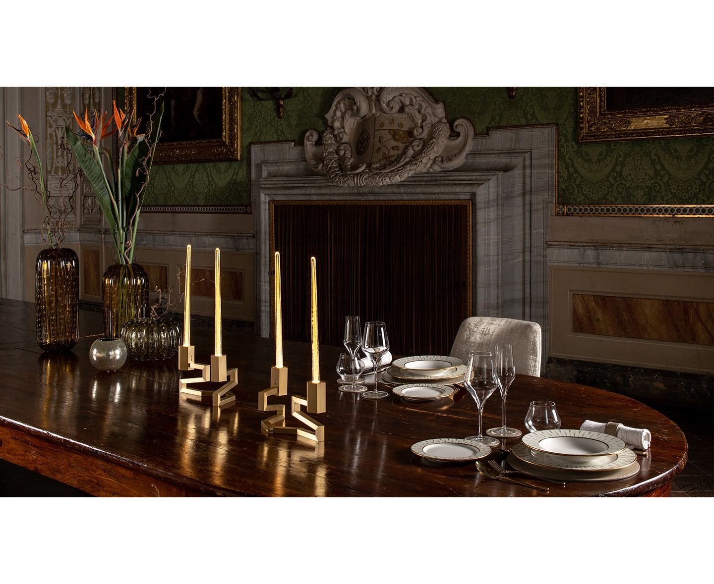 Kalì table является результатом ремесленного мастерства, полностью сделанного на острове Мурано. Настольная версия люстры Kalì также является частью этой коллекции. Она сделана с медным каркасом, несущем два элемента из муранского стекла, заключающих золотой лист 24 КТ.