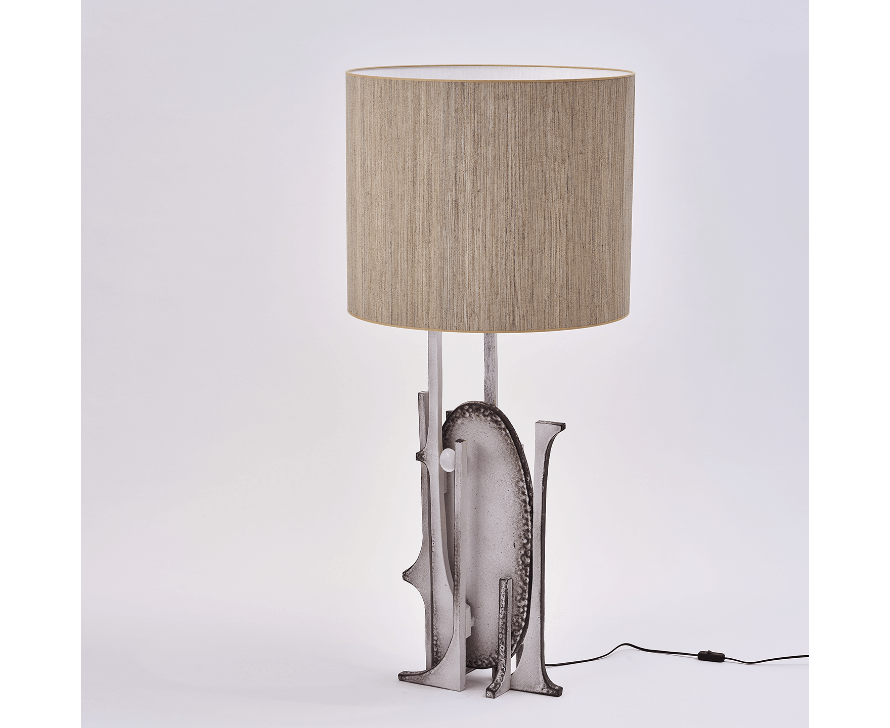 Лампа с белой керамической основой Faenza ручной работы асимметричной формы с элементами с глянцевой отделкой, чередующимися с яйцевидным элементом из селенита. Натуральный абажур изготовлен из 100% непальского конопляного волокна. Источник света лампы Е27.