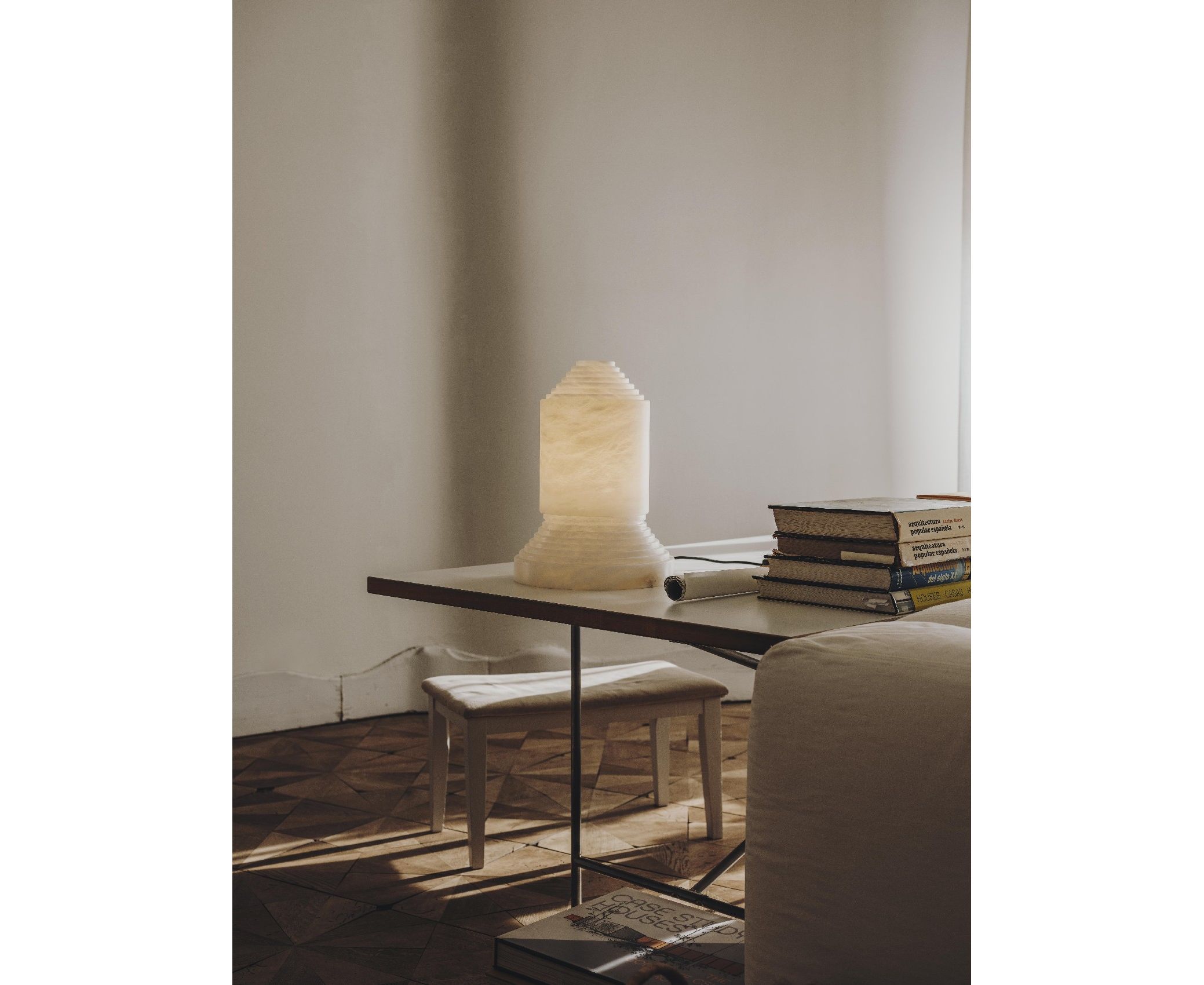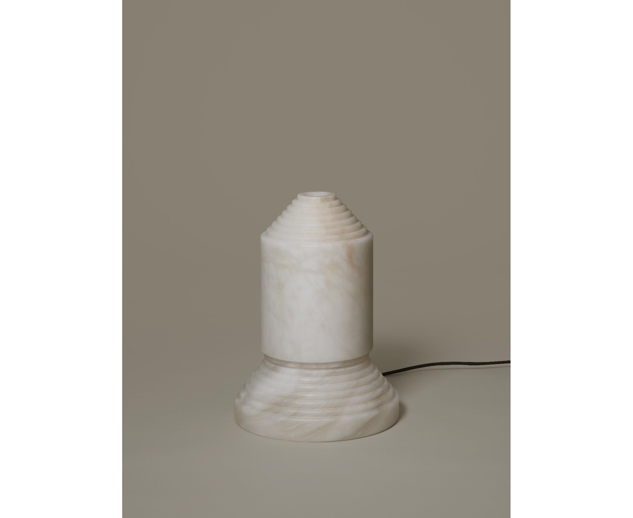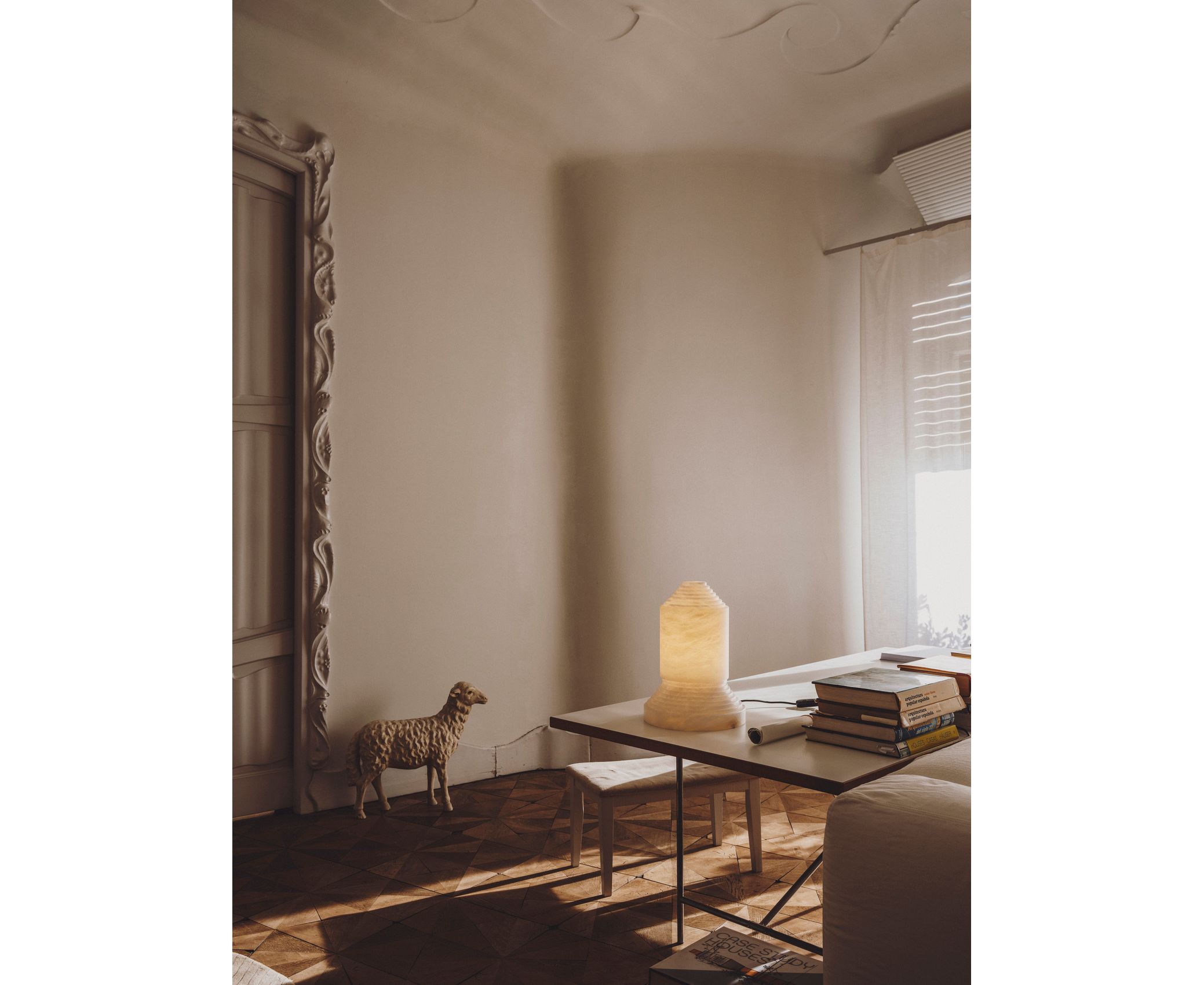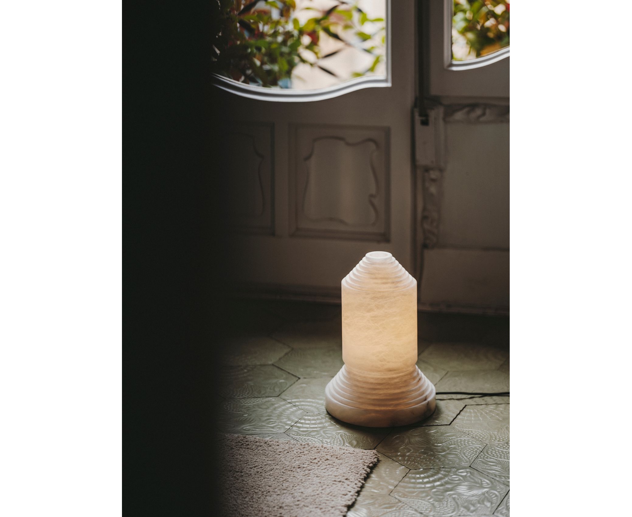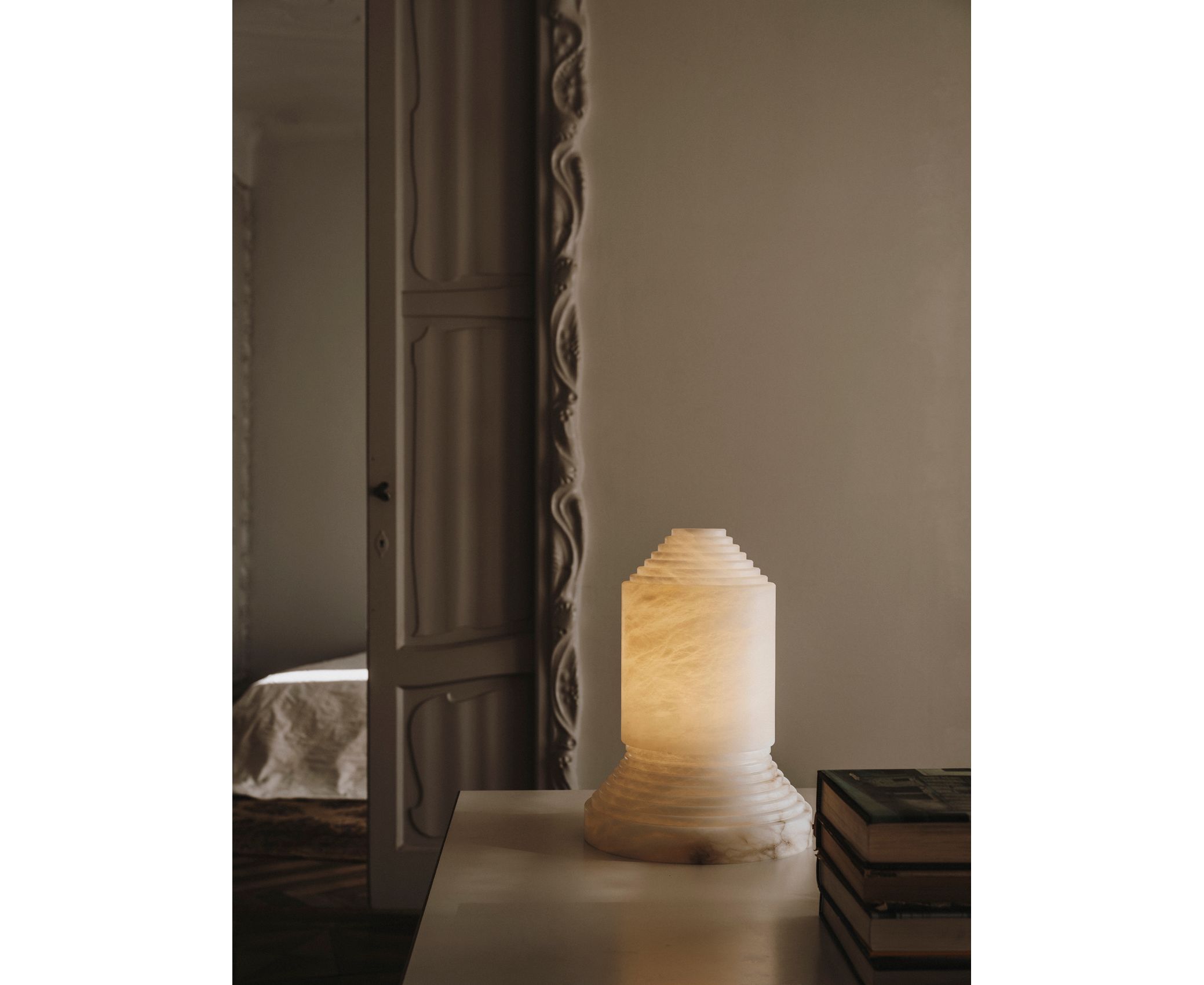 Лампа отсылает к библейской истории недостроенной Вавилонской башни, где люди были разделены на языковые группы, жертвы своих амбиций. Лампа Babel, однако, предлагает иную перспективу; ее прочная башня идеально закончена и сияет мощью. Использование алебастра, твердого и пустотелого, считалось оскорблением преобладающих тенденций того времени. Алебастр считался китчем, лишенным конструктивной прочности мрамора или благородного полупрозрачного качества оникса; он мало использовался в сувенирной промышленности для туристов. Это единственное в своем роде изделие ручной работы - идеальный компаньон для ночных бесед. Эффектная лампа, создающая завораживающий свет и интимную атмосферу.