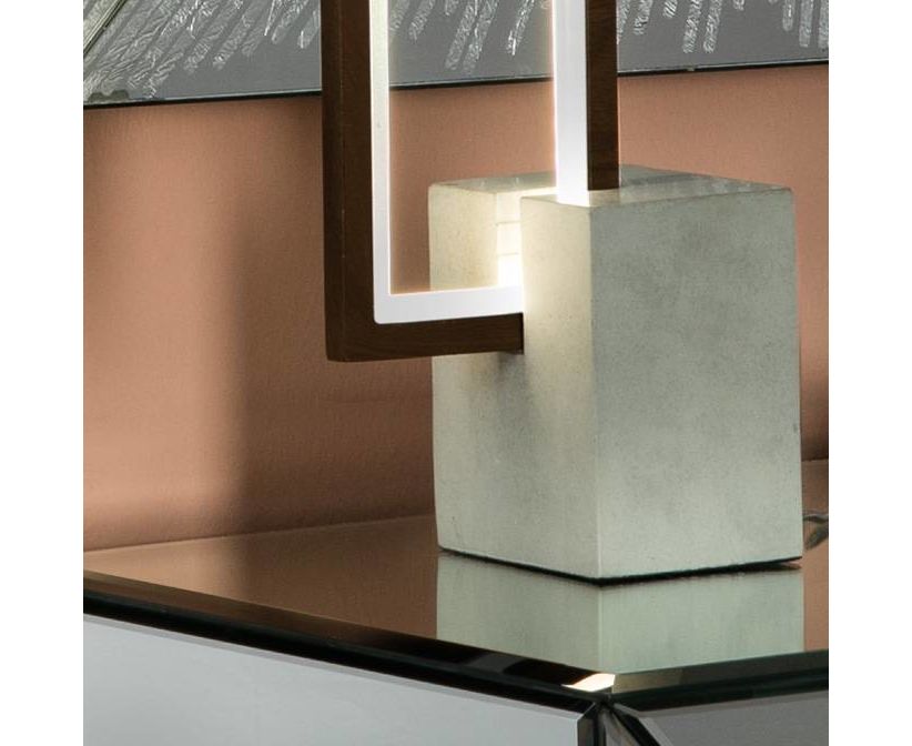Настольная рабочая лампа LED из акрила, алюминия и металла. Покрытие рамы, имитирующее тёмное дерево, покрытие основания, имитирующее цемент. Внутренний матированный акриловый рассеиватель