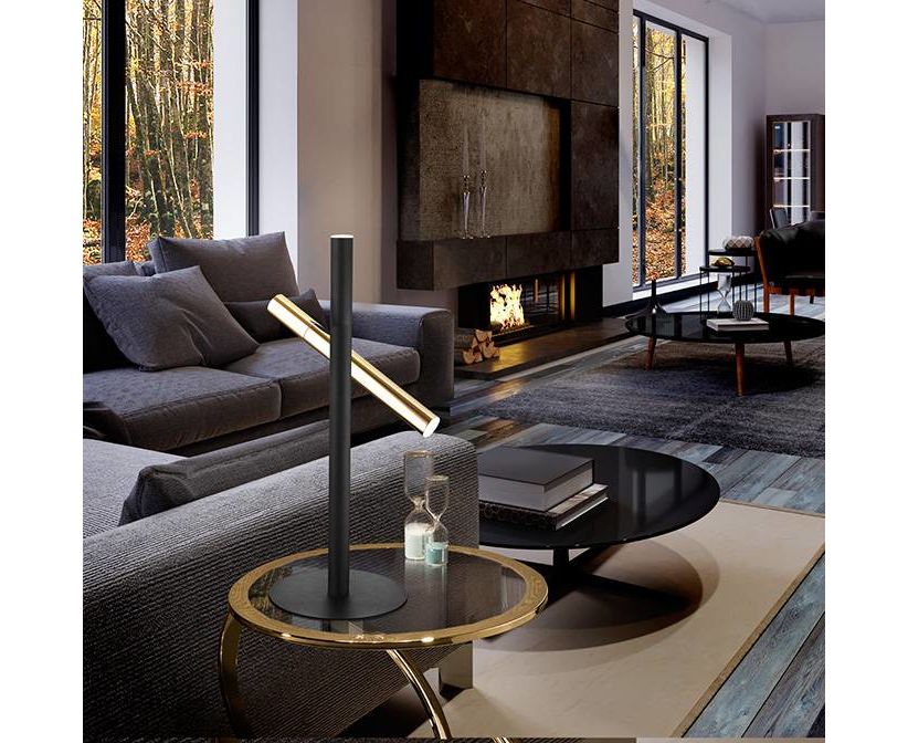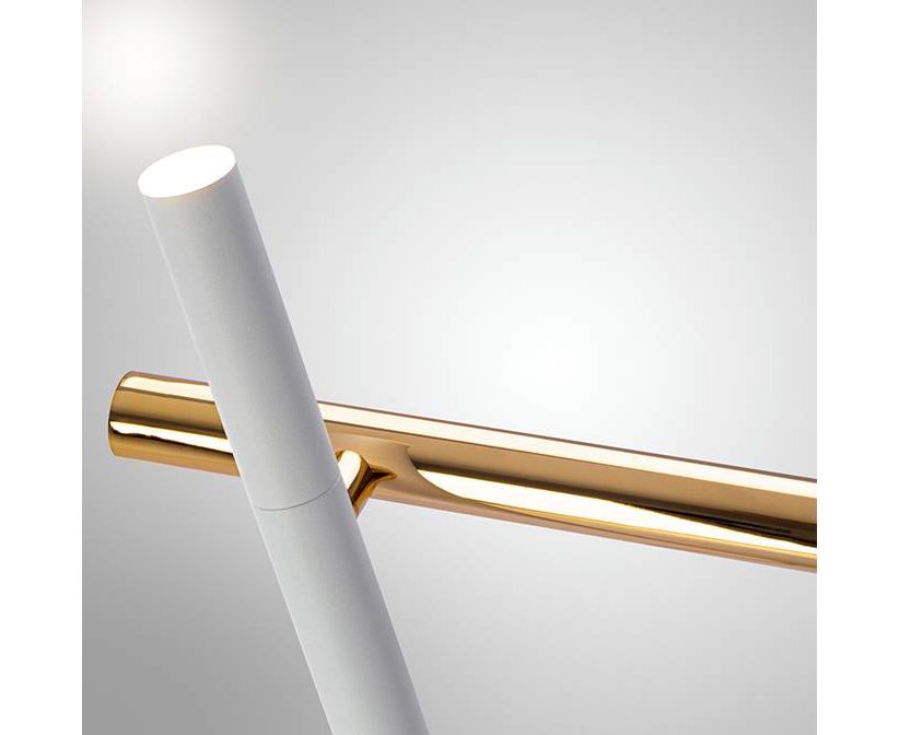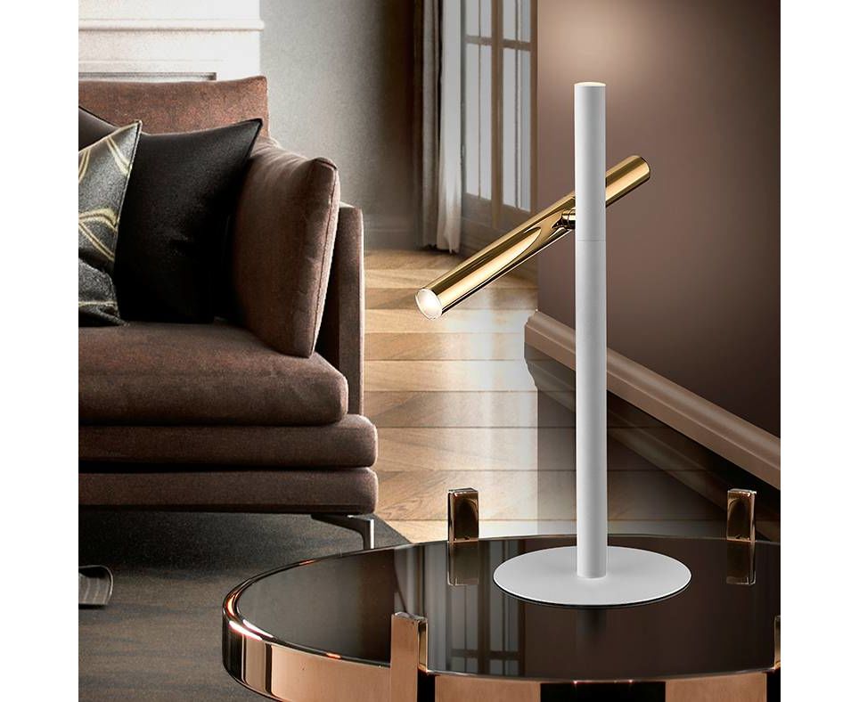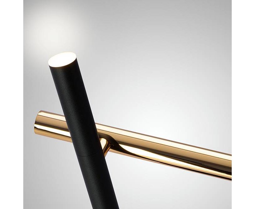 Настольная лампа LED с 2 лампами из металла с блестящим золотистым и с матовым чёрным покрытием. Акриловый рассеиватель опaлового цвета.