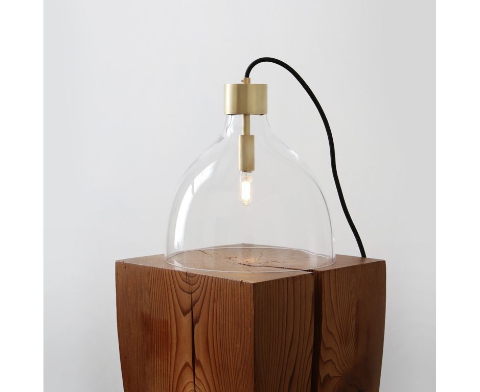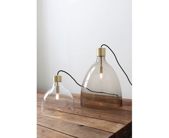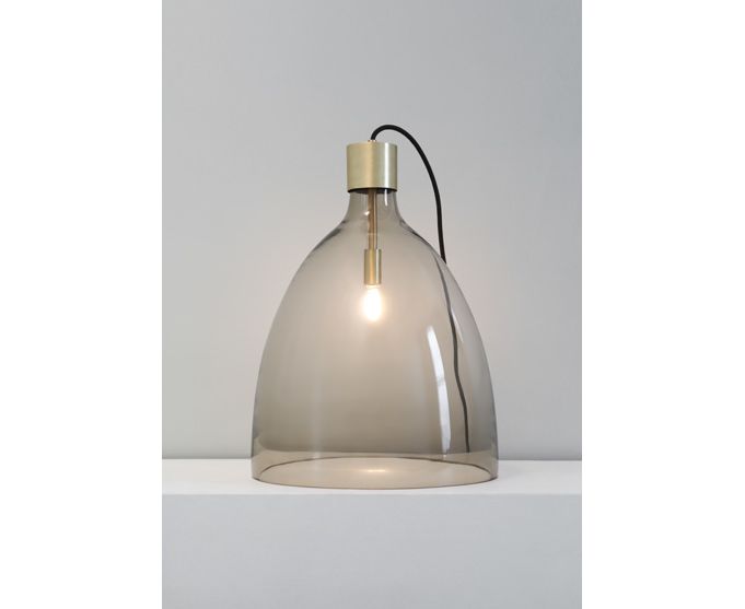 Стеклянные «колокольчики» ручной выдувной формы выступают в роли рассеивателя для отдельной висящей внутри лампы. Твердый латунный колпачок расположен на шее, гнездо висит на колпачке на коротком жестком латунном стержне. Доступны два размера и два цвета стекла: прозрачный и прозрачный оливковый.