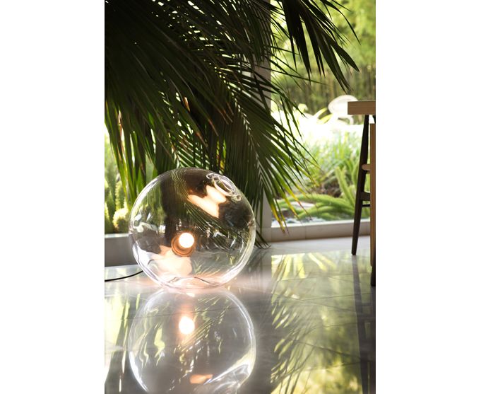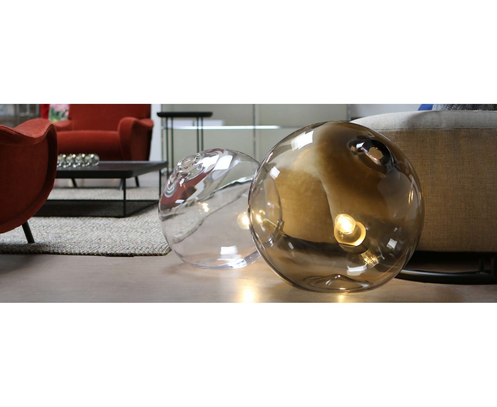 Большая сфера из чешского стекла с латунной розеткой, выполненной на одной стороне. Каждая стеклянная сфера отрывается от трубы воздуходувки, а затем полируется с помощью факела, чтобы создать уникальную деталь - выдувается вручную, нет двух одинаковых. Два винта с накатанной головкой прикрепляют съемную розетку со стороны стеклянной сферы для доступа к лампе. Доступен в двух размерах и четырех прозрачных цветах.