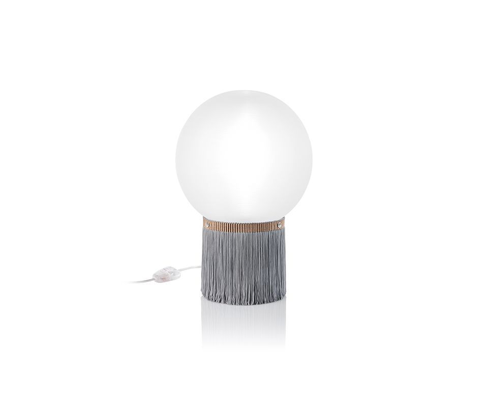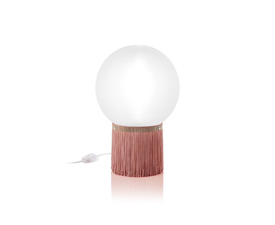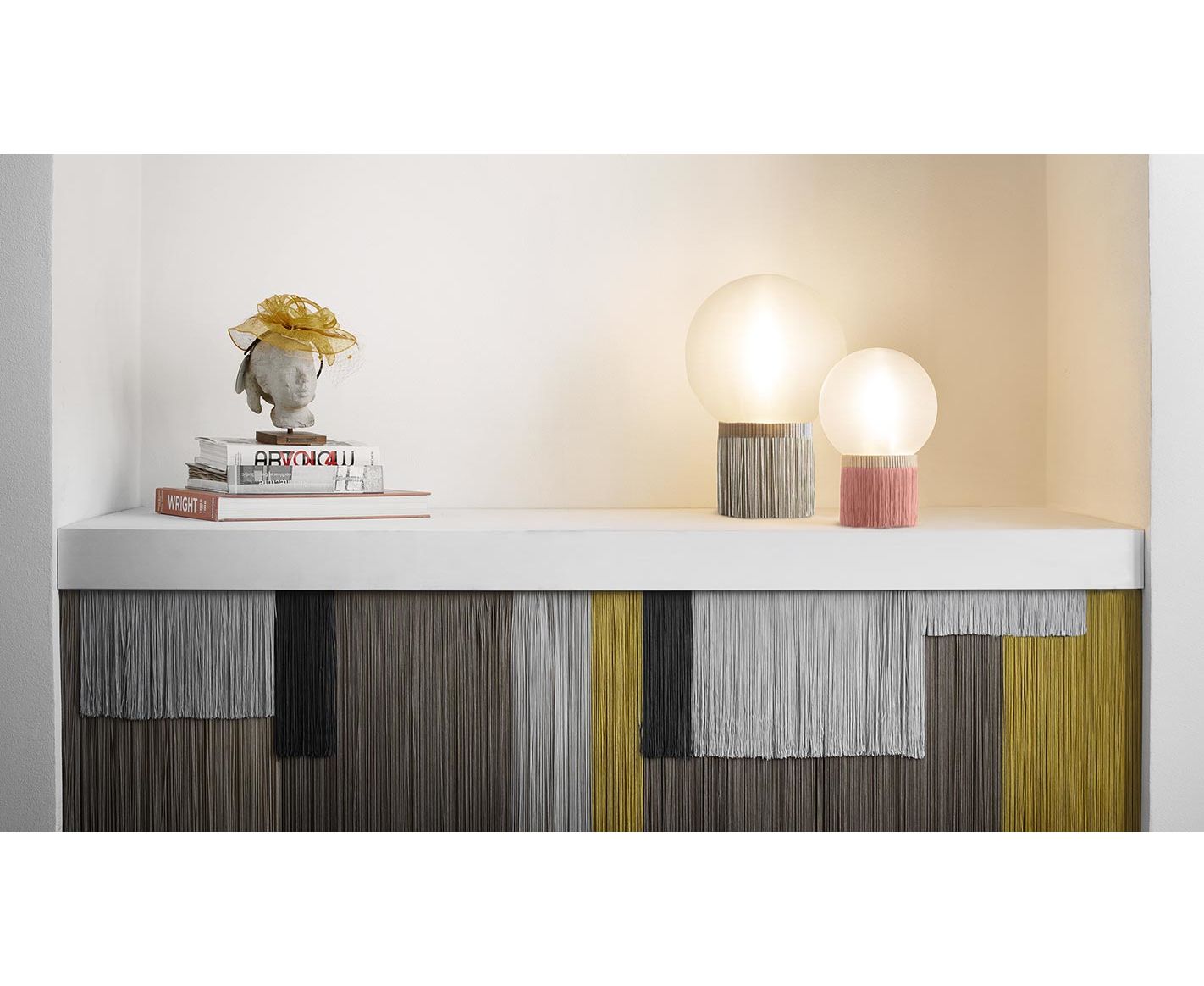 Atmosfera находится на вершине моды и дизайна, где свет сливается с тканью. Новая коллекция настольных ламп доступна в 2 размерах, с розовой или серой бахромой в стиле Чарльстона или металлической версией, где наложенные слои технополимера создают эффект полкадо. Лампы имеют независимые выключатели в сфере и основании; этот свет идеально подходит для позднего возвращения домой. Также имеется подвесная лампа.