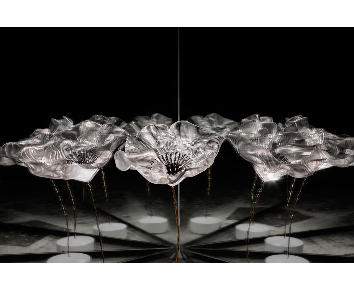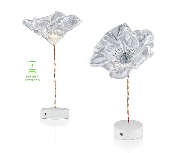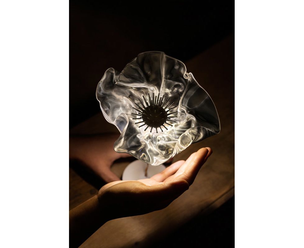 Марк Сэдлер руководствовался желанием выйти за пределы известного и найти новый композиционный язык при формировании технополимеров Slamp. Нежная, восхитительная и перезаряжаемая настольная лампа Lafleur с батарейным питанием образуется путем нагревания Lentiflex® при контролируемой температуре и последующего ручного формования для создания цветка. Лампа имеет магнитное основание и поставляется в комплекте с металлическим анкером, подходящим для того, чтобы стоять на столе, или вкручивается в стену, превращая Lafleur в аппликацию.