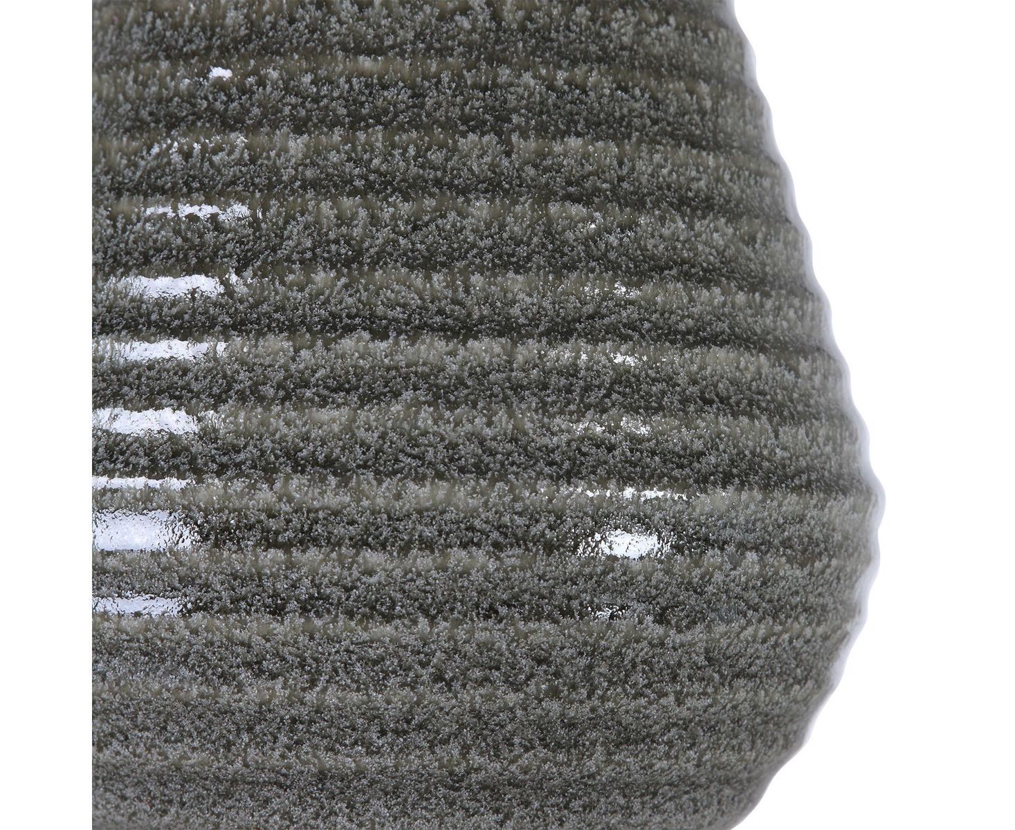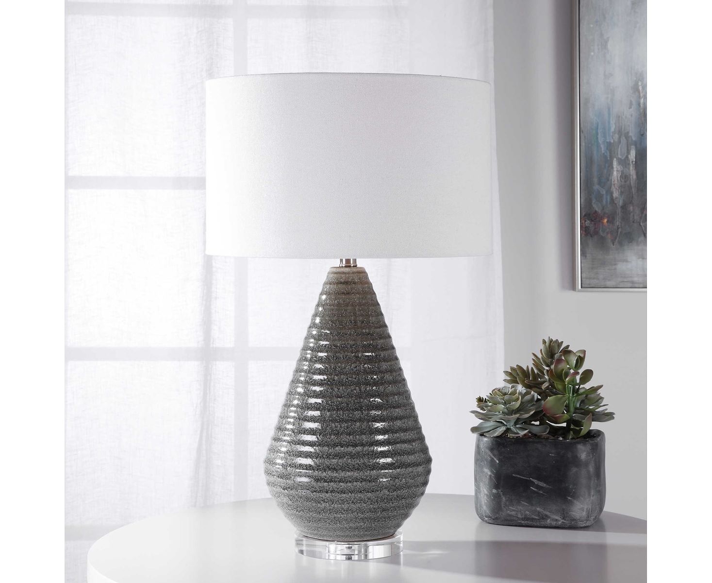 Эта переходная настольная лампа, демонстрирующая коническую керамическую основу с ребристой текстурой, отделана потрескавшейся дымчато-серой глазурью, толстой хрустальной ножкой и полированными никелевыми вставками. Лампа акцентируется белым льняным абажуром в форме барабана.