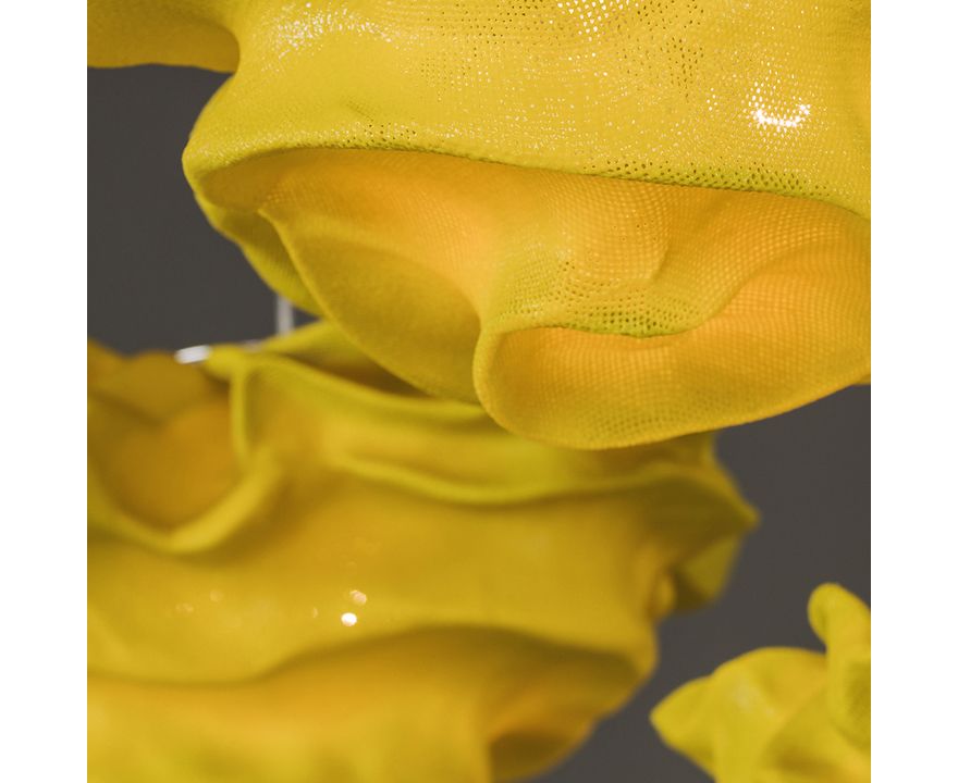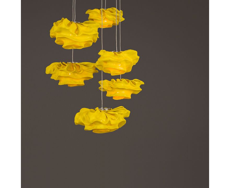 Яркая форма, кажется будто она постоянно меняется. Облако кривых, невозможных объемов, где будущее пересекается с настоящим. Уверенные в себе формы изготовлены из самых современных материалов. Подвески объединены в каскад, что отсылает нас к природе и ее жизненной силе.