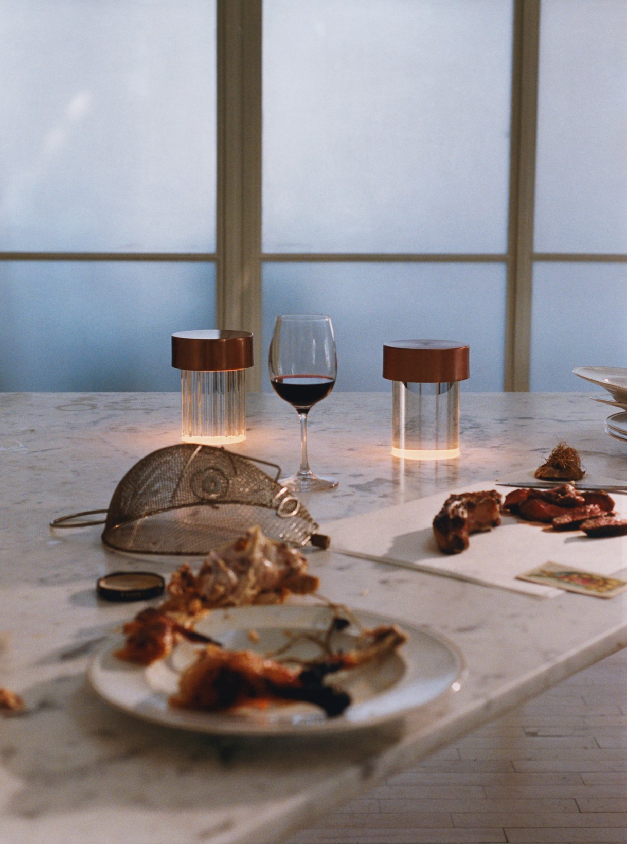 Художница Лайла Гохар и фотограф Чжи Вэй создают один из тех сюрреалистических моментов в конце ночи, когда линии вокруг вещей начинают растворяться. Друзья сидят среди мятых скатертей и почти съеденных десертов. Last Order, новая лампа Майкла Анастасиадиса, окутывает эфемерную сцену теплым сиянием.