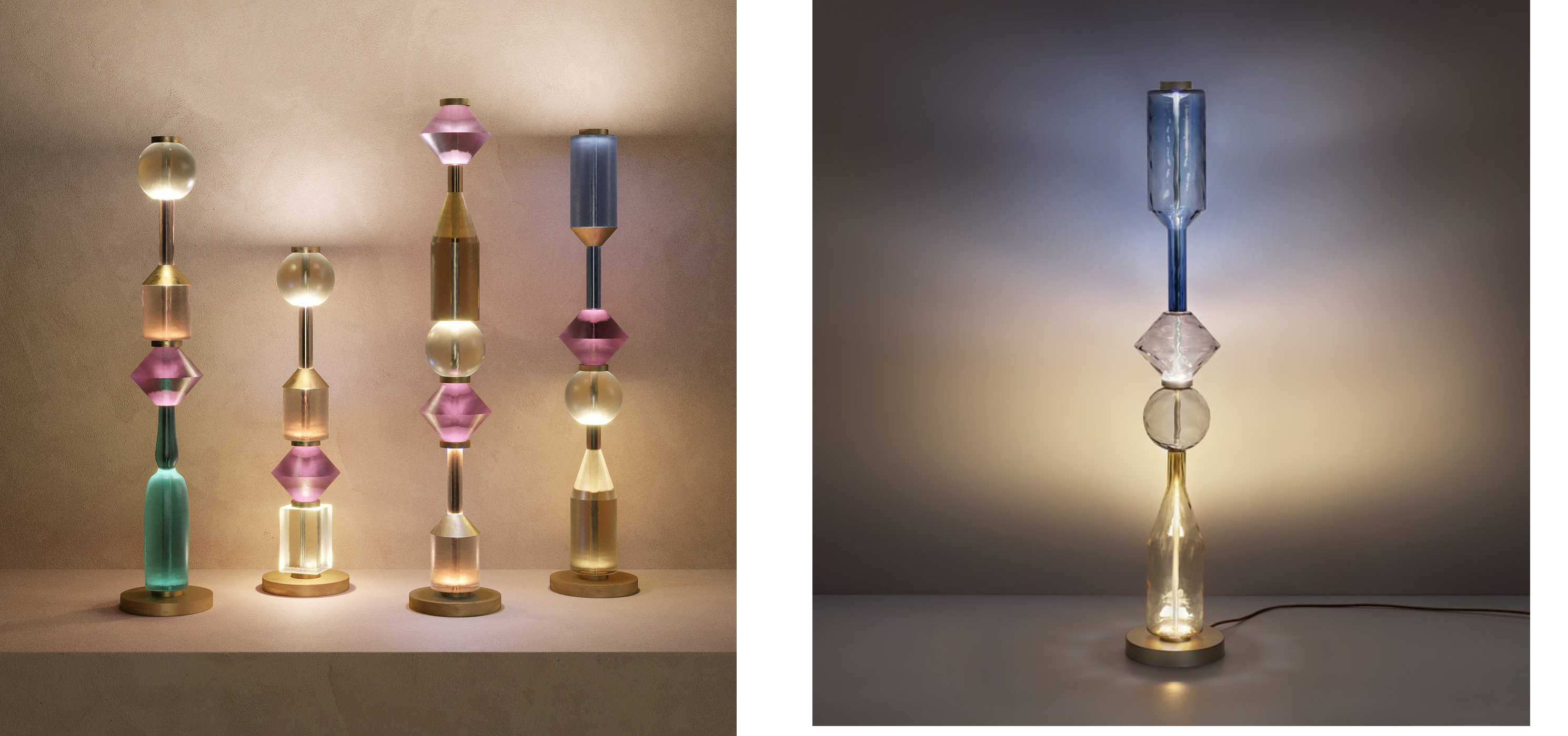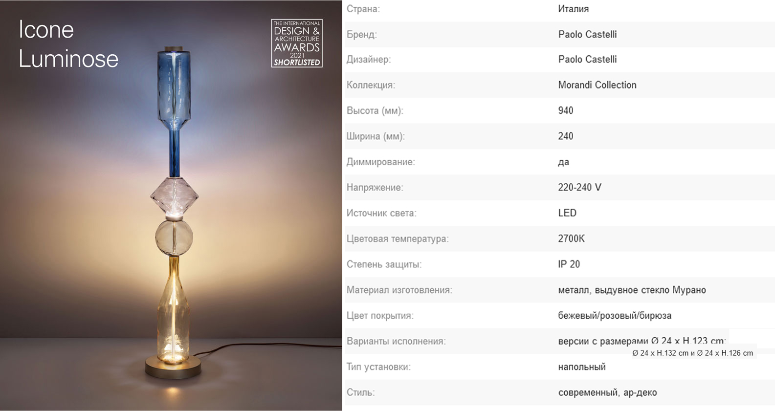 Декоративные лампы, рожденные из случайного перекрытия бутылок, которые художник Джорджо Моранди использовал для своих работ. Искусство, дизайн и умелое мастерство воплощают в жизнь серию великолепных торшеров и настольных ламп, выполненных в четырех различных композициях. Бутылки выдуваются вручную на острове Мурано, нежные цветные стекла с использованием старинных технологий выделяют нежные цвета и оттенки, делая луч, который пересекает их, мягким и уникальным благодаря самым современным светодиодам.
