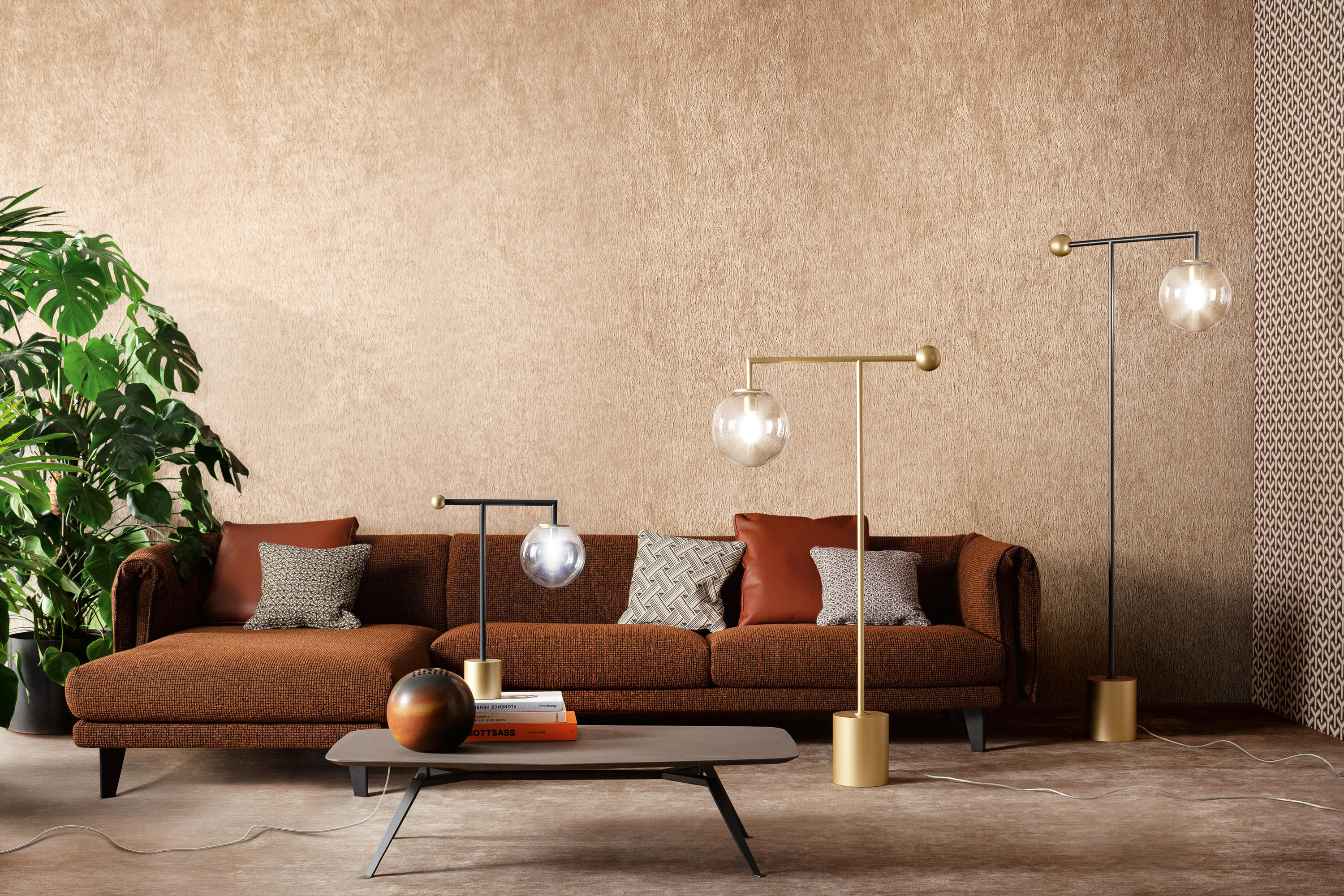 Коллекция светильников Sofì - это дань древнему искусству выдувания стекла: отсылка к ремесленным венецианским традициям, которые веками сохранялись мастерами-стеклодарами. Ключевым элементом Sofì является сфера из боросиликатного стекла, которая имеет теплую отделку янтарного цвета и сочетается с цилиндрическими элементами из полированной латуни. В коллекцию входят различные модели: потолочный светильник с металлической структурой с 7 или 10 сферами, подвесной светильник с 1, 5 или 7 сферами, торшер, две настольные лампы (меньшая без стеклянных сфер и более высокая со стеклянным шаром) и бра.