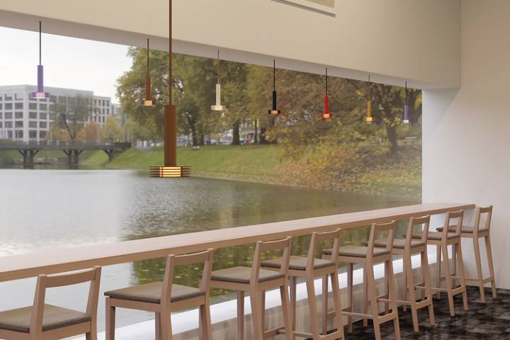 Lumo — классический кулон конусообразной формы, отлитый из цельного куска алюминия. Плафон толщиной шесть миллиметров элегантно завершается красивым полным радиусом. Рассеиватель незаметно вмонтирован в плафон таким образом, чтобы избежать бликов. Lumo может быть собран вместе с различными креплениями для перил, образуя прямые, круглые, треугольные или четырехугольные конструкции, умело подвешенные с помощью тросов креплений.