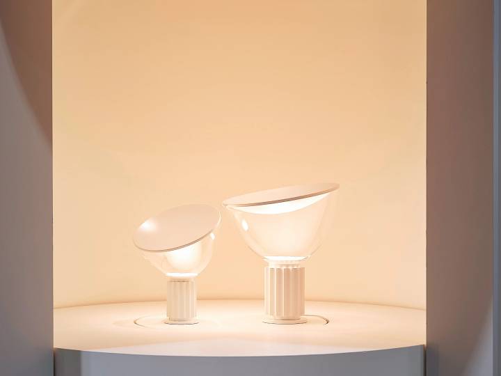 Taccia, культовая лампа Achille и Pier Giacomo Castiglioni, представлена в специальном издании с матово-белой отделкой, а известная люстра 2097 блистает в увеличенной модели.
