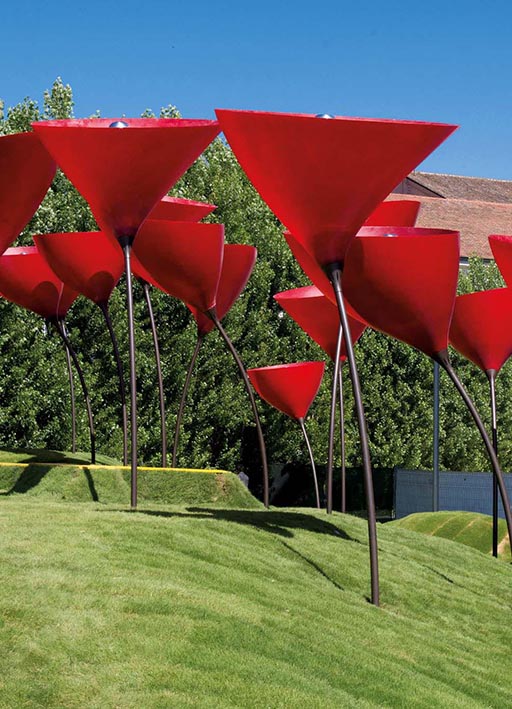 Степень защиты IP55. Светильник выполнен из ярко красного диффузора в форме бутона на тонком слегка изогнутом металлическом стержне. Две версии с вариантом высоты 393 см и 435 см.
