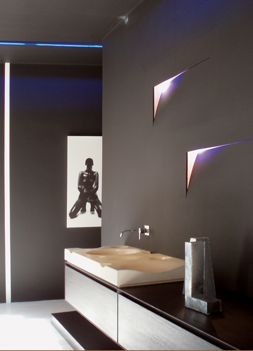 Светильник представлен в двух версиях: щель с правой стороны и щель с левой стороны. В конечном результате получится отрезок стены, вырезанный и мягко отступающий внутри, как бы создавая нишу, из которой возникает свет. Комплект поставки включает источник света блок питания и трансформаторы.