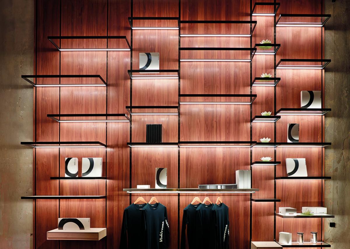 Это не просто настенный светильник, это отдельные светящиеся полки или даже целый стеллаж с подсвечивающийся полками. Особая система освещения с электрическими вертикальными стержнями (montantelettrico) для внутреннего использования частных и коммерческих пространств. Продукт изготовлен из специального проводящего сплава. Доступны полные стеллажей различных конфигураций и размеров.
