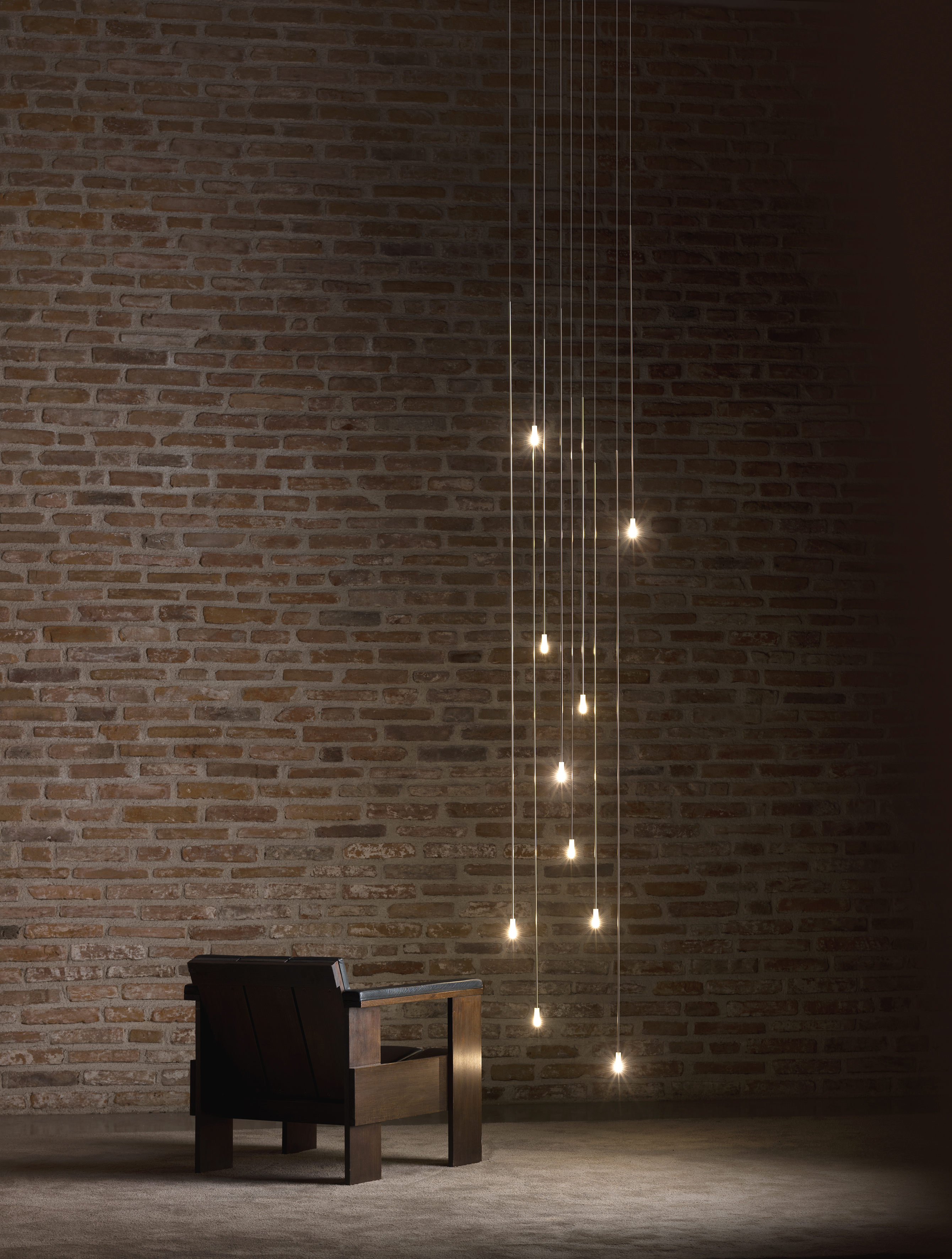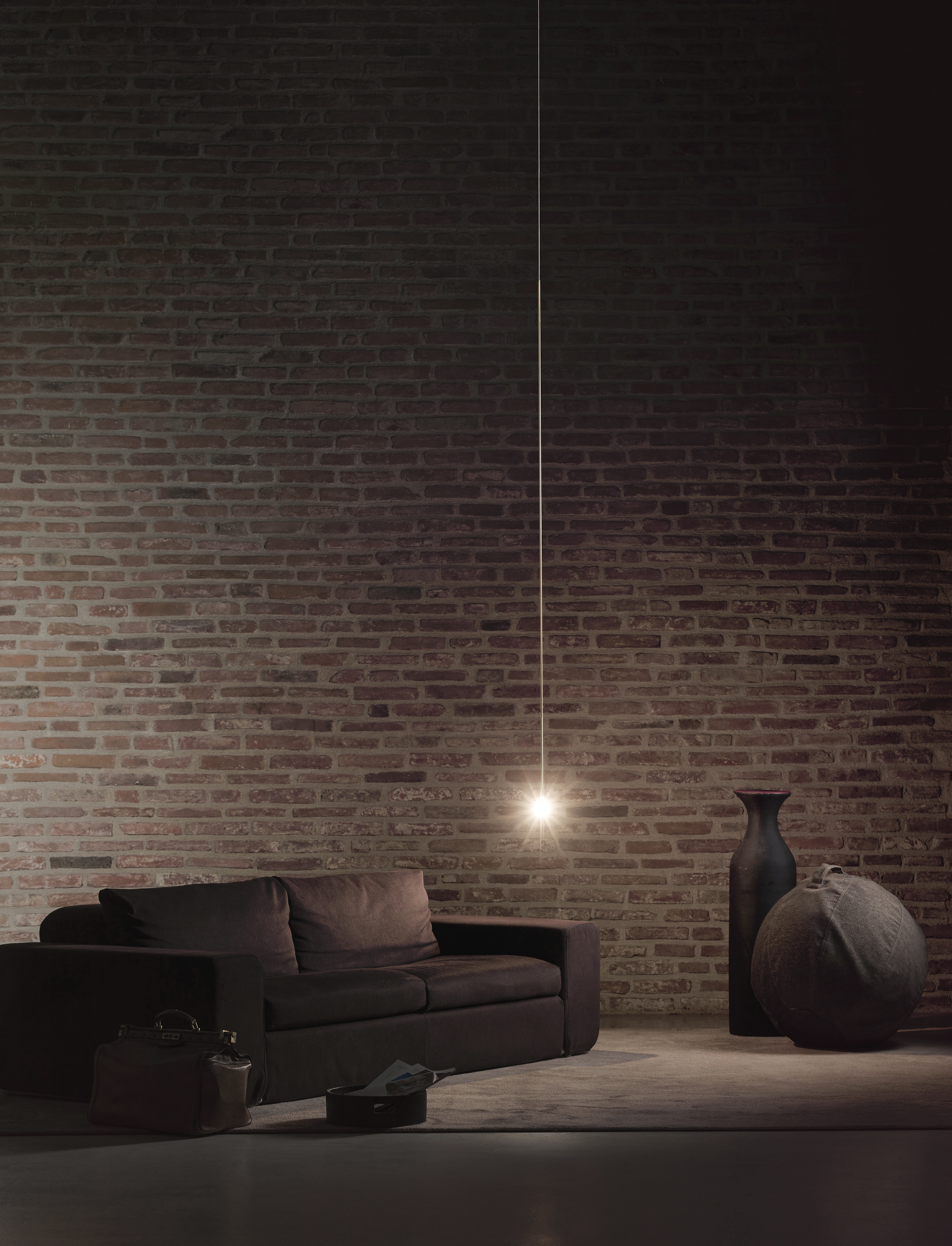 «Vieni Giù!» - это стержни, подвешенные на тросе или потолке, смонтированные из различных хромированных материалов, которые освещают каждый уголок жизни, подобно люминесцентному дождю, благодаря светодиодному двойному штырю, покрытому боросиликатной капсулой. Он доступен в длинах 30, 40, 50, 100, 150 и 200 см и может быть изготовлен в виде единой лампы или в виде каскада различных элементов.