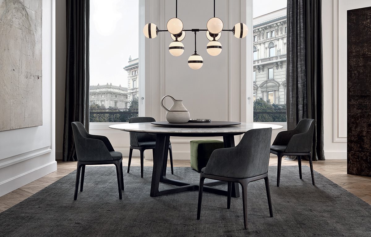 Коллекция Peggy интерпретирует полярность черного и белого с легкостью рационального и элегантного знака. Доступный с одним или двумя источниками света, он соединяет воздушную и гармоничную конструкцию с легкостью выдувного белого стекла с решающей линией благодаря черной металлической свинцовой структуре. В самом важном варианте расположение сфер создает идеальный баланс между подвесными полными и пустыми объемами, и действует как центральный штырь освещаемого пространства, в том числе благодаря его размеру, который достигает почти двух метров в длину.