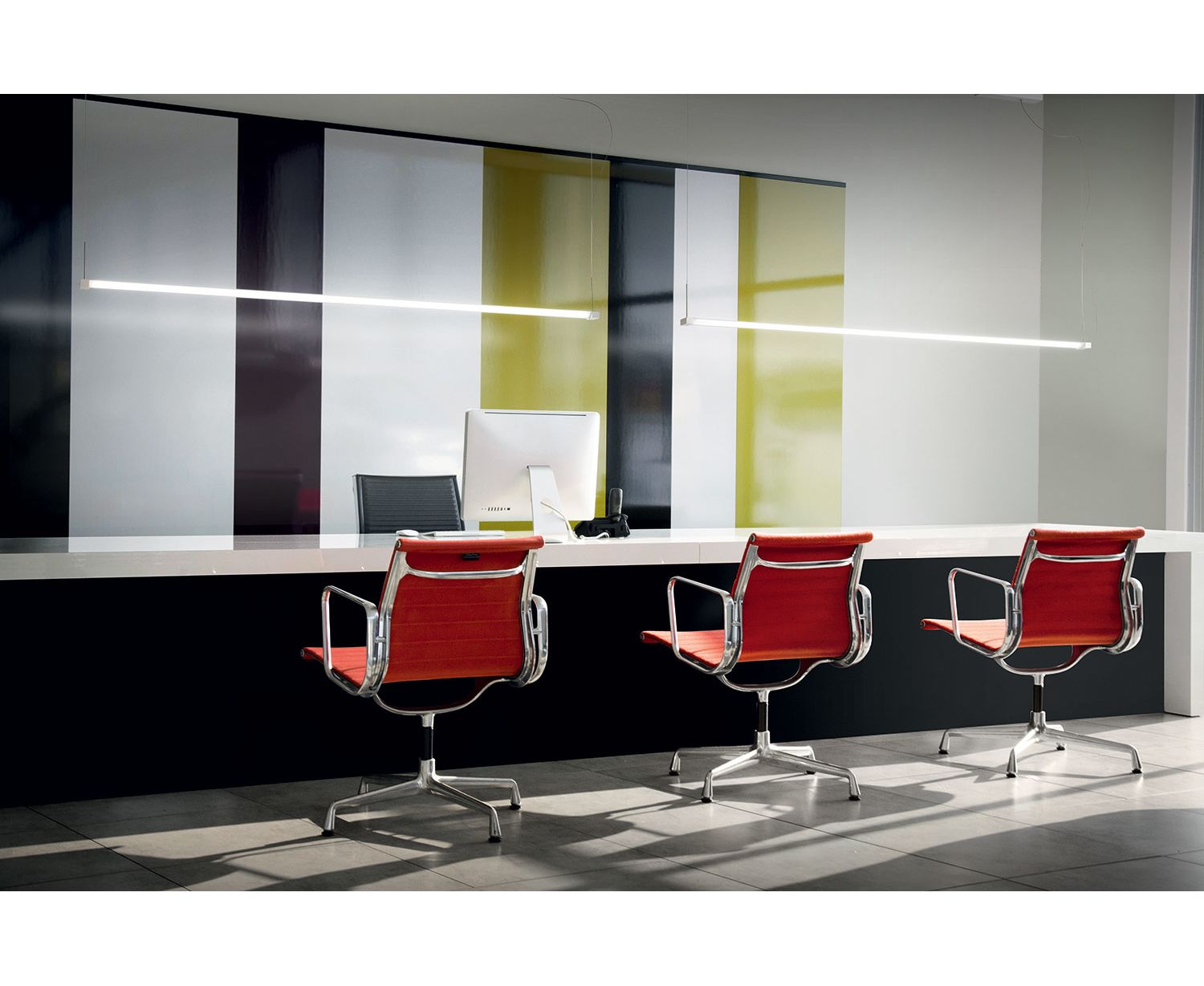 Коллекция Pivot для внутреннего освещения помещения включает в себя напольный светильник, три бра различной длины для размещения на стене и на потолке и подвесной светильник; длина бра может быть изменена по заказу клиента. Светильники предназначены для интерьеров и выполнены из алюминия белого цвета, оттенка серого антрацита и светло-серого цвета. Свет подается через светящиеся стержни. Цоколь торшера и подвесного светильника