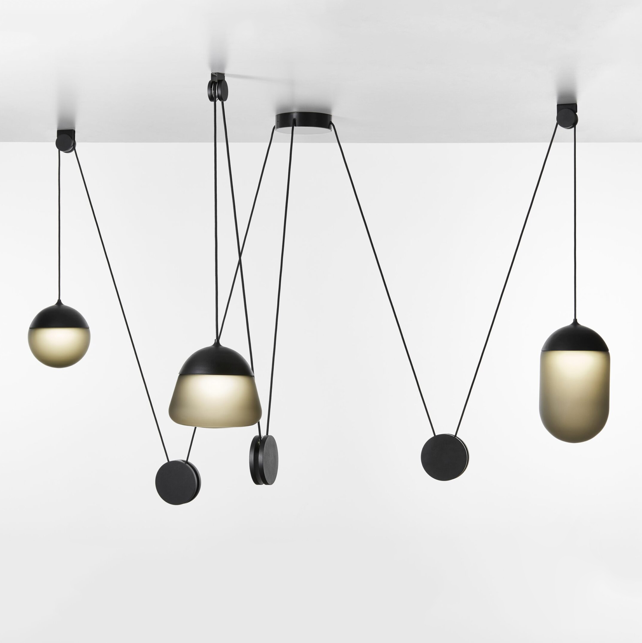 Сфера, конус и капсула: это три элементарные геометрические формы, которые определяют стеклянный светильник Planets. Благодаря замечательному уровню вариативности, основанному на основных правилах физики, коллекция предлагает беспрецедентную свободу в освещении внутренних помещений, которая не заканчивается установкой, поскольку простая система шкивов и противовесов обеспечивает легкую регулировку по высоте.