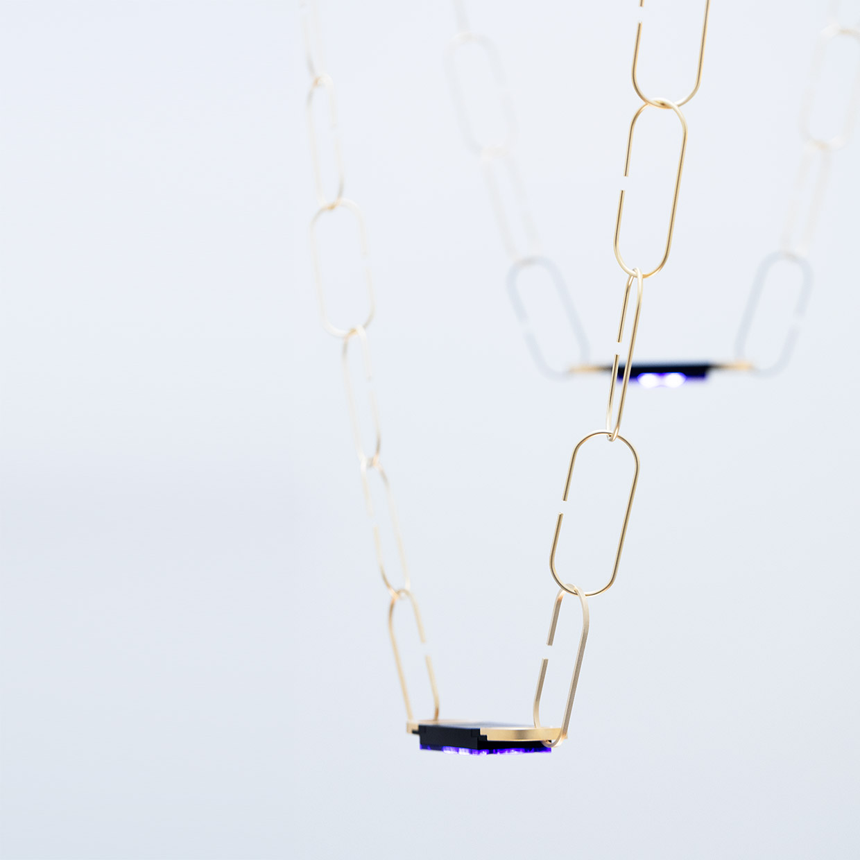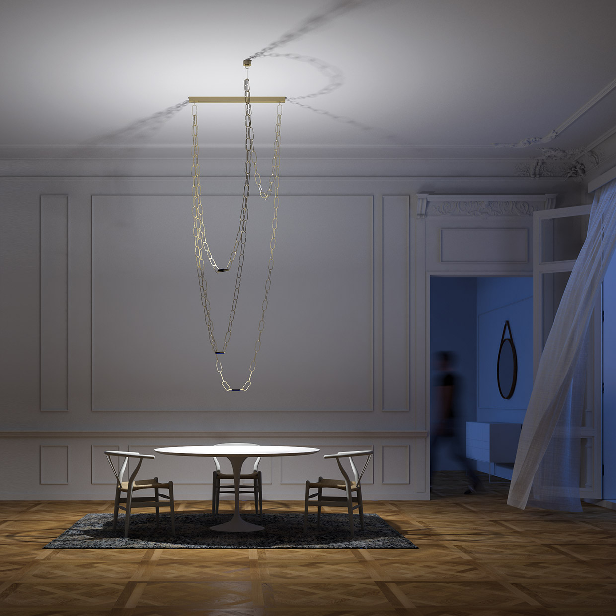 Вся коллекция, которая включает в себя 6 вариантов модели, выполнена в виде большой золотой цепочки, которая изгибается под собственным весом, рисует идеальную параболу и питает световую сетку в нижней точке. Золото - это металл, метафора энергии и желания. Он считается самым идеальным металлом для проведения по нему электрического тока.
