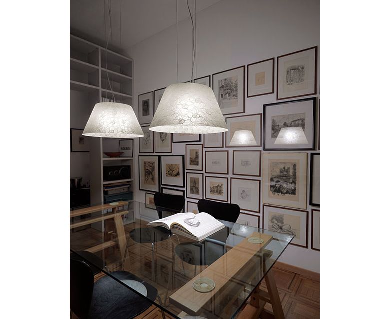 Кружева и стекловолокно Valencienne используются вместе для создания двумерных поверхностей. Уникальный рельеф и прозрачность ткани сочетаются с высокой устойчивостью стекловолокна к поломкам и повреждениям. Эта оригинальная техника, созданная Antonangeli, позволила получить объемы освещения с различными формами и применениями абажура, которые доступны в двух измерениях для создания напольных, настольных и подвесных ламп.