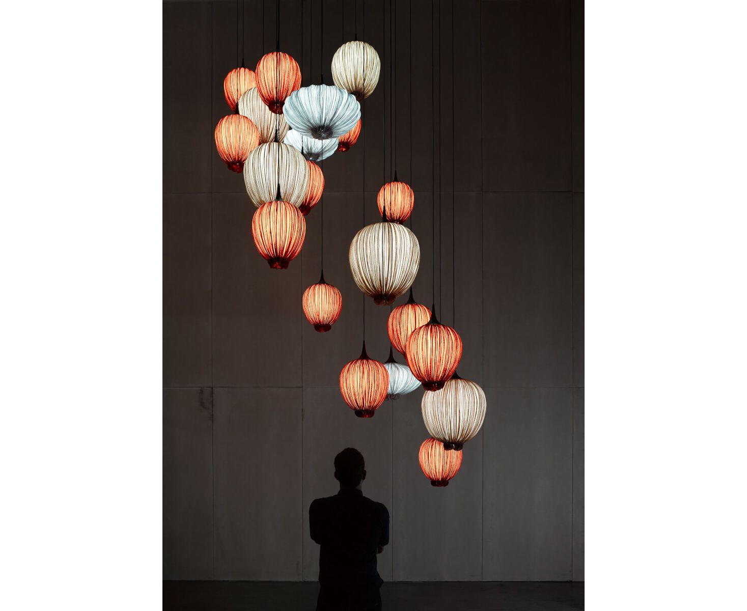 Подвесные светильники Suuria Son представляют собой тонкие плавающие шары, образованные из стилизованной формы цветочных луковиц. Меньше, чем Dippa, эти яркие шелковые дизайны доступны как настольные лампы, так и подвесные светильники. Suuria Son добавляет мягкую атмосферу в любое пространство.
