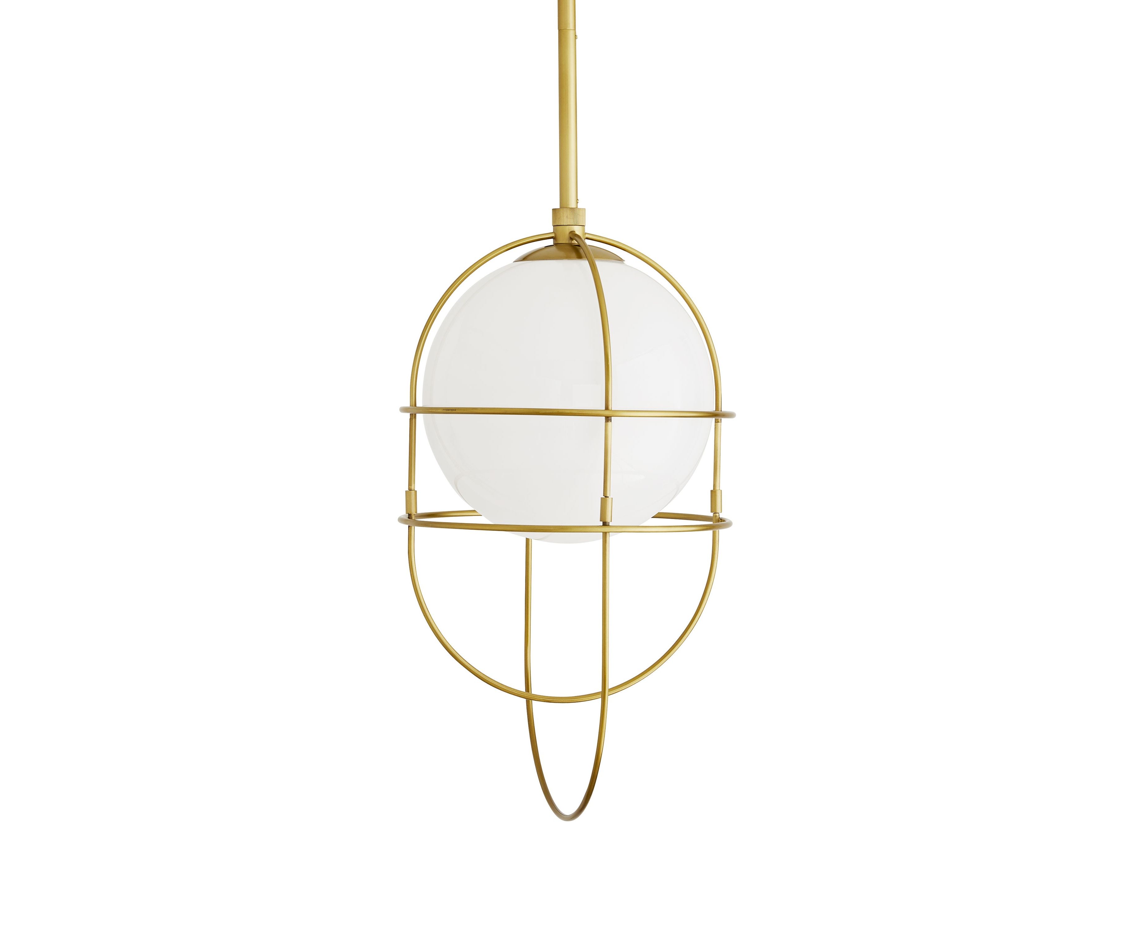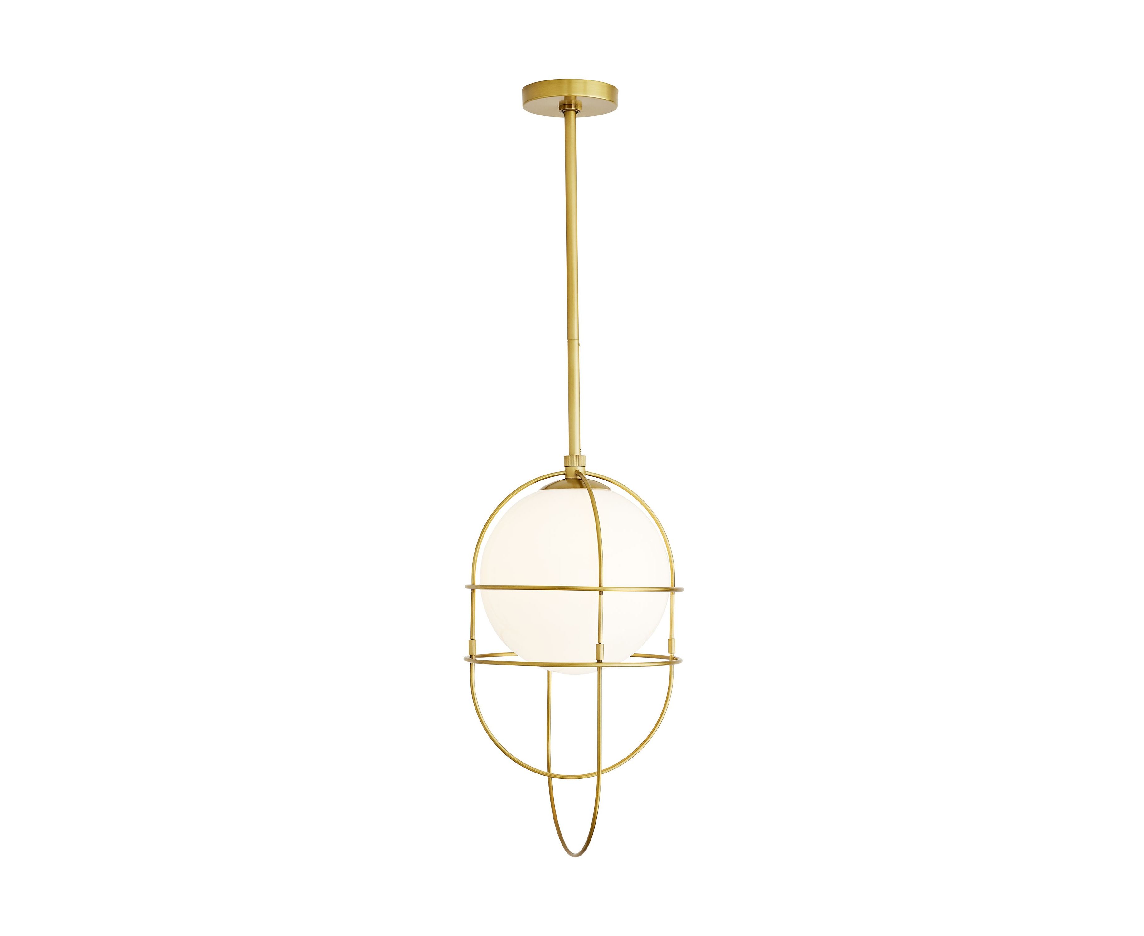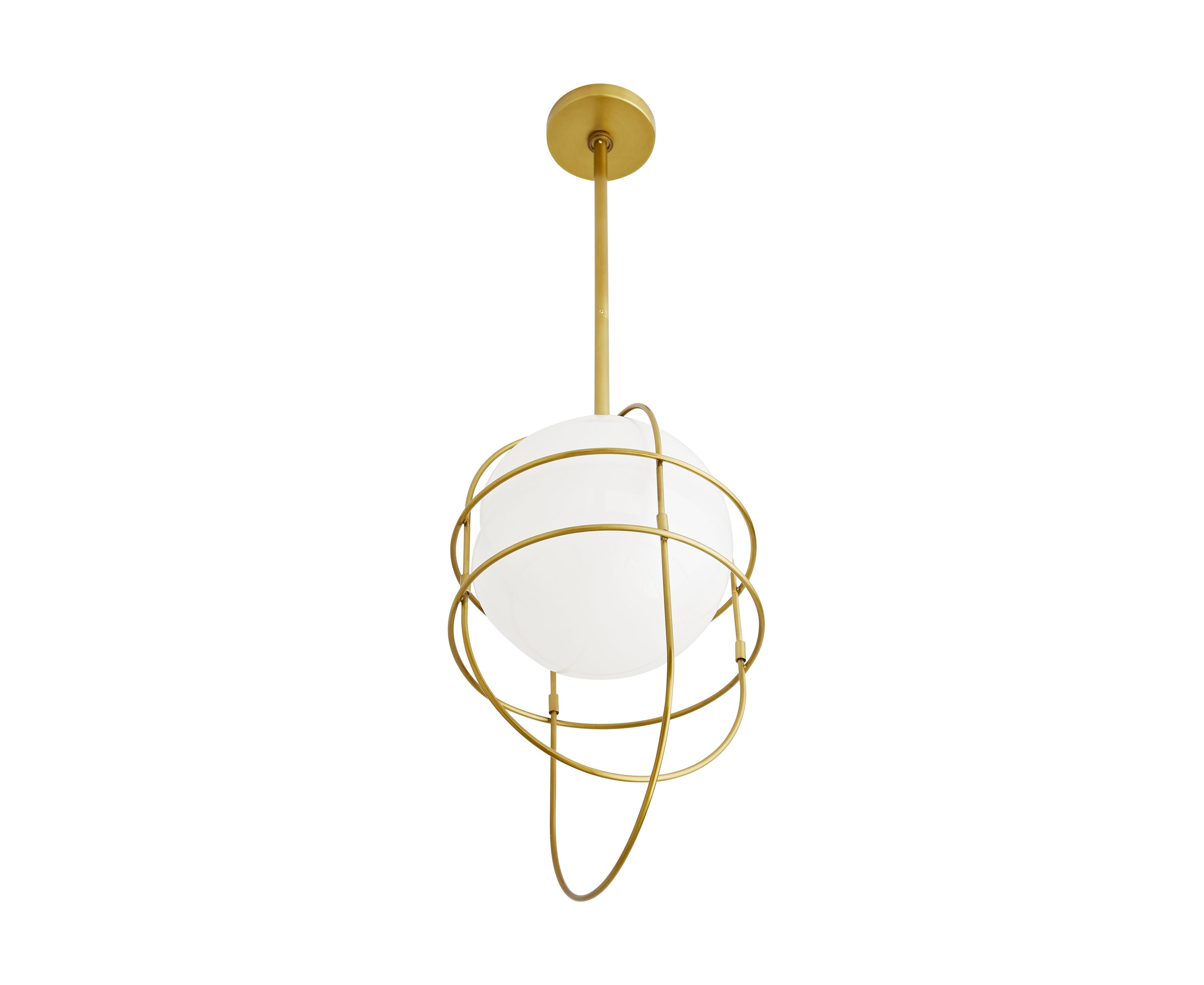 Современное освещение встречает абстрактное искусство с Dolores Pendant. Соединяющие линии антикварной латунной стали драпированы поверх стеклянного шара из опала, создавая основу этого художественного светильника. Аккуратно спрятанный свет придает современный элемент этому свету, обеспечивая при этом свечение. Функциональный фокус при установке над кухонным островом.