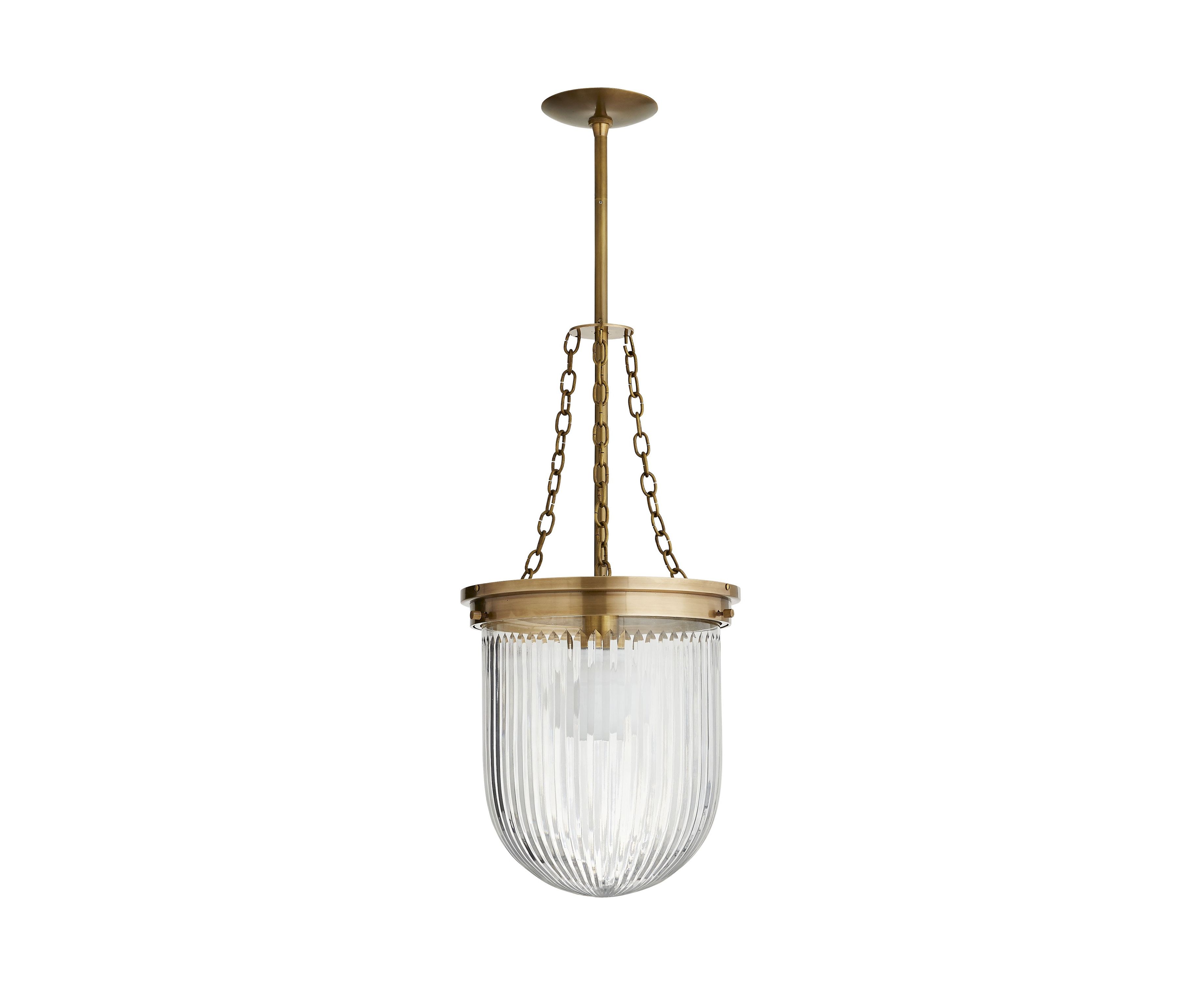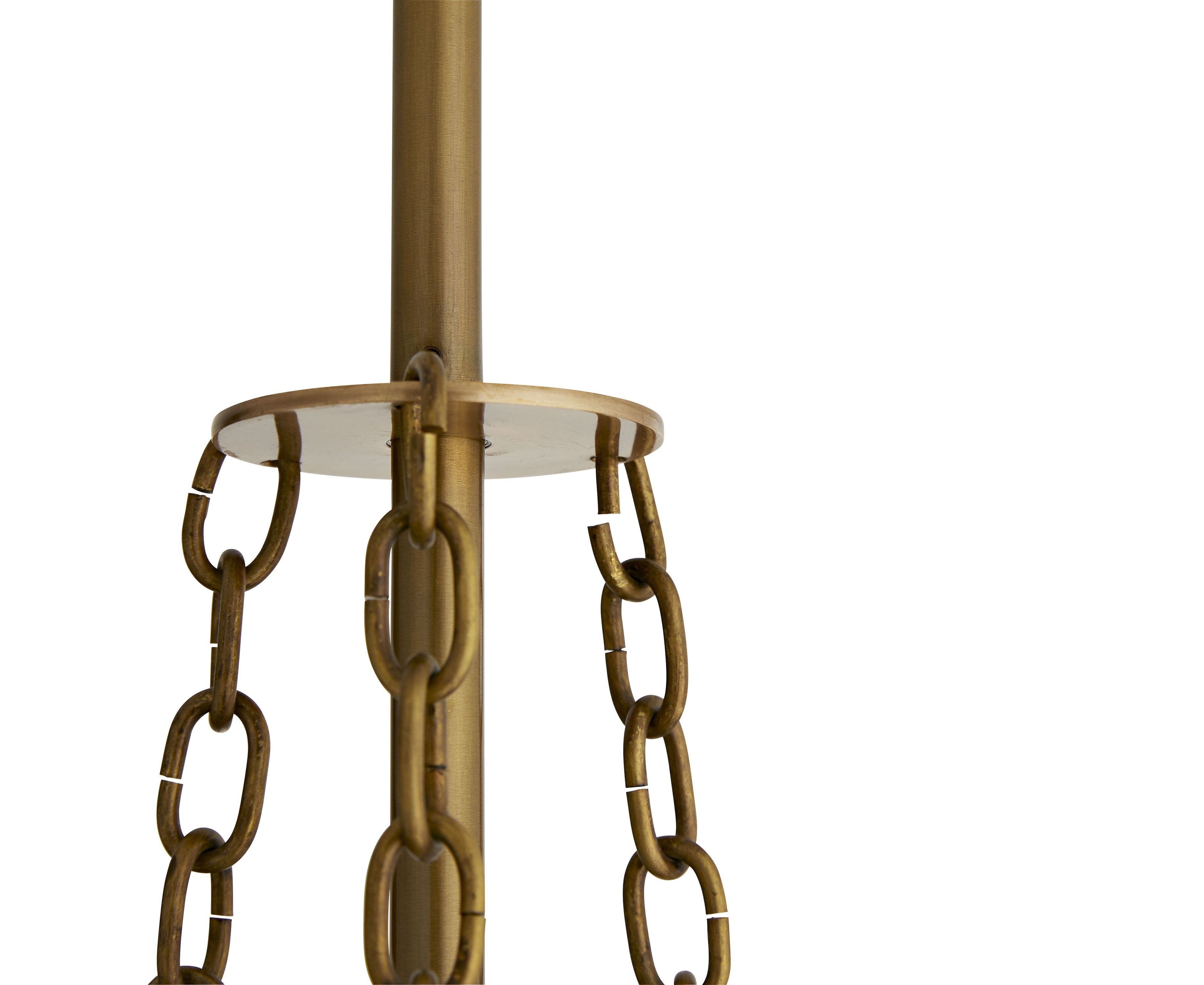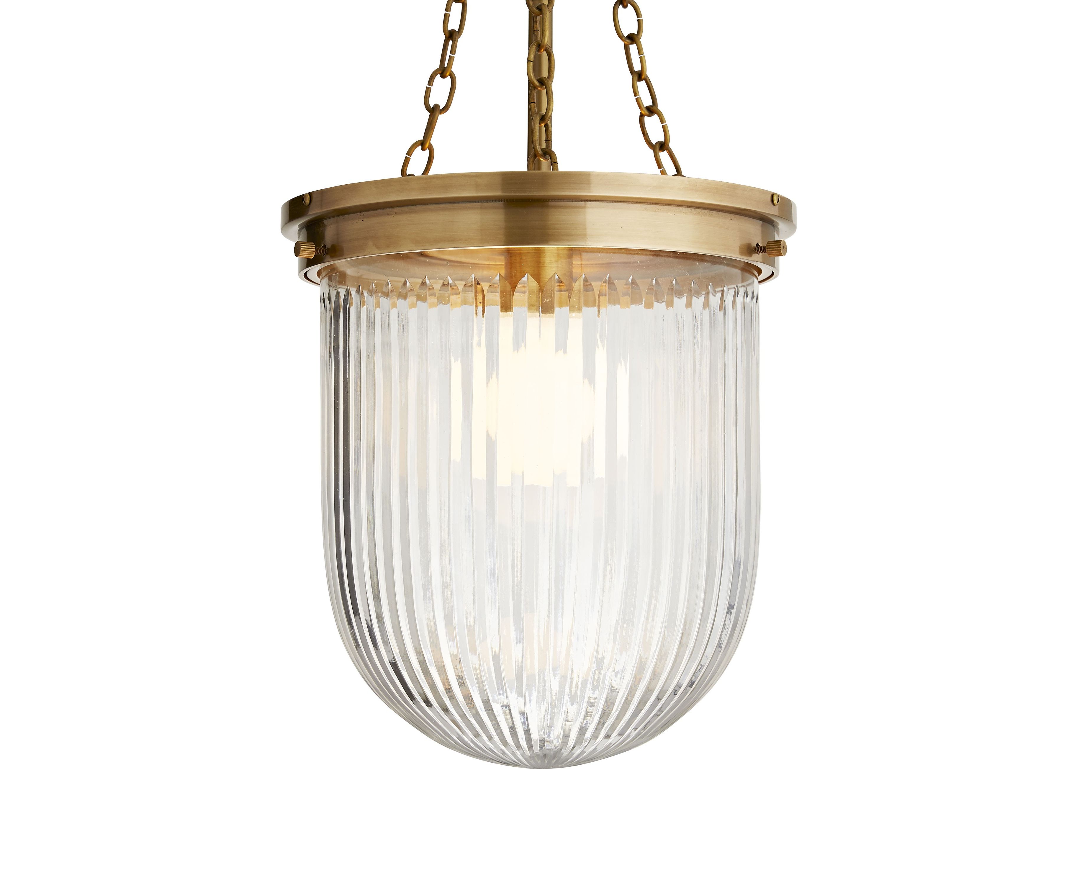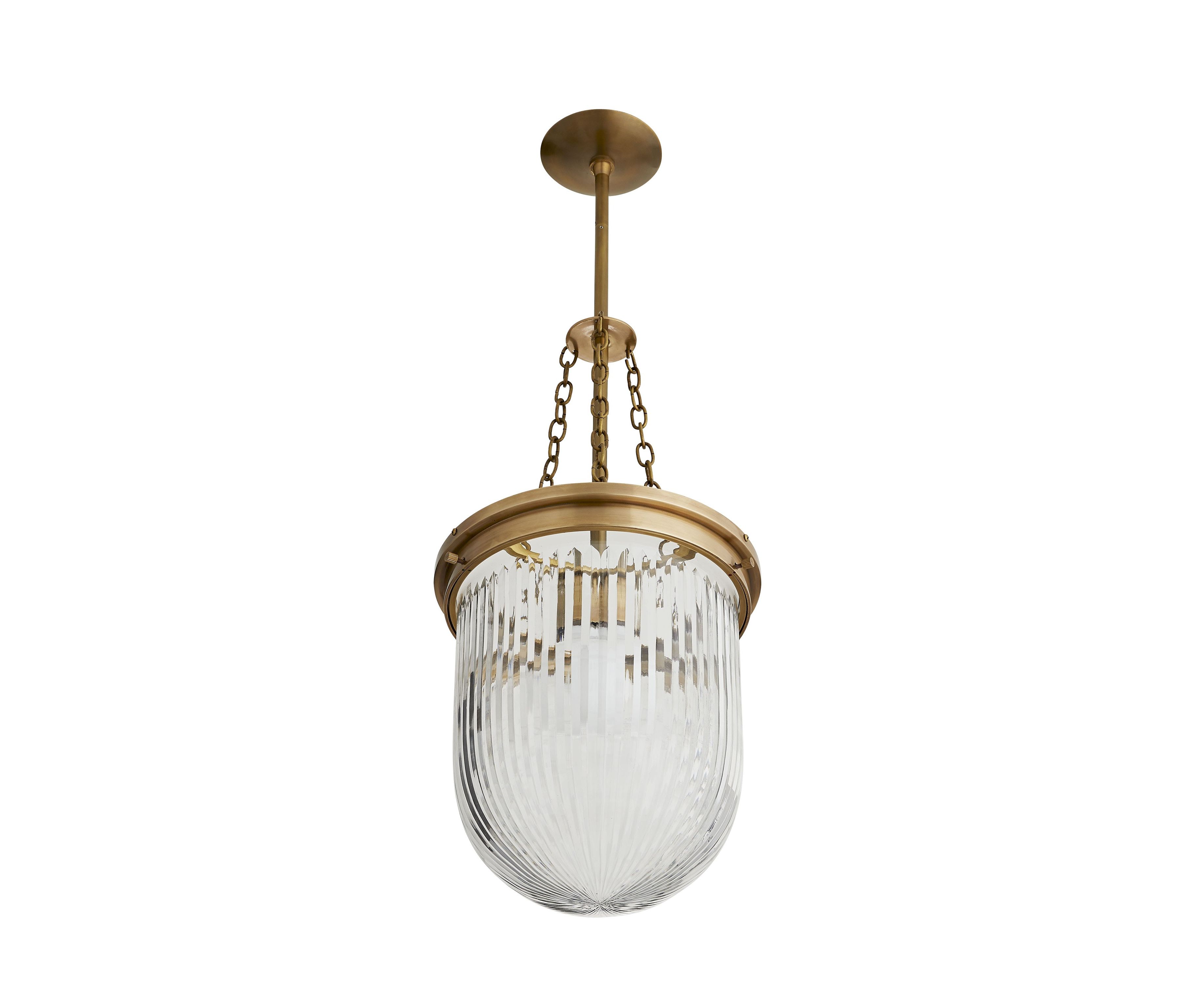 Dooley сохраняет традиции, сочетая классический силуэт с обычными материалами. Элегантно подвешенный на античной латунной цепочке и в такое же отделке - это оттенок прозрачного свинцового стекла, который был выгравирован вручную, модернизируя его изысканную эстетику. Травленое стекло помогает рассеивать свет, в то же время придавая текстурированное качество занимаемому им пространству.
