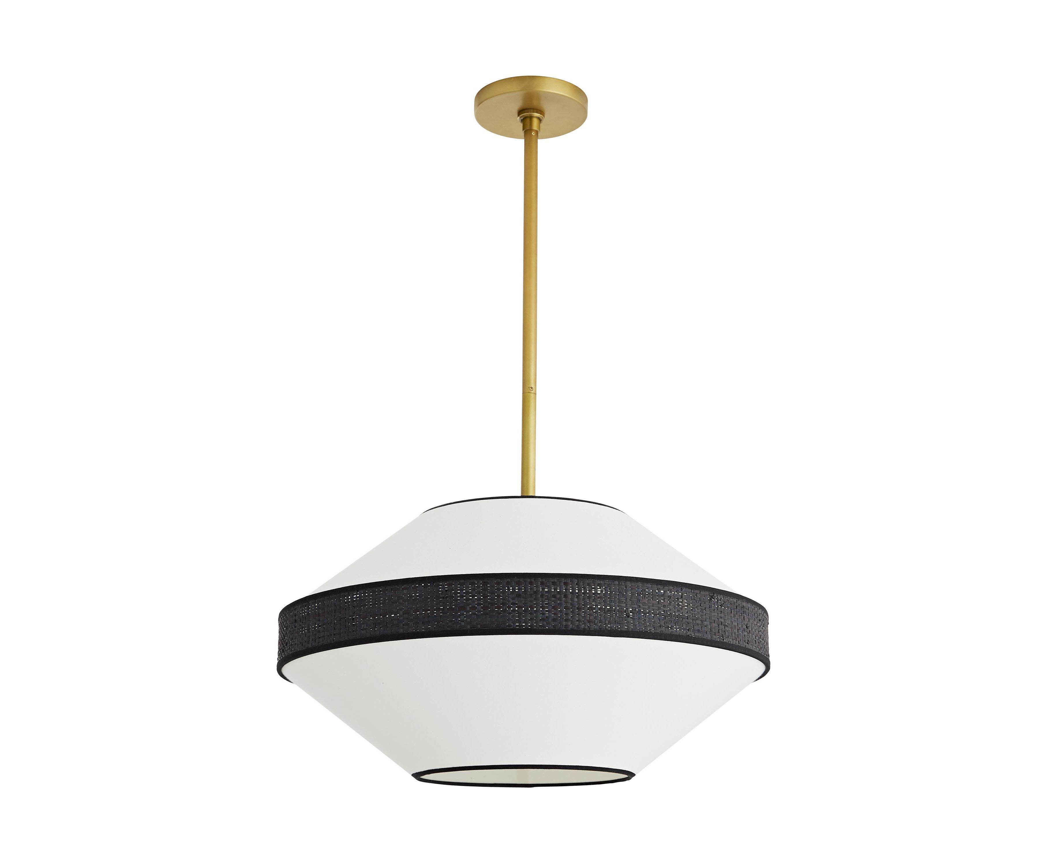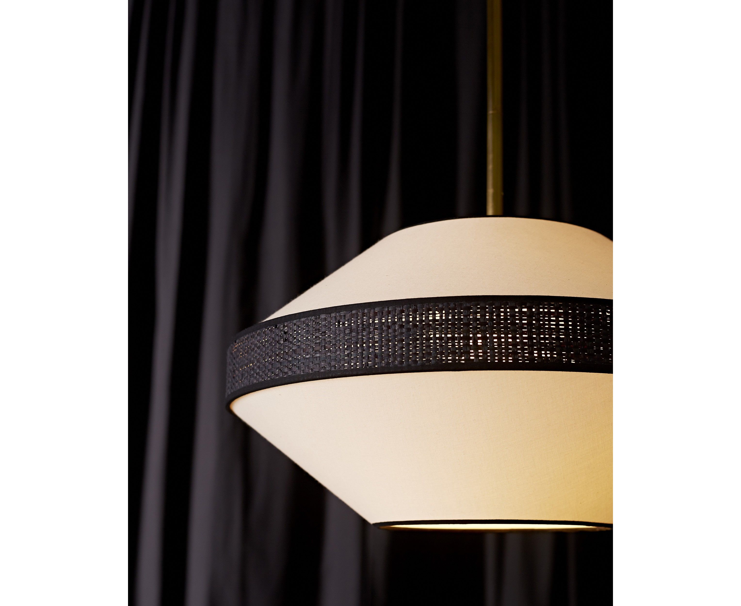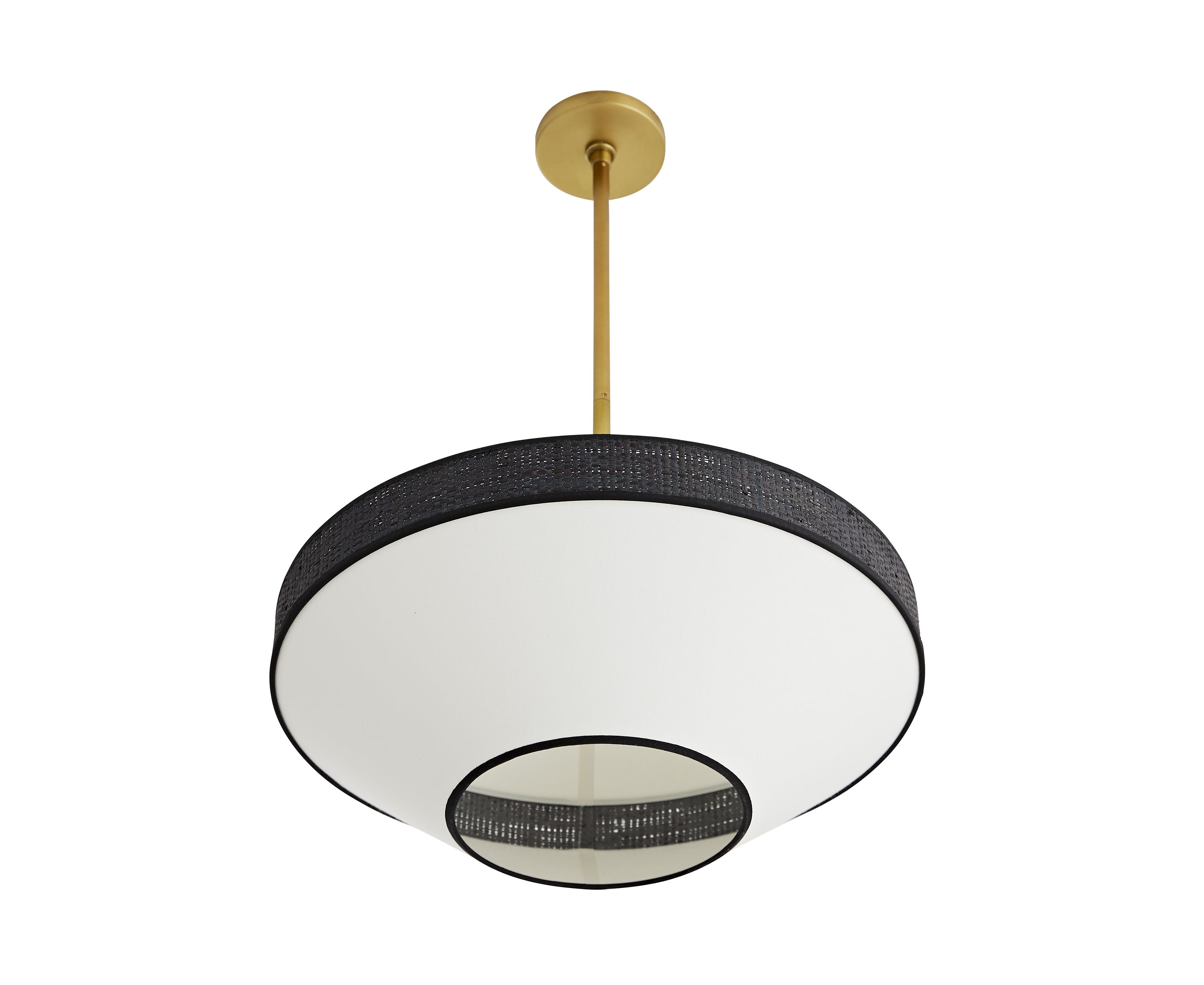 Этот подвесной светильник в форме диска отличается особым и стильным дизайном. Он обеспечивает стиль и содержание, одновременно освещая окружающую среду. Его основа изготовлена из микрофибры с отделкой цвета слоновой кости, которая разбита плетеной полосой из водорослей, окрашенной в черный цвет - возвышенный контраст материалов и текстур. Тканый ремешок позволяет свету блестяще заглянуть в негативное пространство, а тень помогает рассеять его.