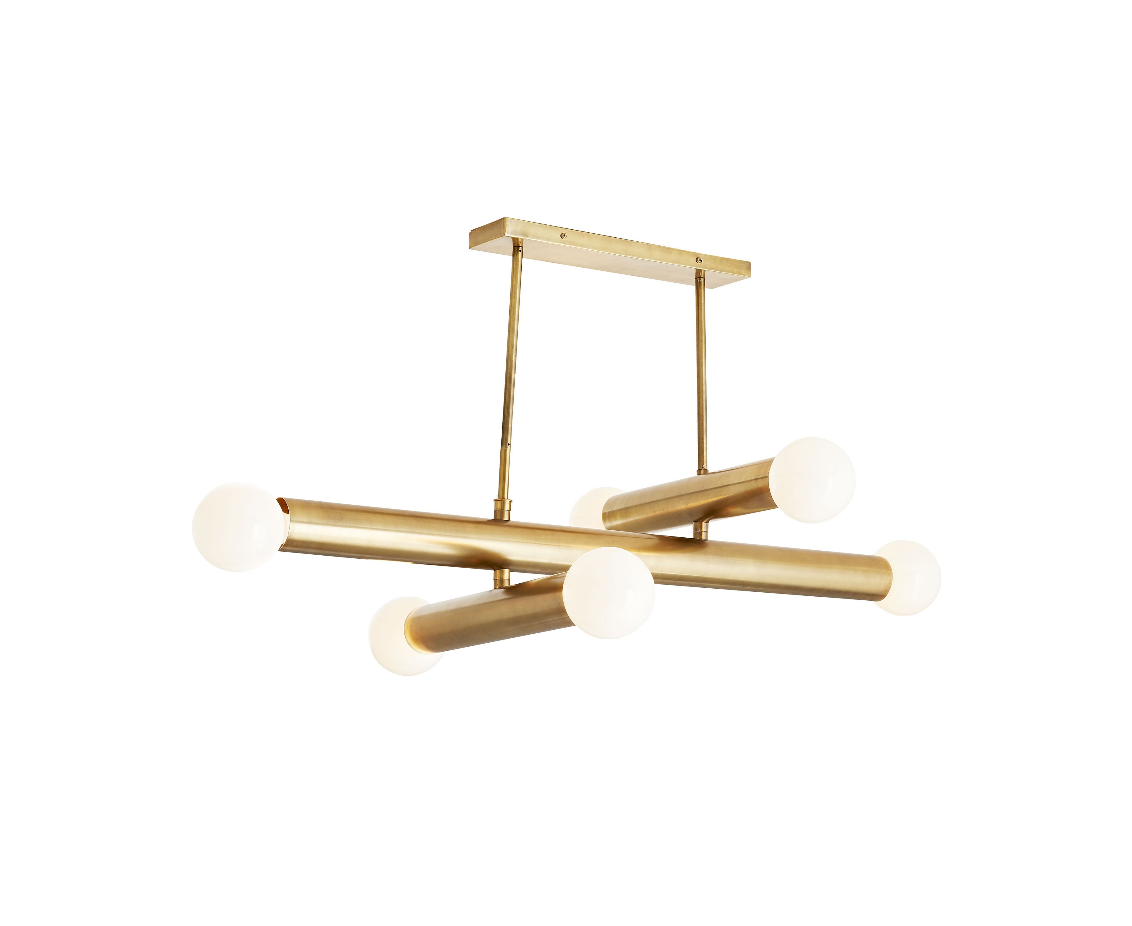 Минималистичный и современный, силуэт этой люстры вне времени. Две трубки расположены на противоположных сторонах линейного железного каркаса, что позволяет свету наклоняться от верхней и нижней плоскостей его прямой поверхности. Полностью отделанная античная латунь, каждая трубка содержит две большие глобусные лампы, создавая дополнительный элемент блеска. Универсальность позволяет ему функционировать в качестве инсталляции для общественных мест, когда светильники повешены в виде нескольких ярусов.