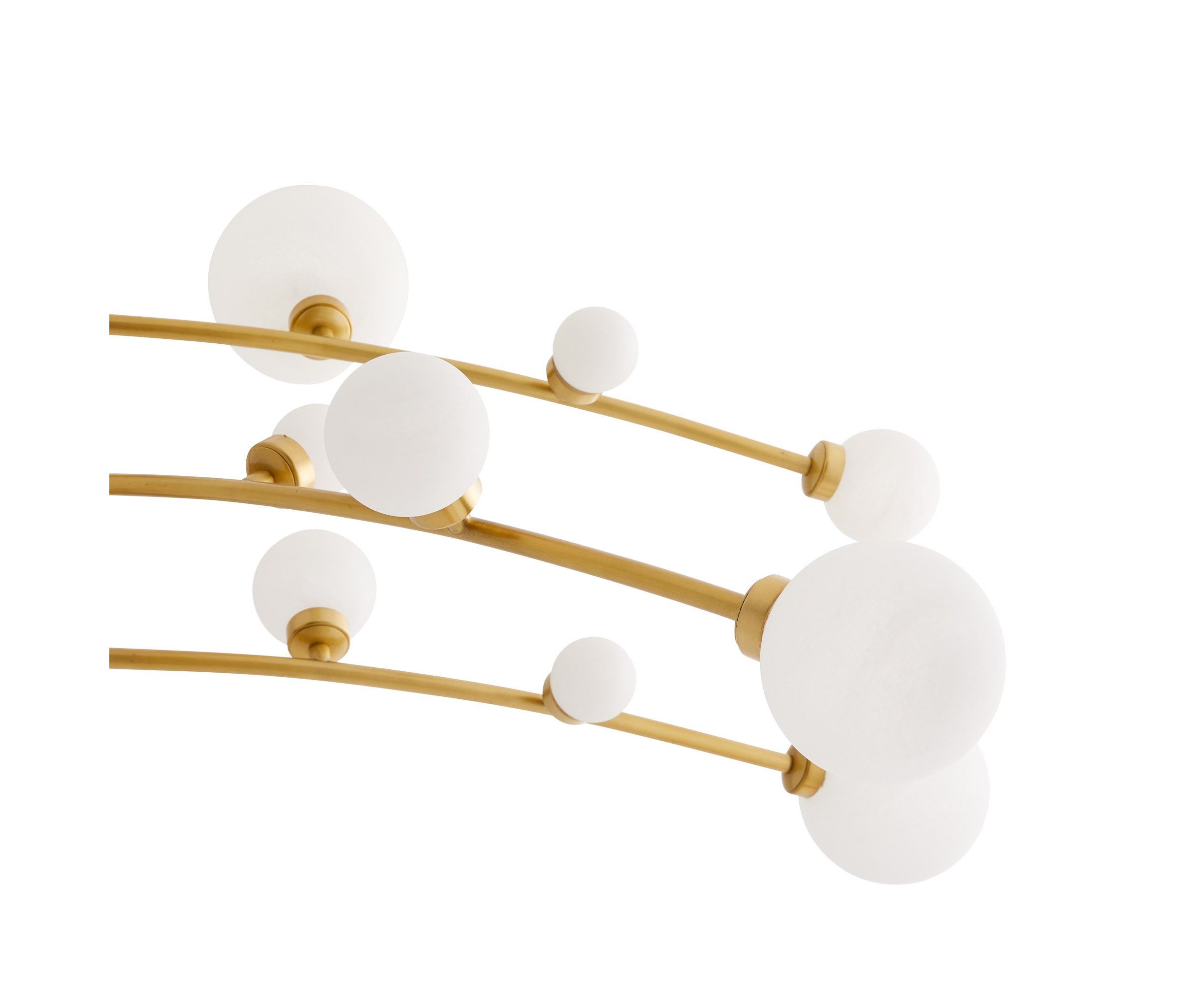 Вдохновленный движениями планет, дизайнер придает пространству вызывающий космический призыв. Пространственное расположение этой современной люстры имеет арочное основание из старинного латунного железа, украшенное спиральными шарами из опалового стекла. В каждом шаре находится встроенный светодиод, обеспечивающий достаточное освещение.