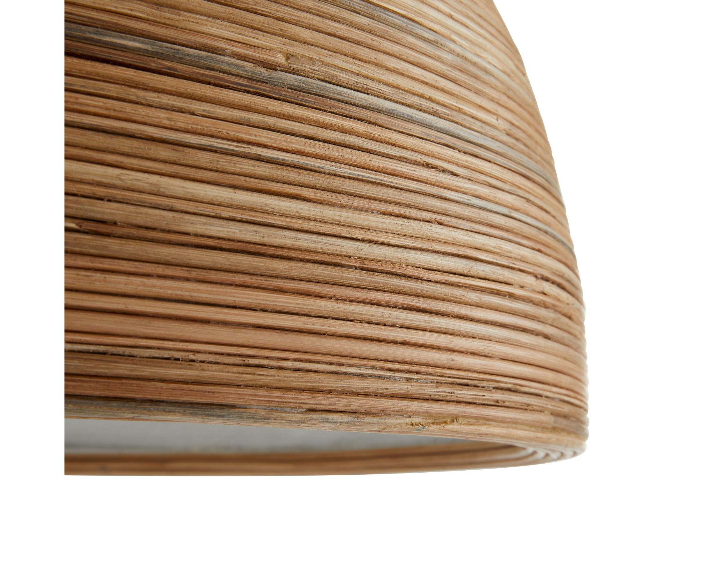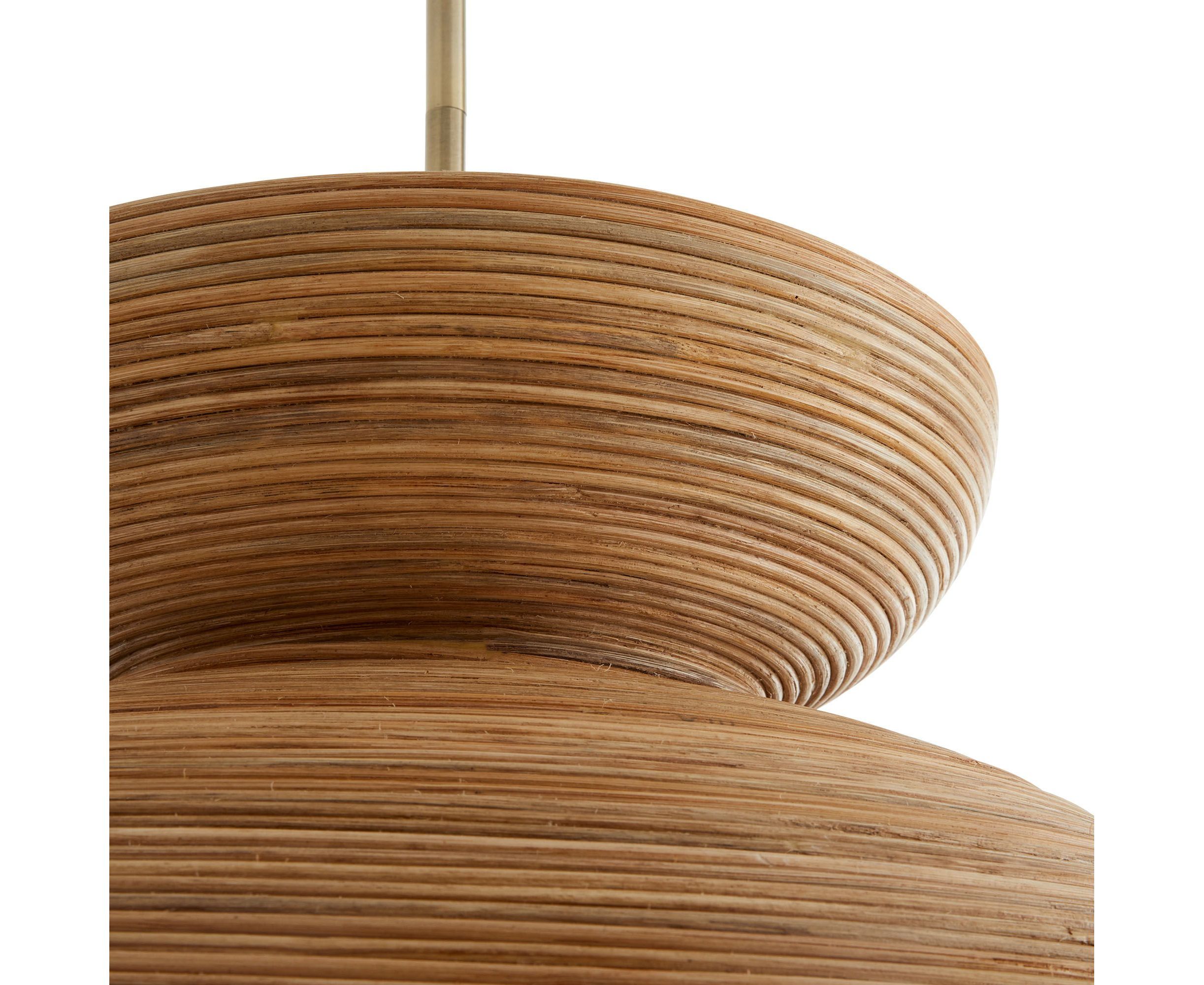 Классические формы середины века органично дополняются натуральными материалами. Силуэт выполнен из концентрических линий плотно обернутого натурального ротанга, в котором находится единственный стеклянный шар. Тонкое матовое покрытие из белой смолы было нанесено на внутреннюю часть абажура для герметизации основы, которая подвешена на старинной латунной стали.