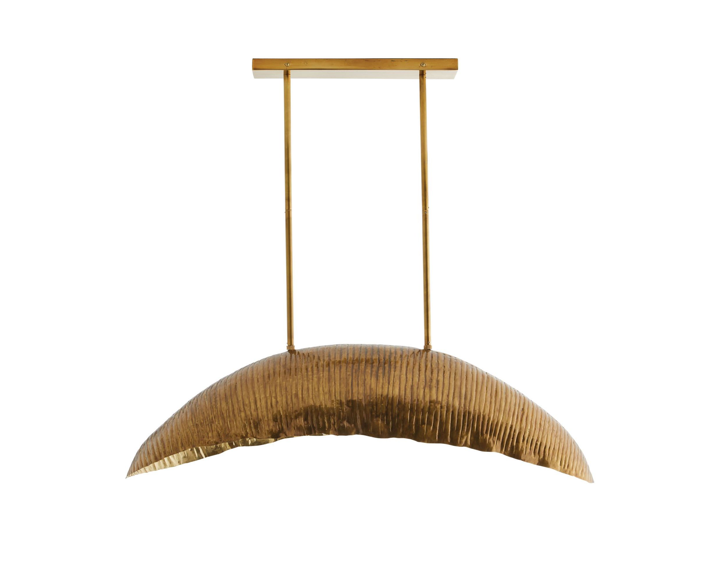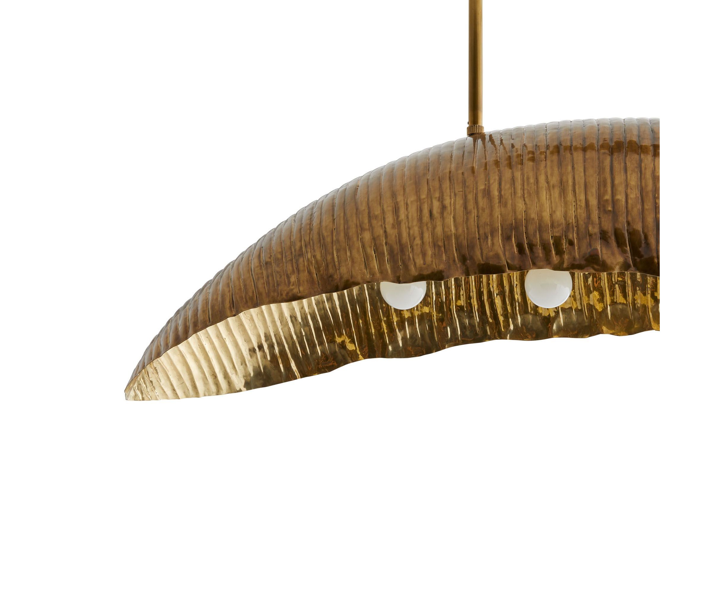 Этот латунный светильник отражает традиционалистско-максималистский дизайн, вдохновленный гигантскими банановыми листьями, произрастающими в юго-восточной азии. Гравированные линии вырезаны на внешней стороне абажура, имитируя прожилки листа, добавляя текстуру и интригу. Снаружи была применена винтажная отделка из латуни, в то время как внутренняя сторона отделана полированной латунью, что придает светильнику классический винтажный вид.