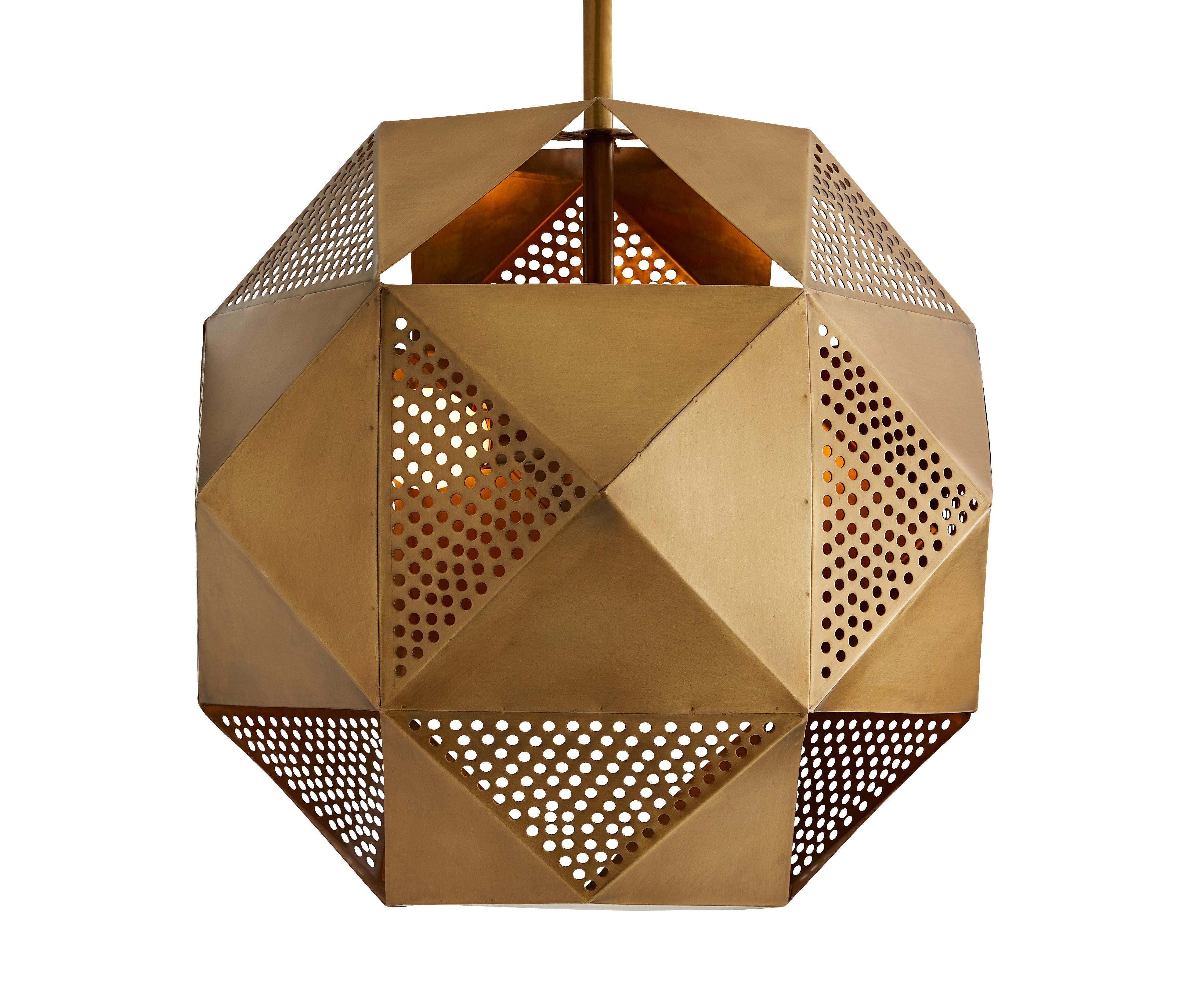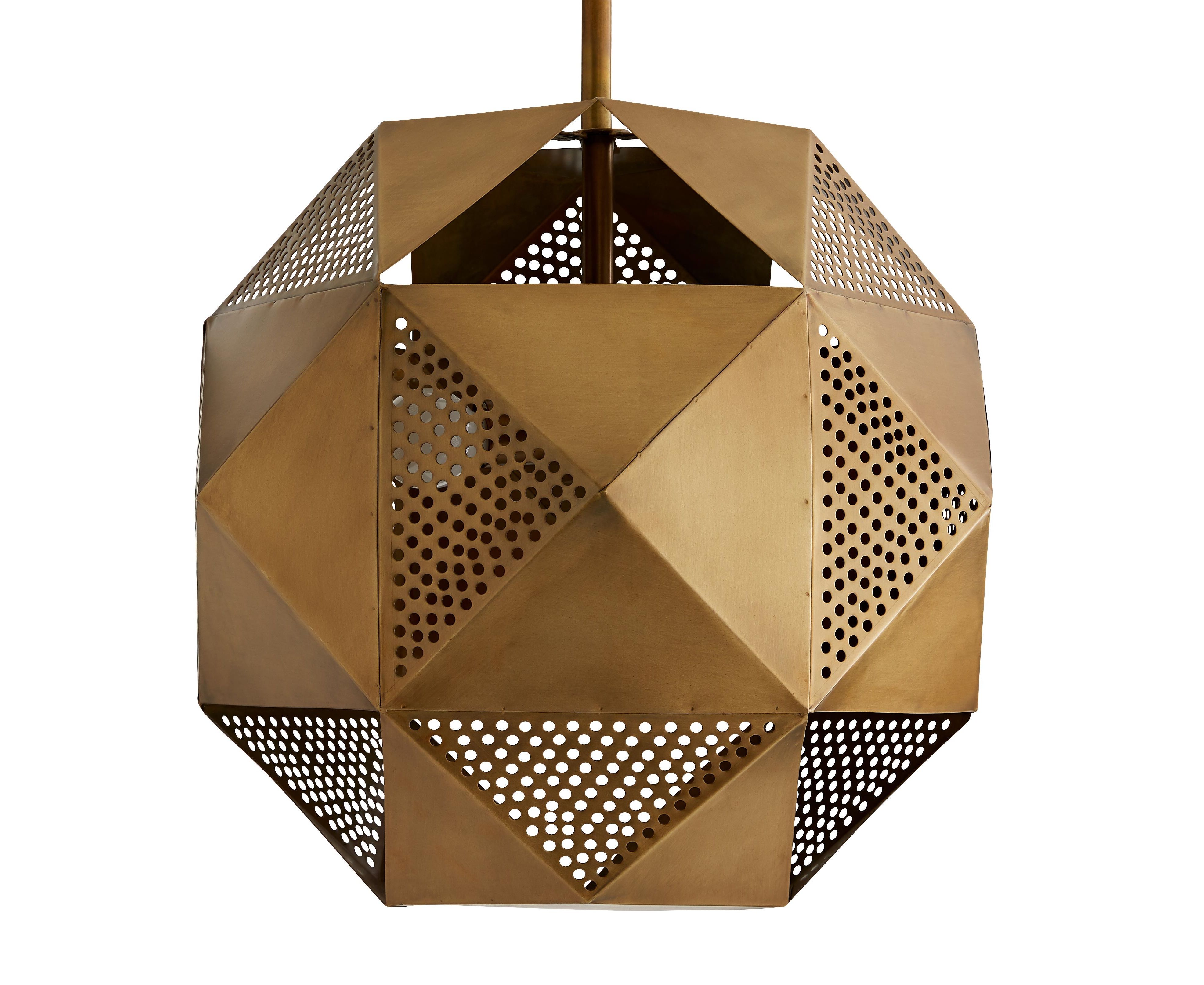 Придайте отчетливую динамику столовой с этим геометрическим кулоном. Многогранная, полуоткрытая форма состоит из перфорированных и гладких железных треугольников, которые работают в унисон, создавая резкий, но дополняющий контраст общей эстетике. Отрицательное пространство и перфорированные отверстия позволяют потоку света проходить через уникальные углы, создавая приглушенный световой пейзаж. Античная латунная отделка предлагает блеск. Одобрено для использования на крытых уличных площадках.