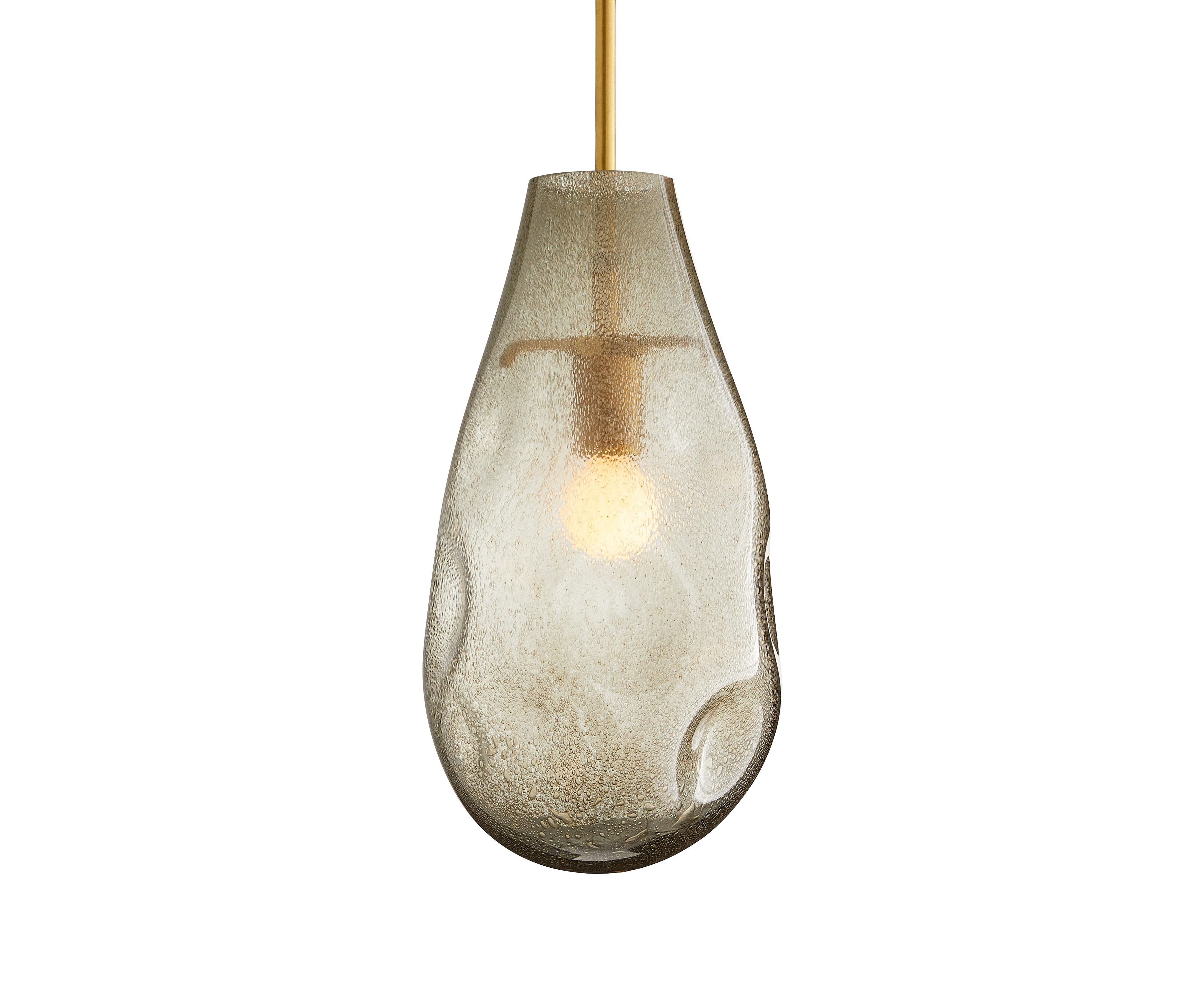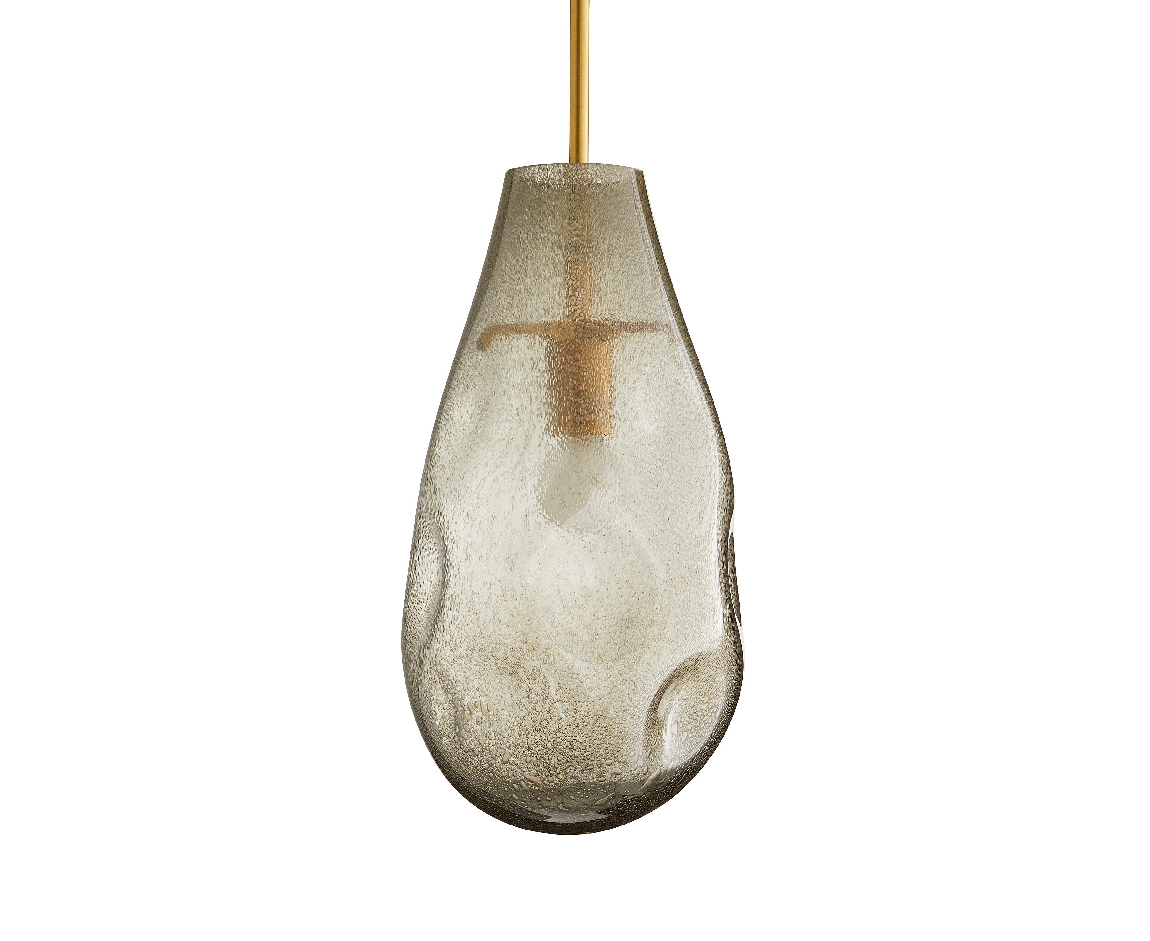 Стекло выдувается вручную, чтобы создать интригующую форму этого закругленного на классическом кулоне в форме капли. Отделка цвета чертополох с металлическими пузырьками подчеркивает смелые ямочки, которые искривляют поверхность и придают фасаду органическое качество. Рассеиватель подвешен на трехстороннем стальном пруте, отделанном античной медью. Из-за природы ручной работы могут возникать различия в форме и отделке. Одобрено для использования на крытых уличных площадках.