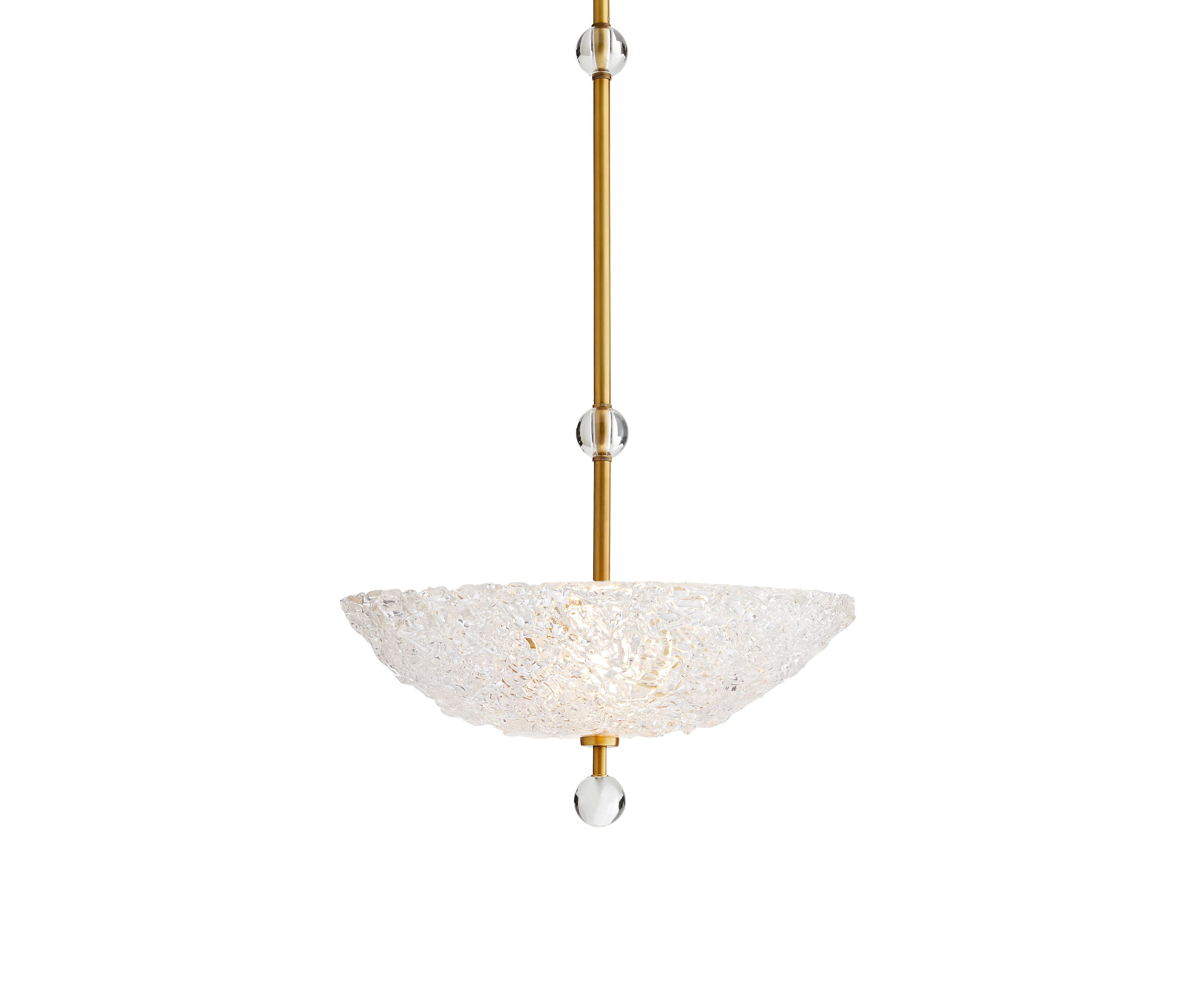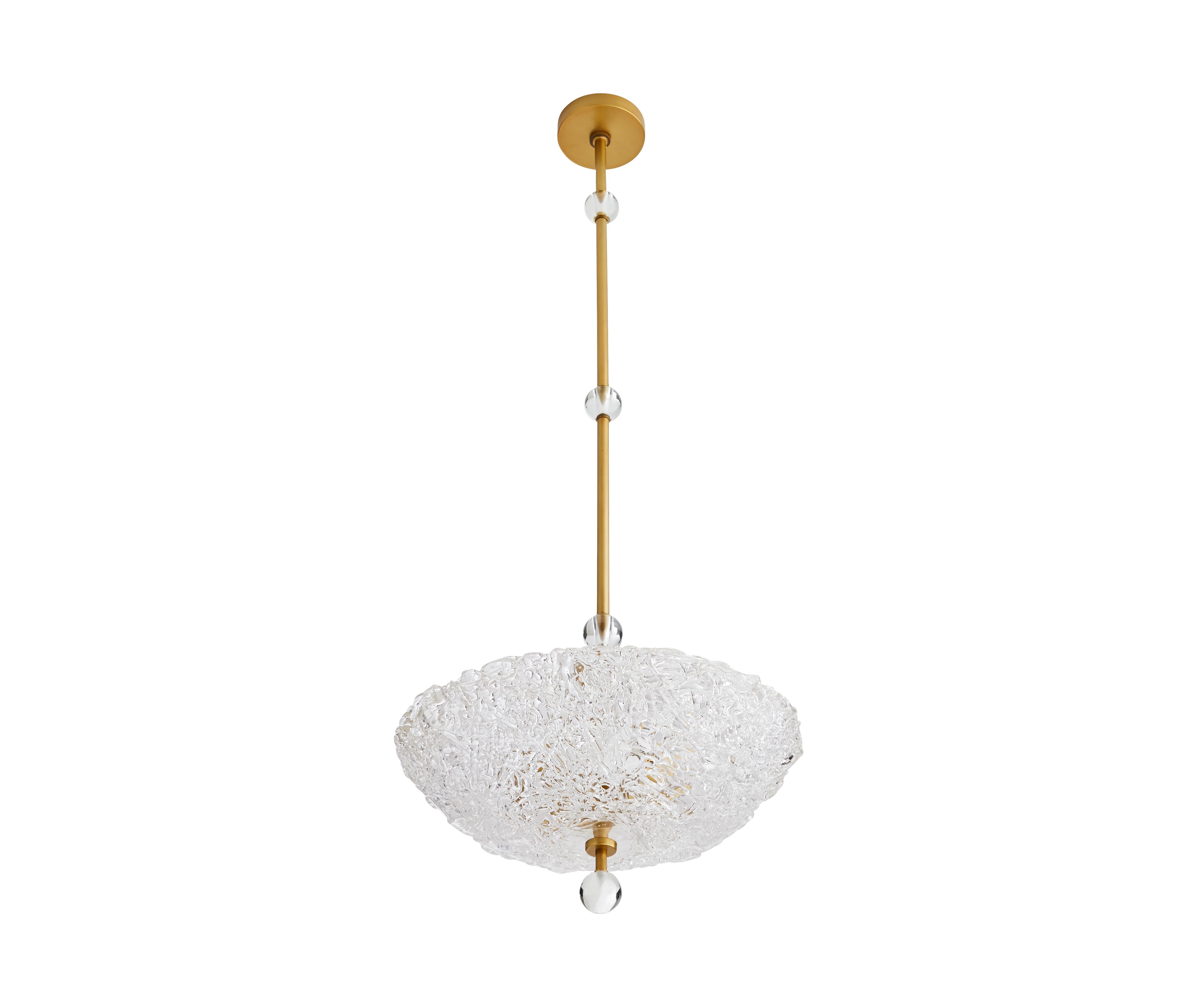 Насладитесь изысканностью, которой обладает эта простая, но изысканная люстра. Стеклянные ремесленники беспорядочно разбрасывают кусочки стекла в форме купола, чтобы создать стеклянную форму спагетти, которая создает шедевр светового пейзажа при каждом его использовании. Съемный хрустальный наконечник с шаром подчеркивает конец стального стержня из античной латуни для дополнительного роскошного прикосновения. Одобрено для использования на крытых уличных площадках.