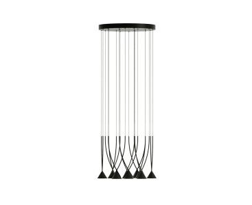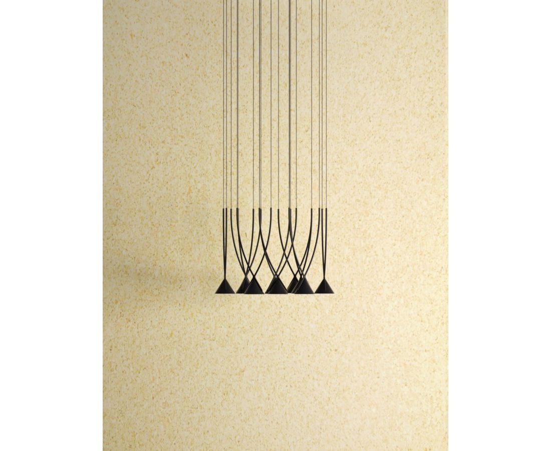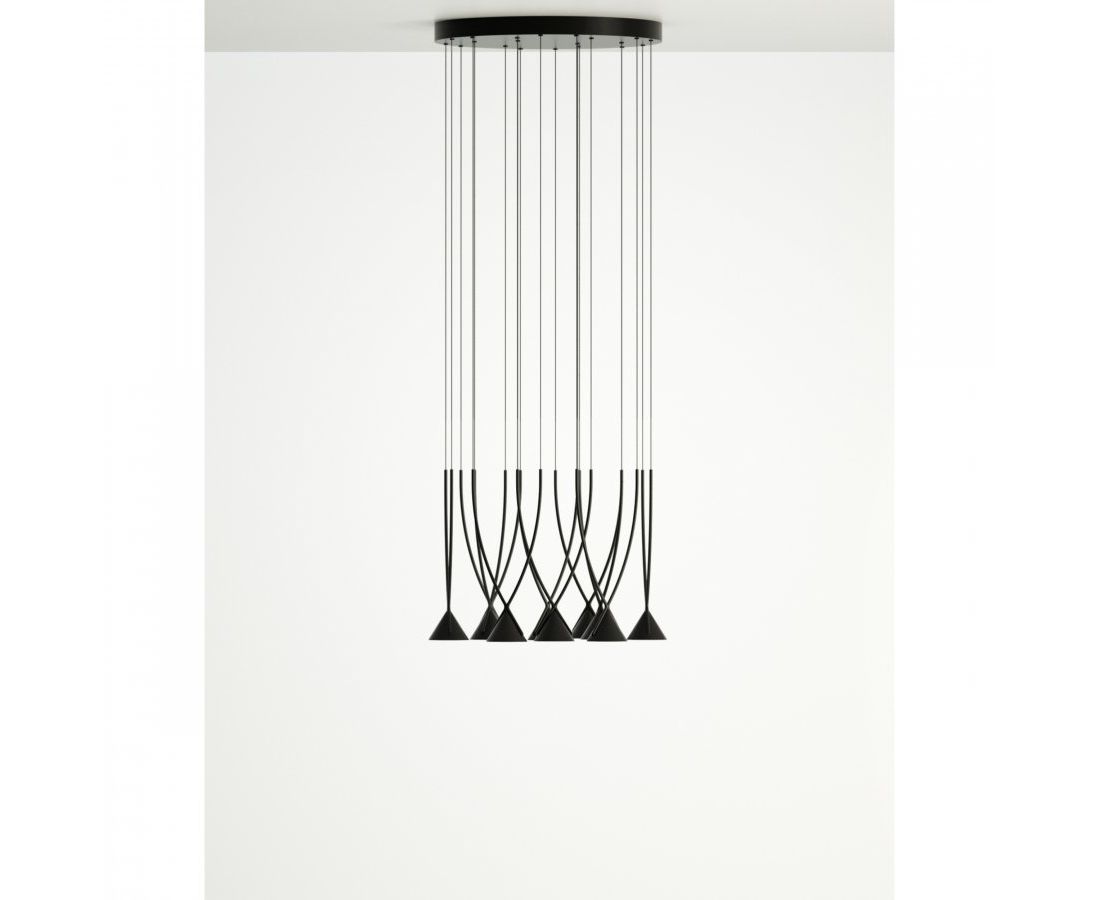 Jewel - это коллекция подвесных светильников, особенностью которых является двойная скрещенная арка, изготовленная из переработанного ABS, которая имеет алюминиевую коническую форму, содержащую светодиодный источник света. Доступны несколько вариантов отделки и четыре версии: один, три, четыре и десять ламп.