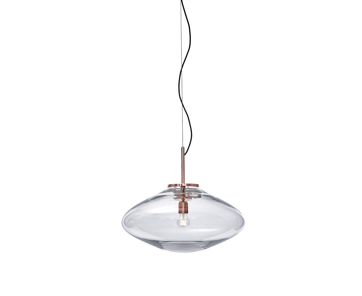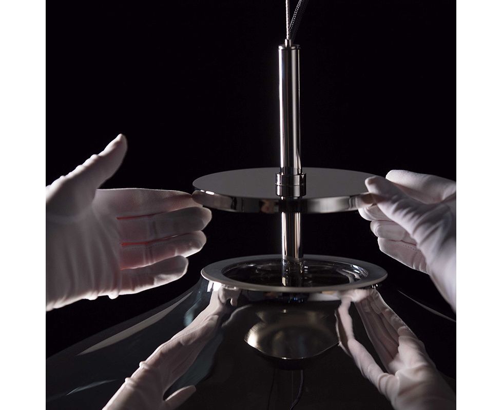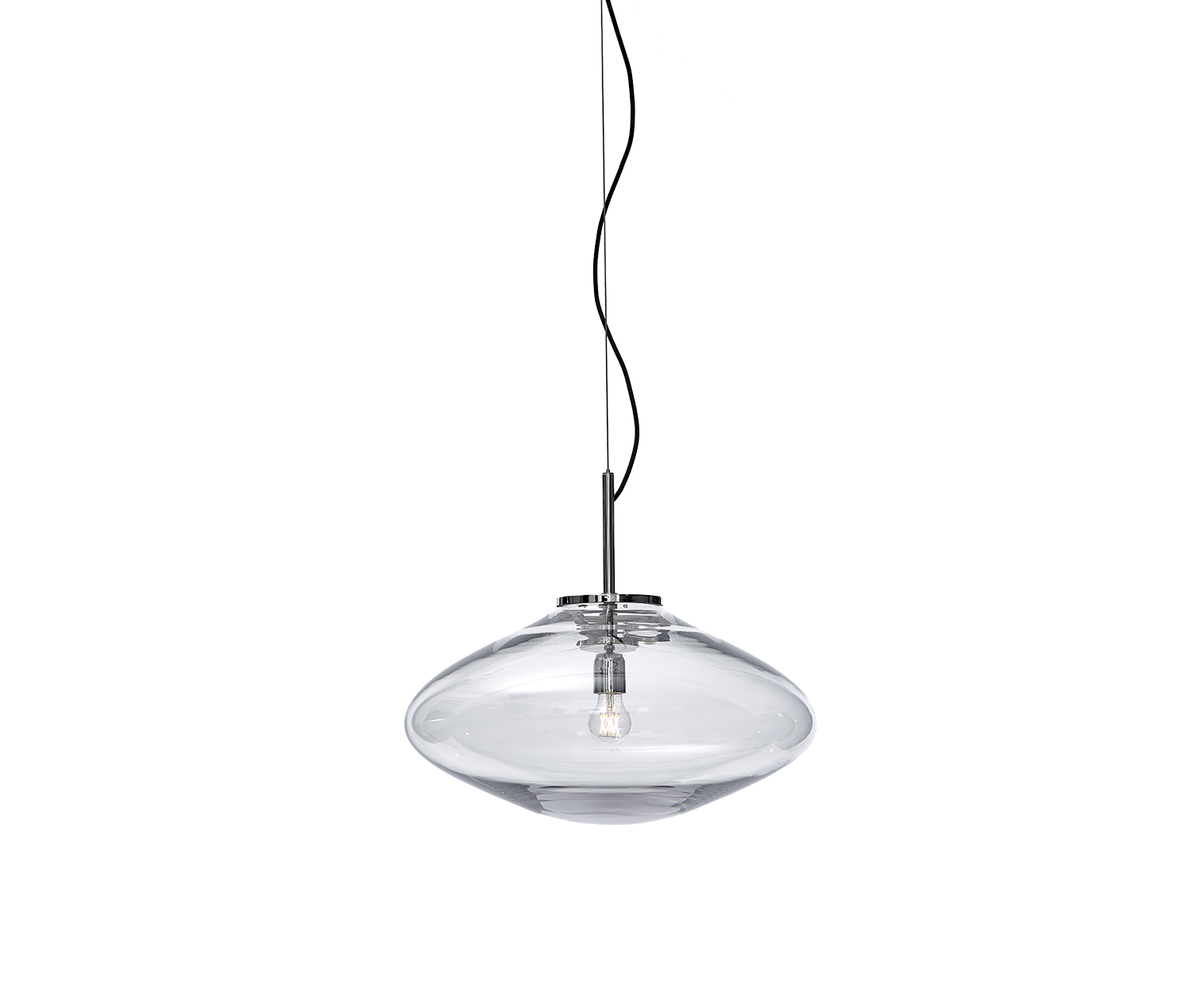 Визит из космоса. Эти светильники переносят идею чрезвычайно больших объемов стекла на новый уровень. Подвески Disc, изготовленные по образцу формы, сочетают в себе хрусталь и металл с минималистичным дизайном, изысканными материалами и точными деталями. Их формы кажутся знакомыми и близкими, блестящие поверхности отражают наш мир в новой перспективе.
